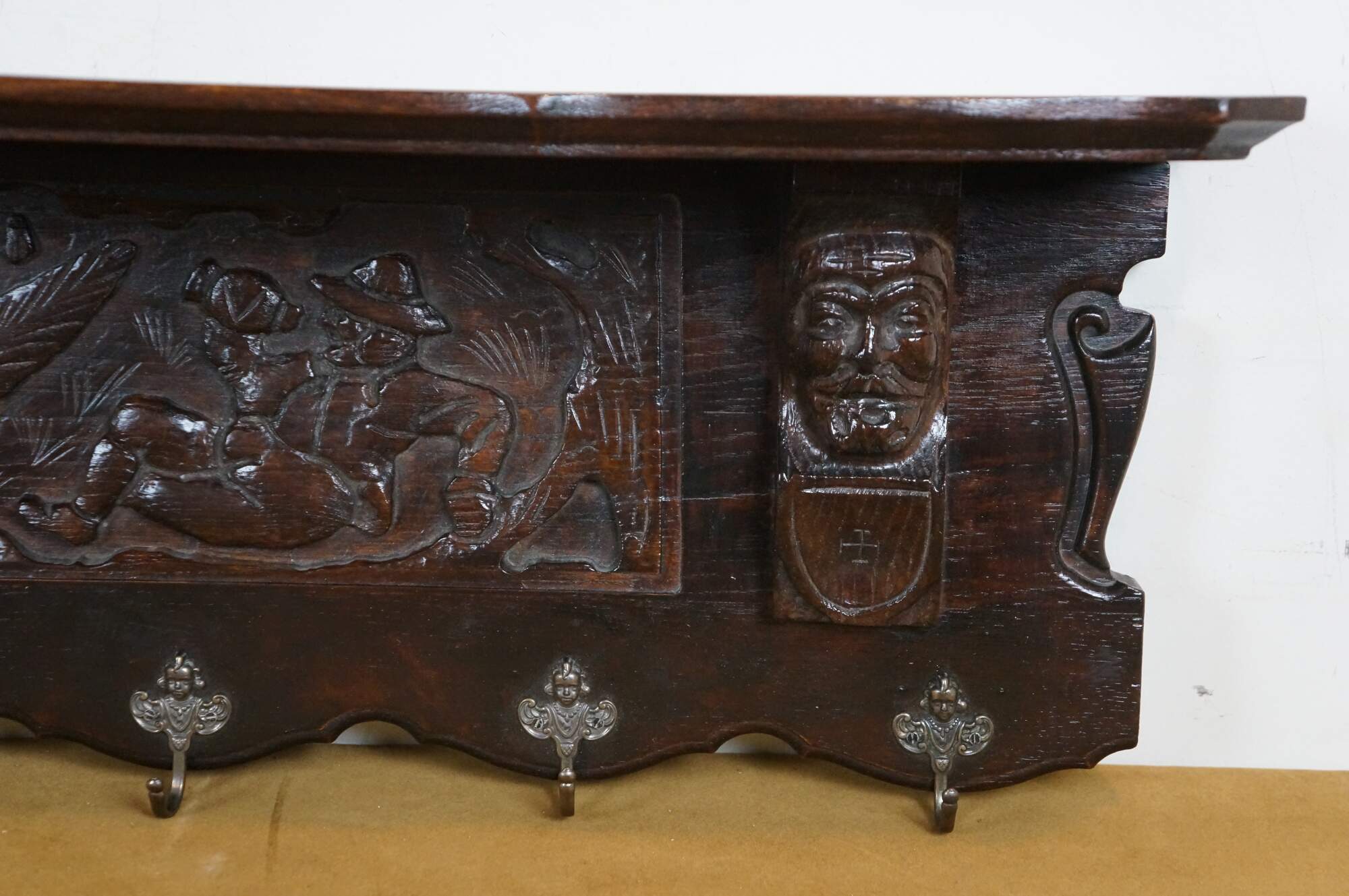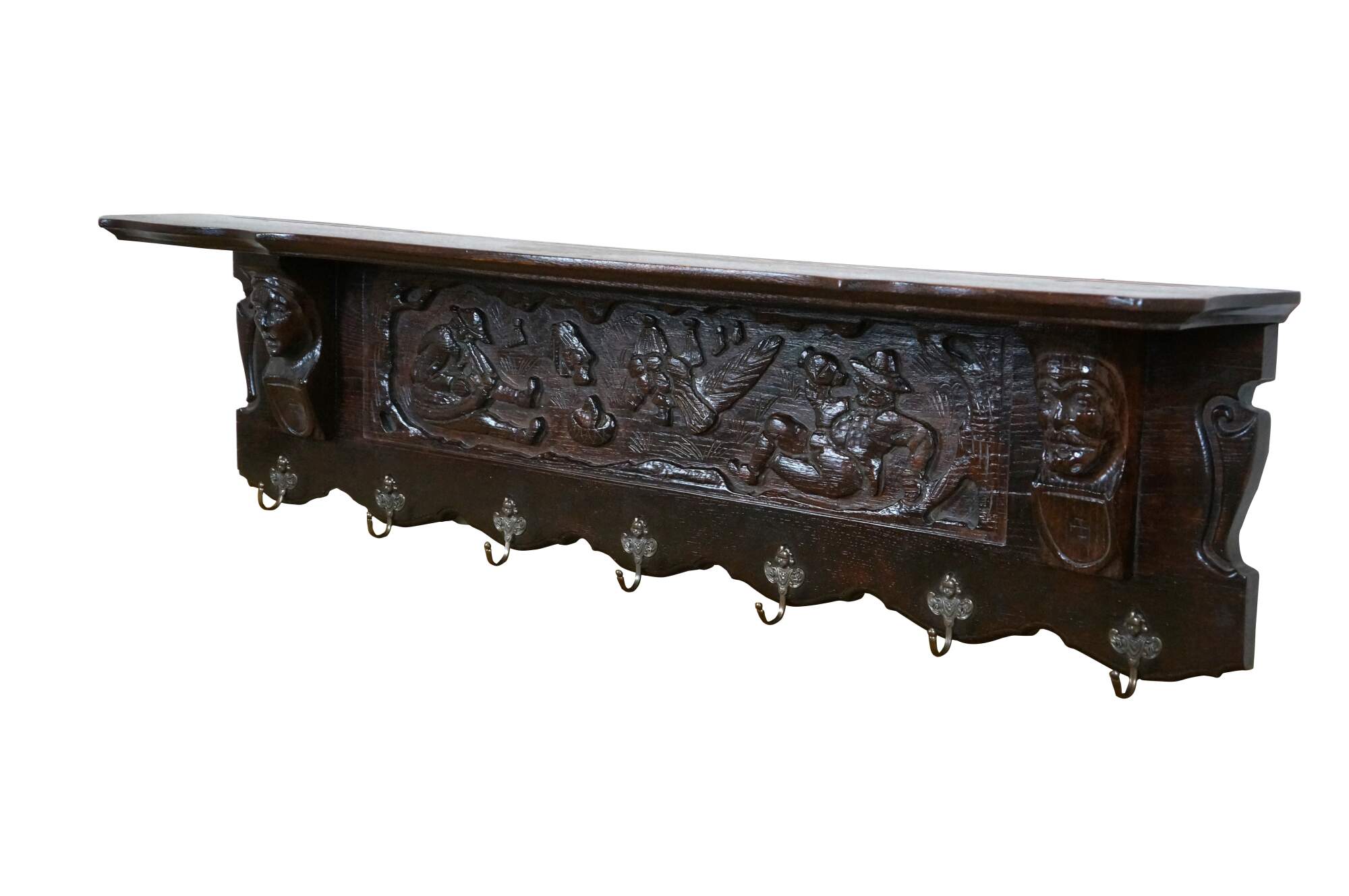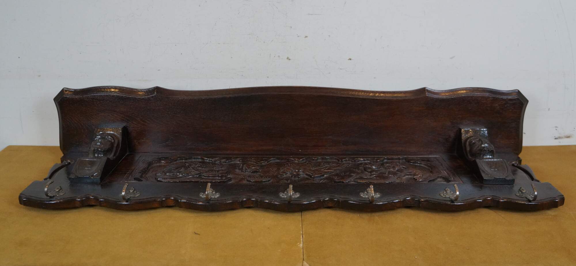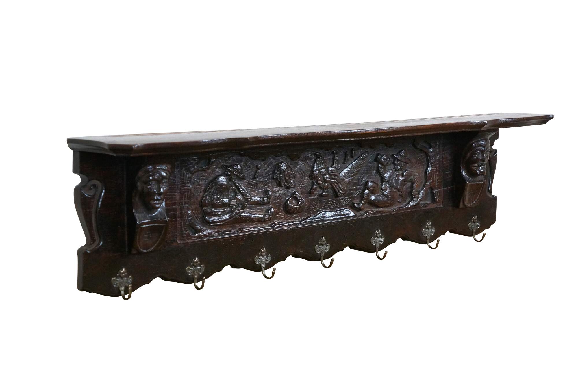 Antique carved wood wall hanging hall tree featuring seven cherub / angel / putti shaped hooks for coats / hats. Carved scene depicts a pair of hunters seated for a rest with a horn and tankard. An upper shelf with groove for displaying plates is supported with a male and female pair of carved busts.