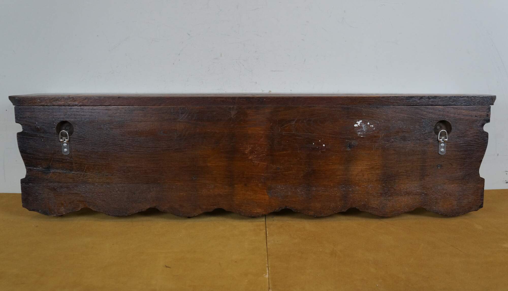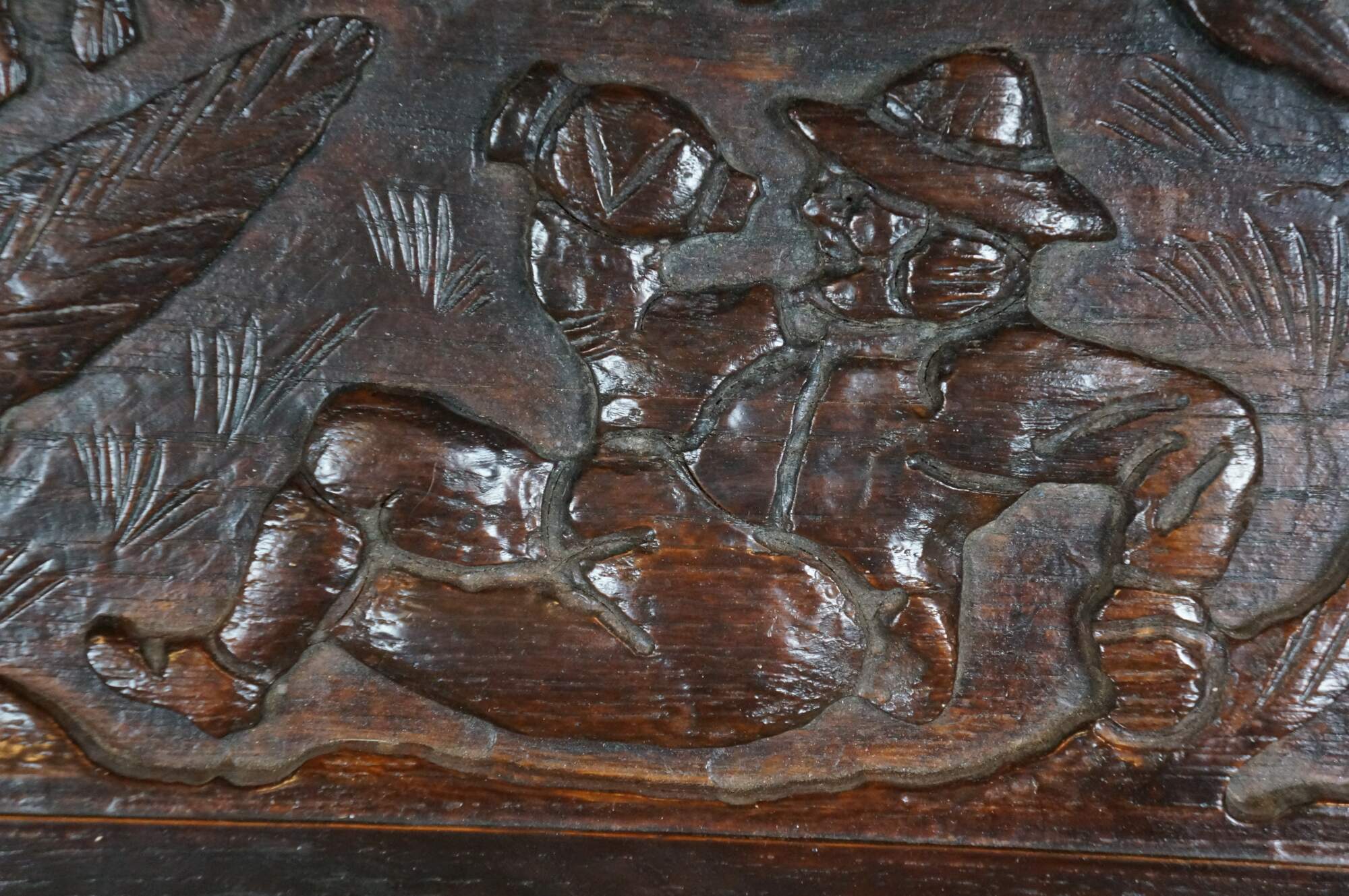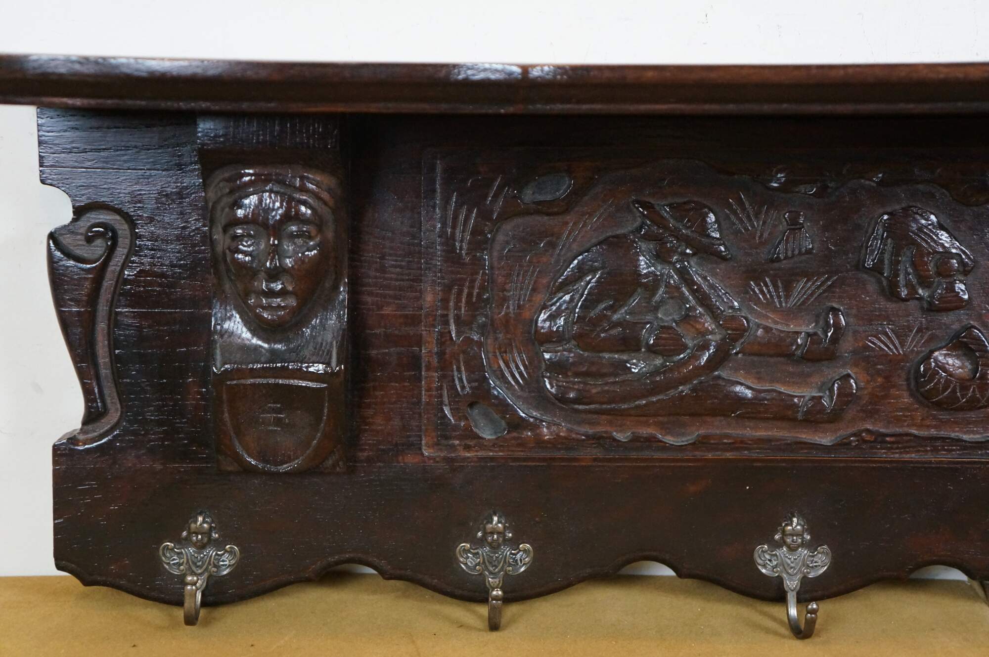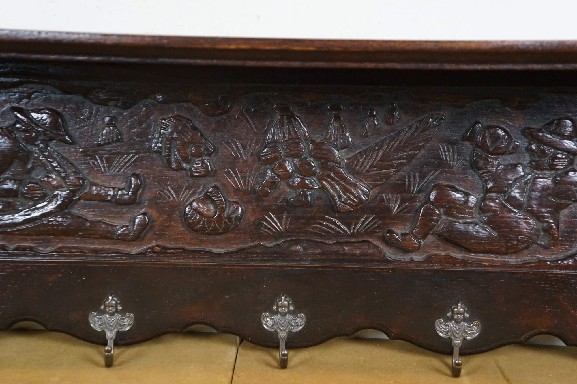 Antique carved wood wall hanging hall tree featuring seven cherub / angel / putti shaped hooks for coats / hats. Carved scene depicts a pair of hunters seated for a rest with a horn and tankard. An upper shelf with groove for displaying plates is supported with a male and female pair of carved busts.