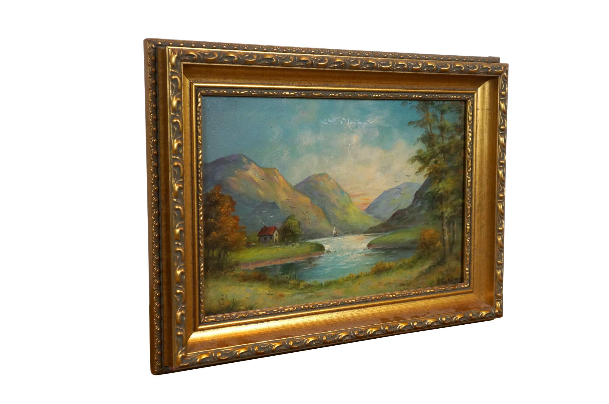 Beautiful antique mid to early 20th century oil painting on board by Gustave Gutgemon, depicting an idyllic landscape featuring a cottage by a lake at the foot of a range of mountains. Signed in lower right. Artists studio label on reverse. Beveled and foliate carved giltwood frame.