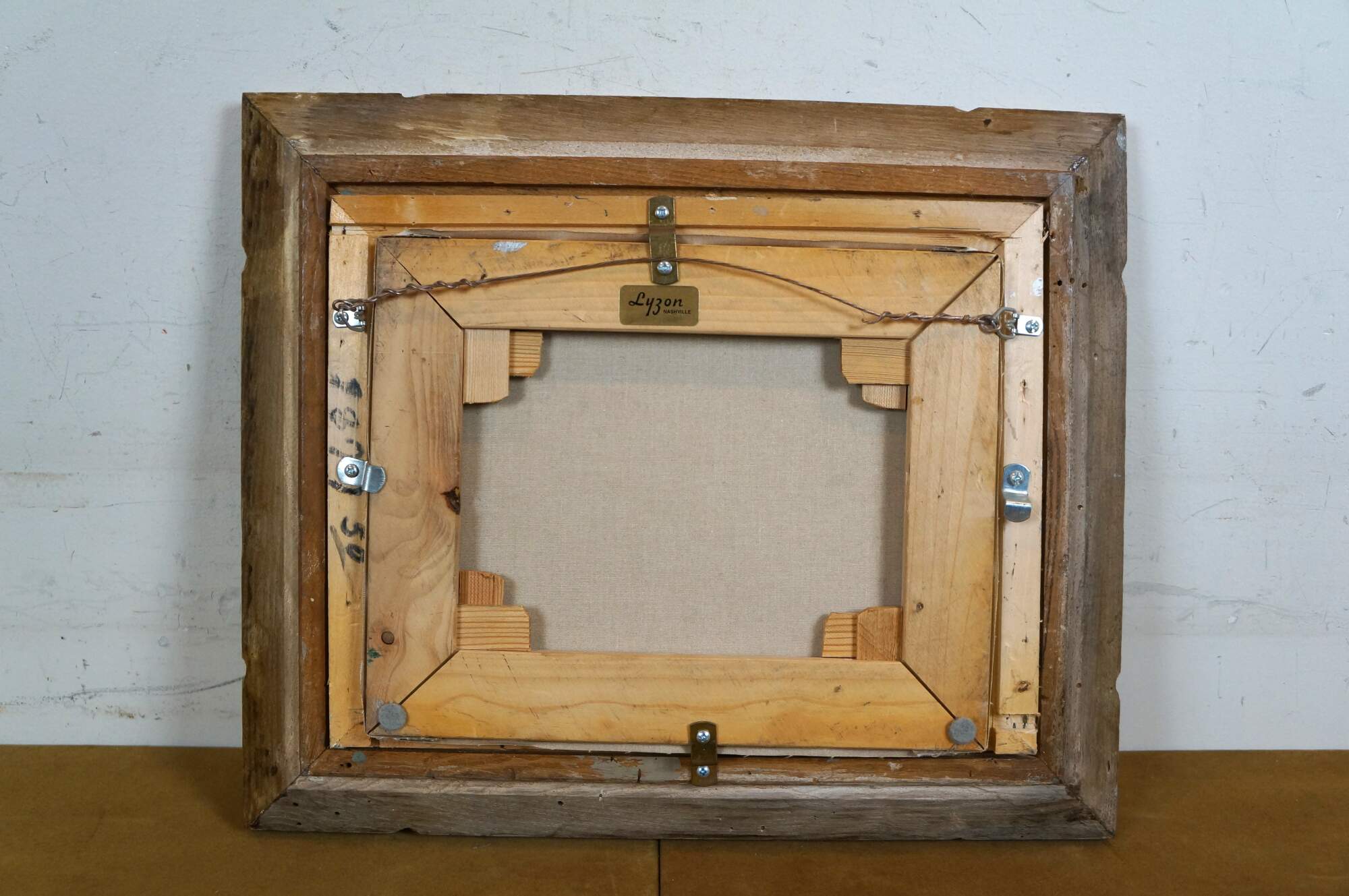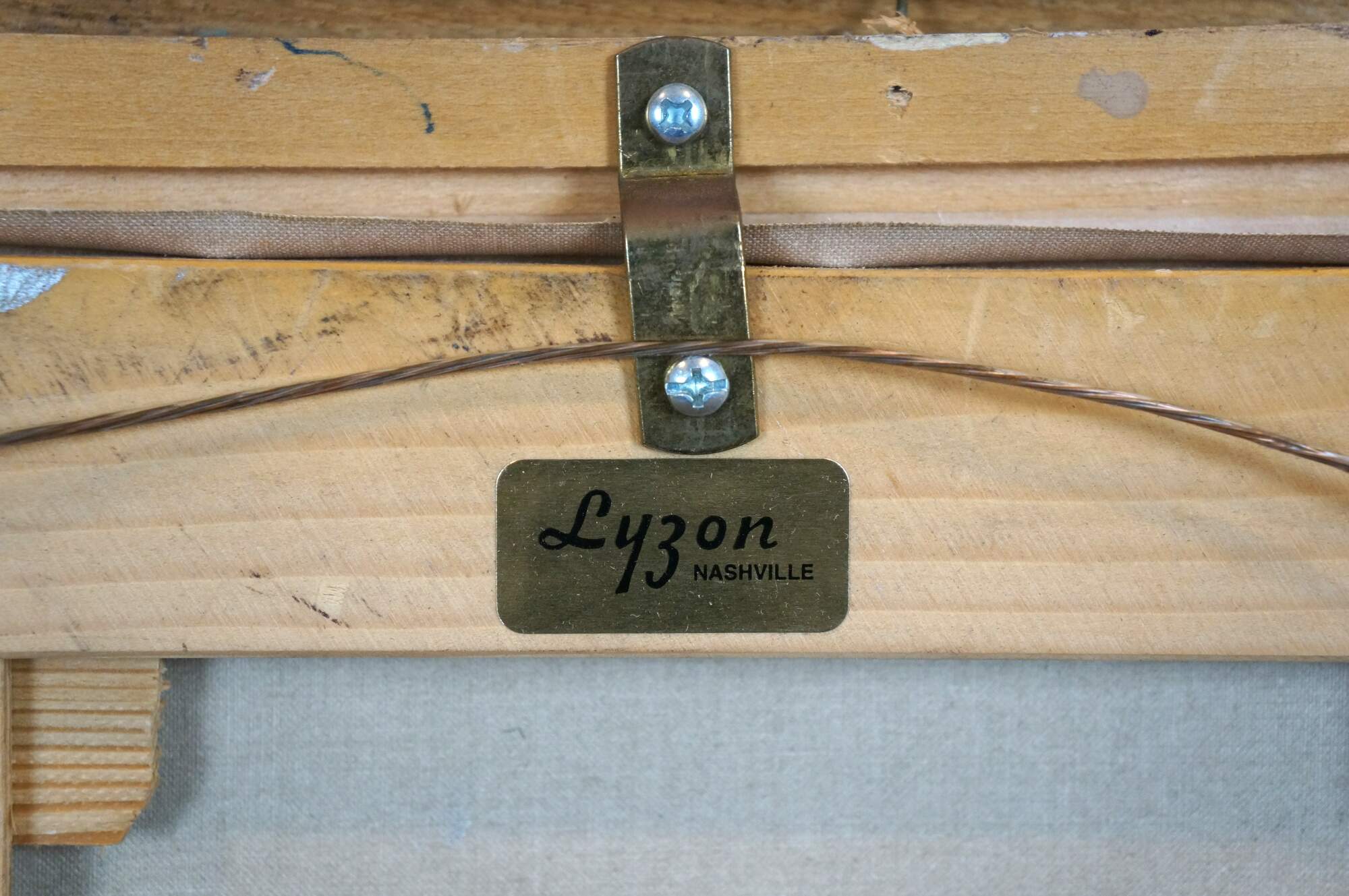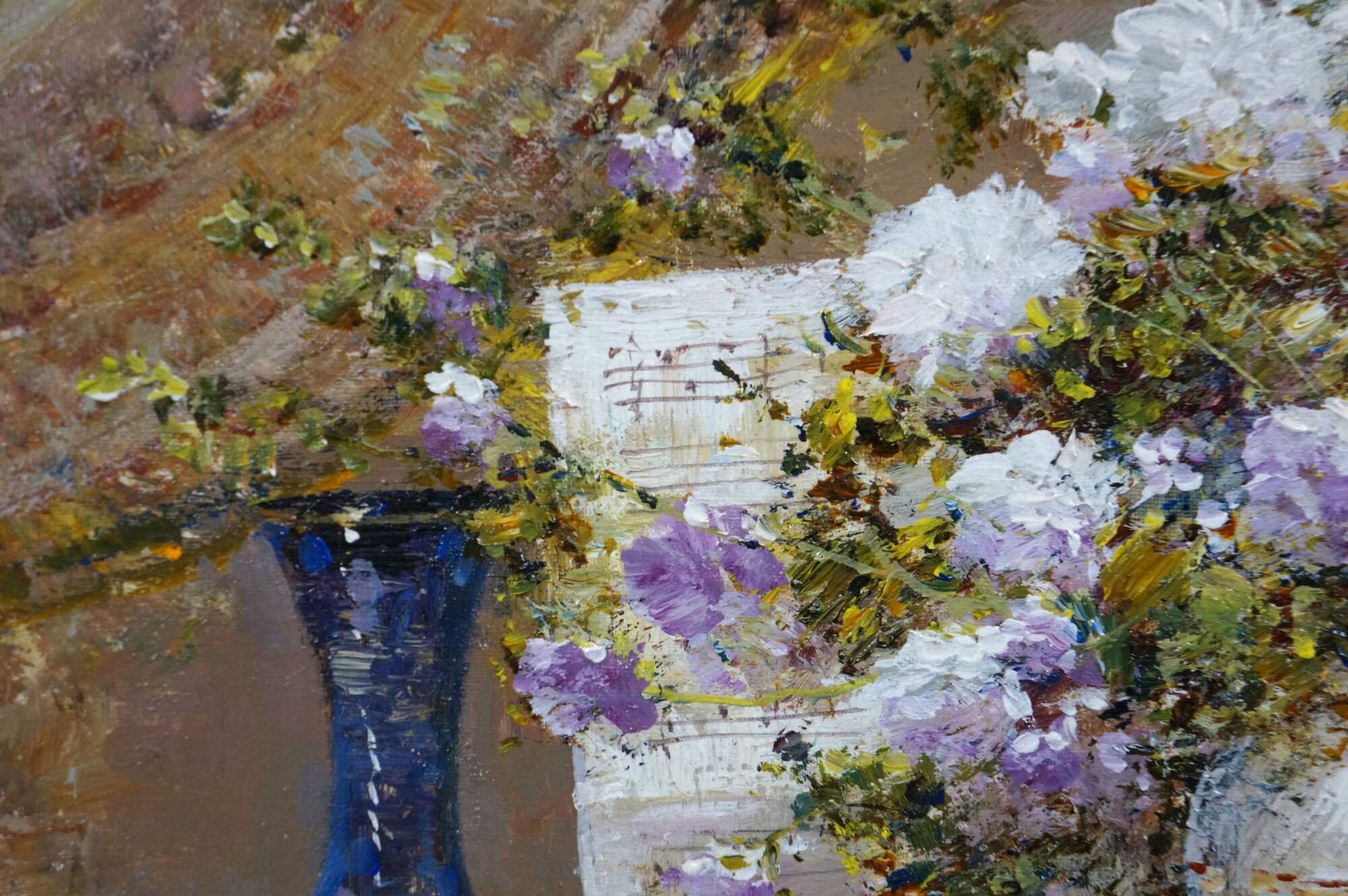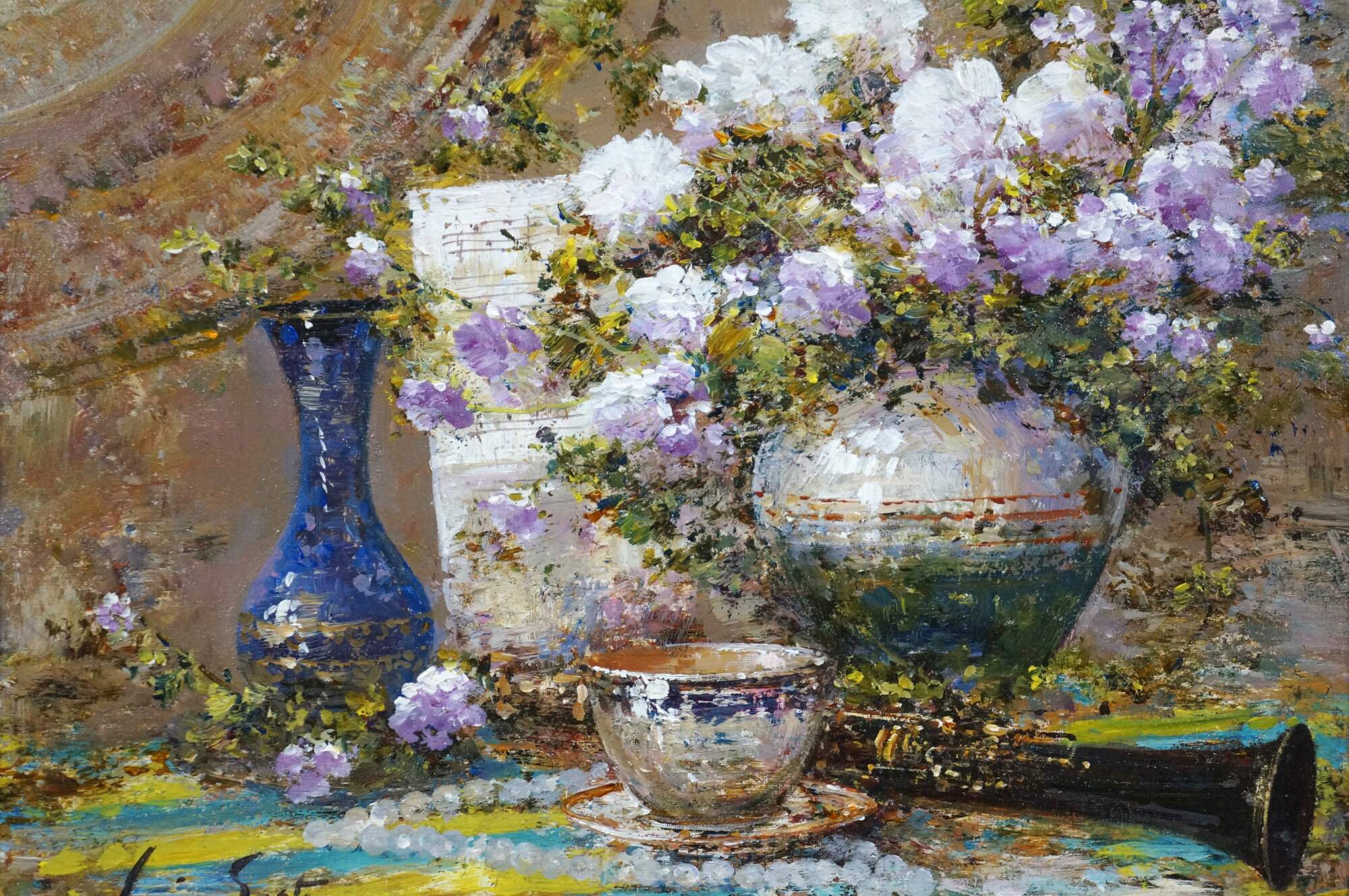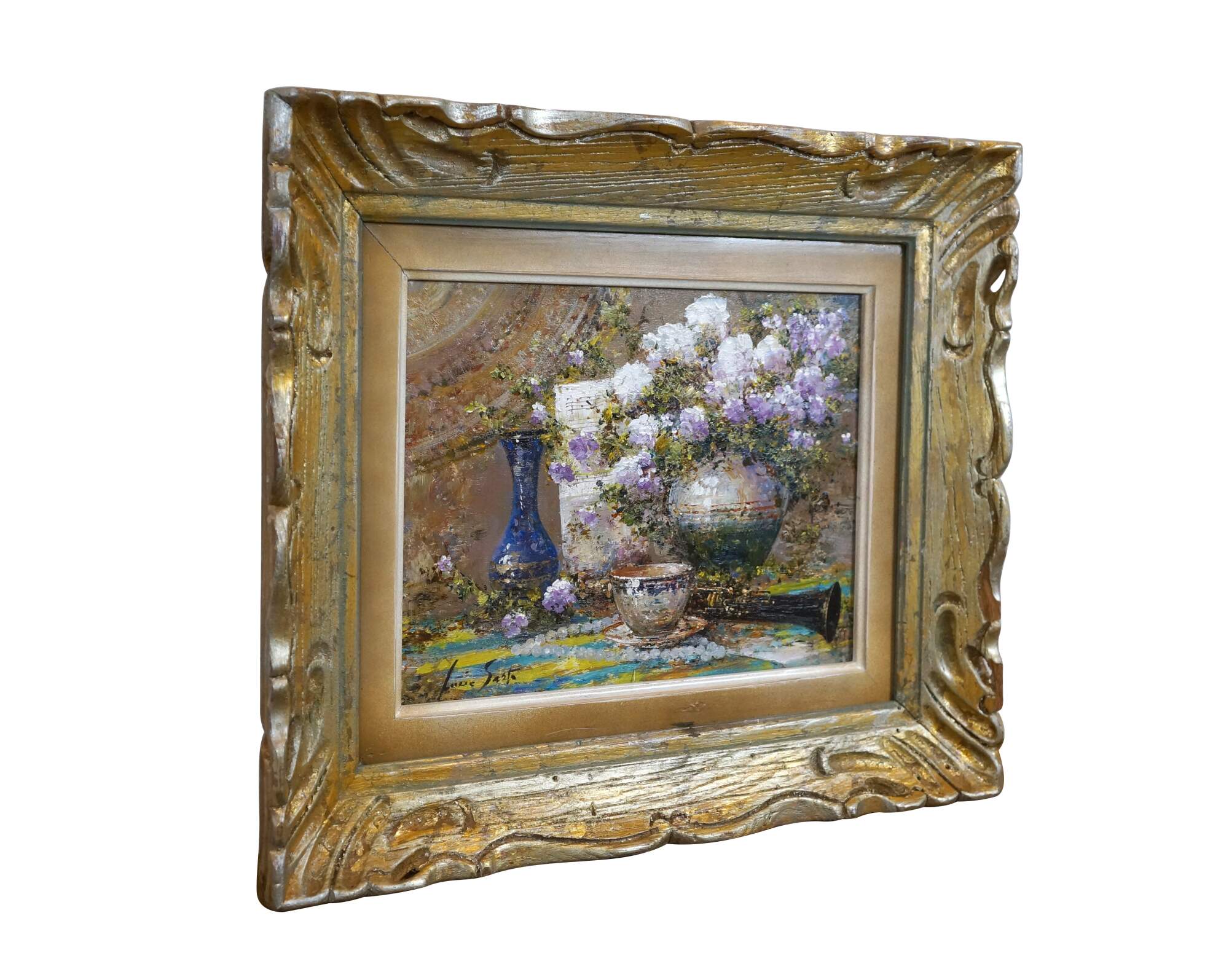 Vintage Lucia Sarto impressionist still life oil painting on canvas depicting a vase of lilacs on a table with pearls, a teacup, blue vase, sheet music and a clarinet. Signed in lower left corner. Carved / beveled champagne giltwood frame.