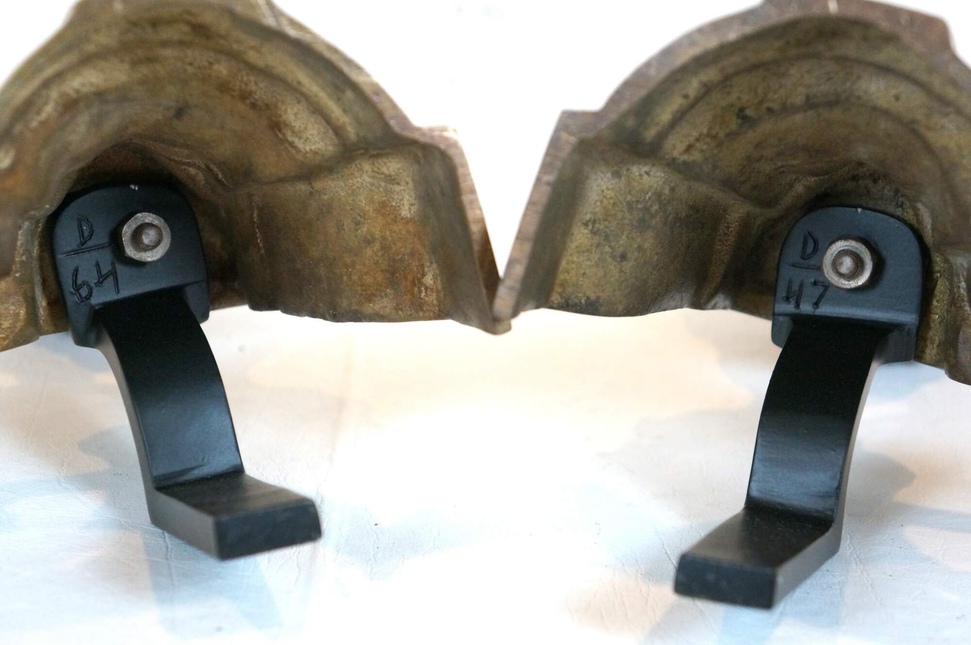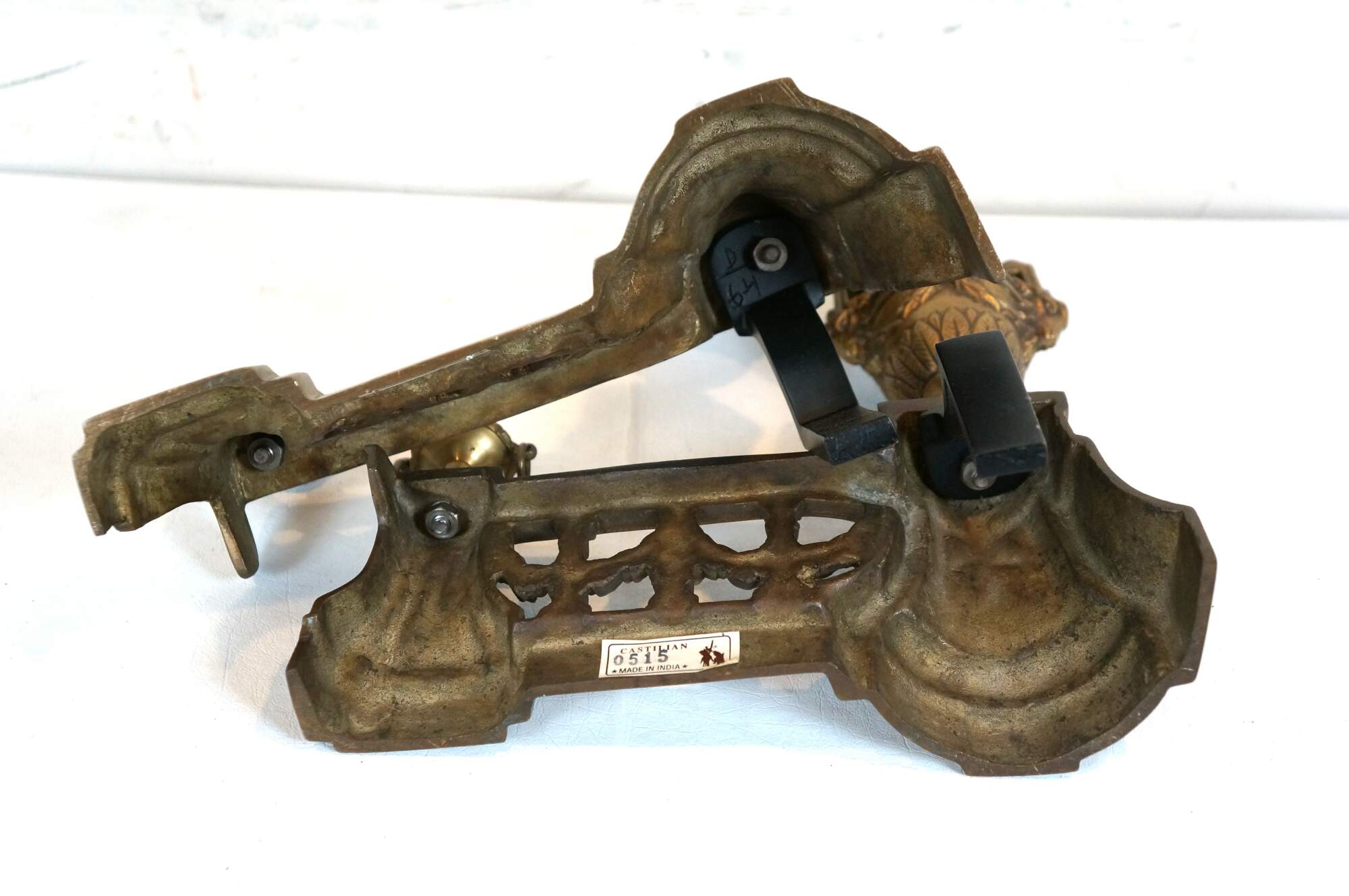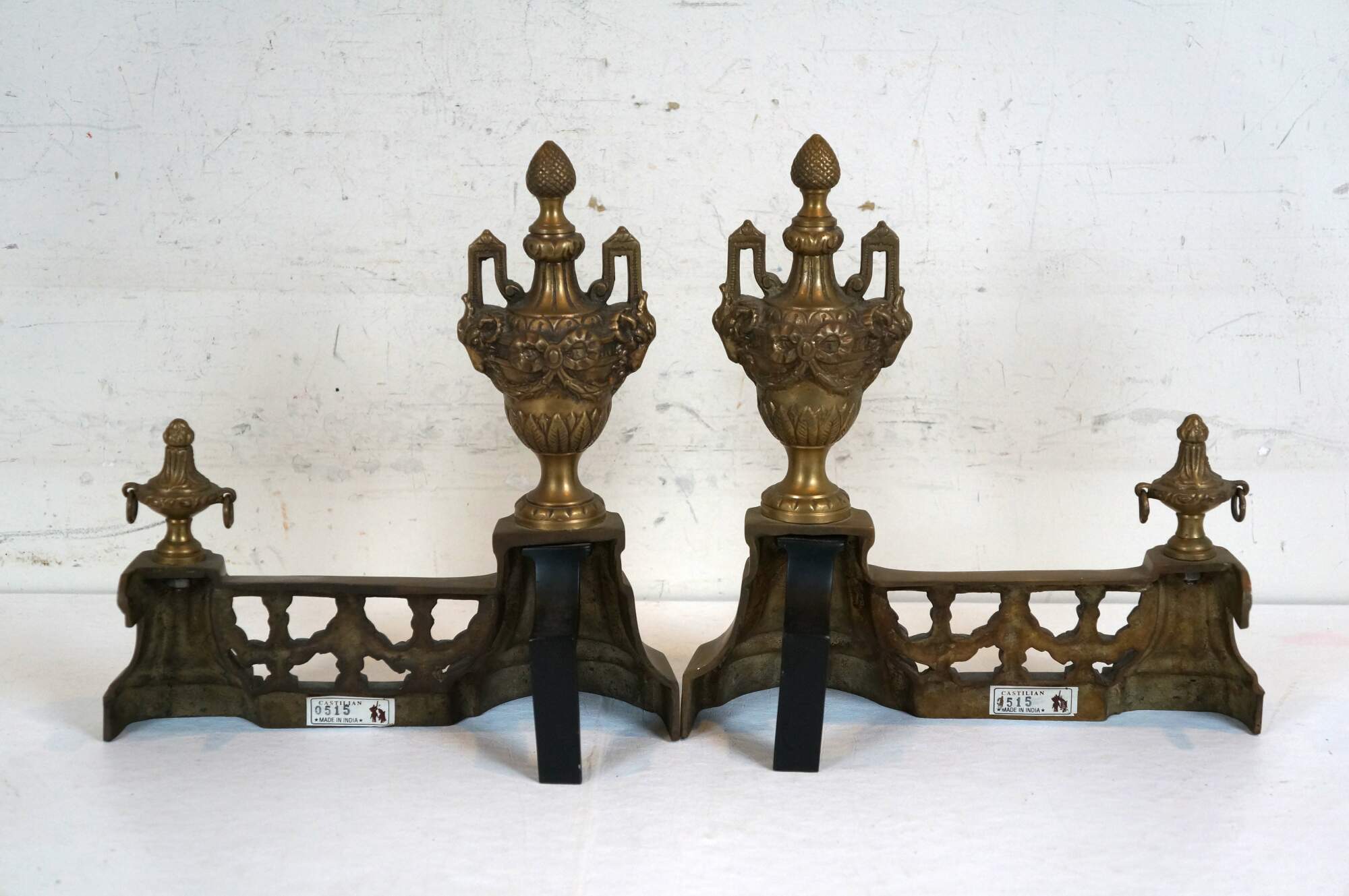 Vintage Castilian Imports number 0515 brass andirons / fire dogs / chenets / fender. French Louis XVI and Neoclasssical inspired design features trophy urns with pineapple finials, wrapped in ribbon and foliate festoon swags. Made in India.