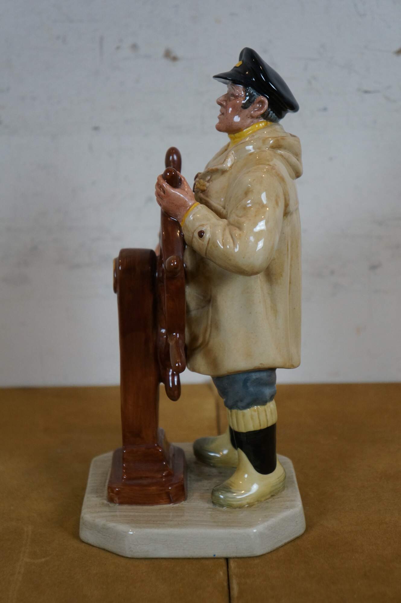 Vintage 1973 Royal Doulton porcelain figurine number HN 2499 titled The Helmsman, depicting a sailor in yellow oilskin jacket and boots, stationed at a ship's helm.