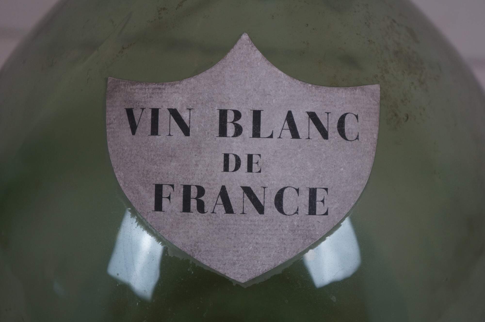 Early 20th century balloon shaped French demijohn / wine bottle / jug. Green glass with shield shaped paper label reading "Vin Blanc de France.