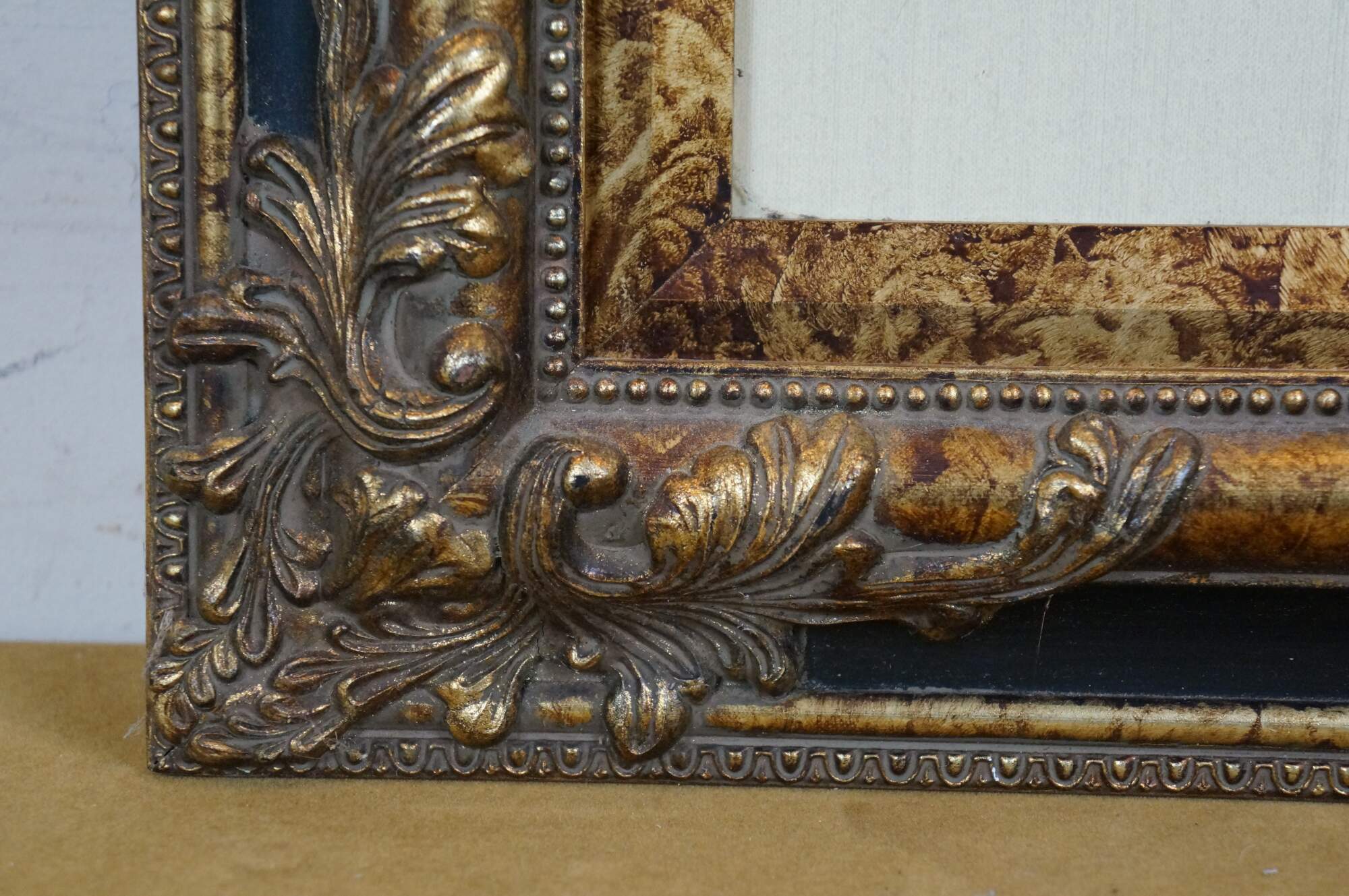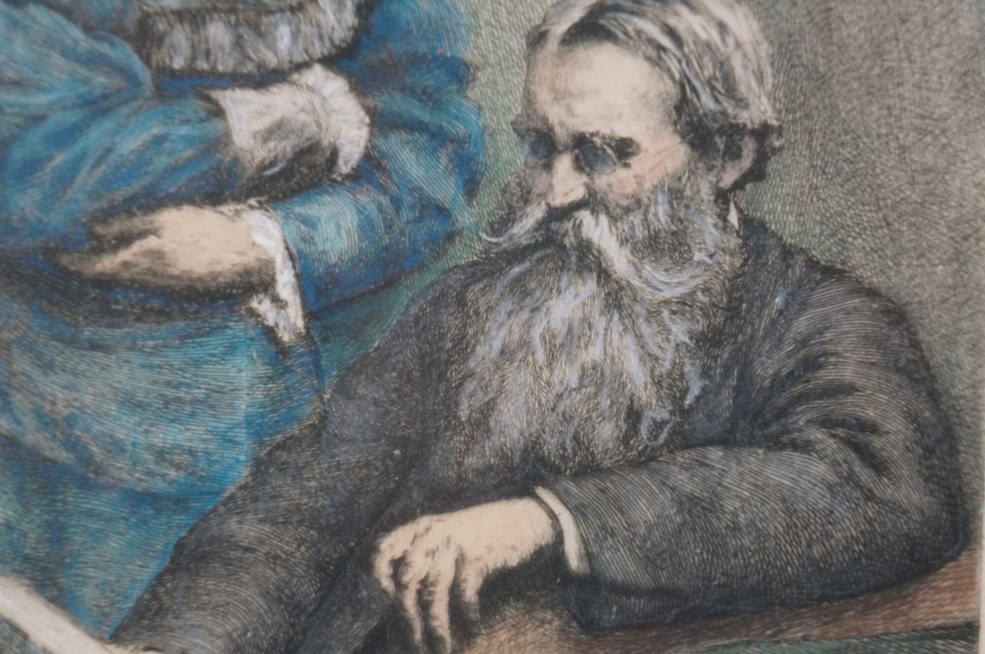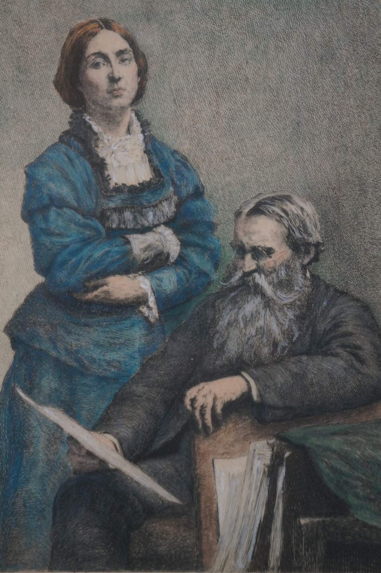 Antique late 19th century hand colored etching of a Portrait of Mr and Mrs Edwin Edwards, engraved by Louis Monzies after a painting by Henri Fantin; taken from the 1883 portfolio "L'Art." Carved gilt wood frame with acanthus leaf corners and black painted bevel; no mat.