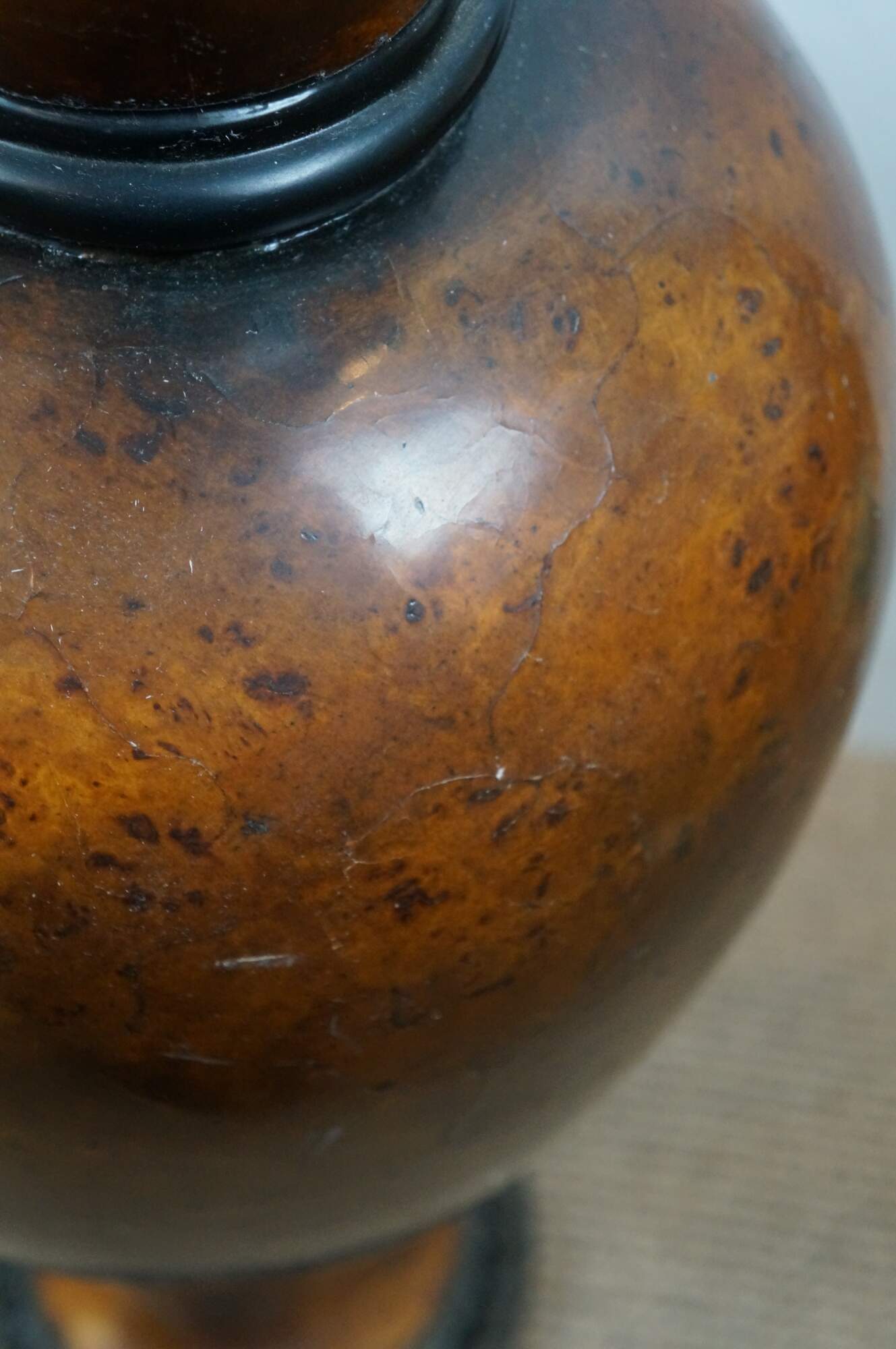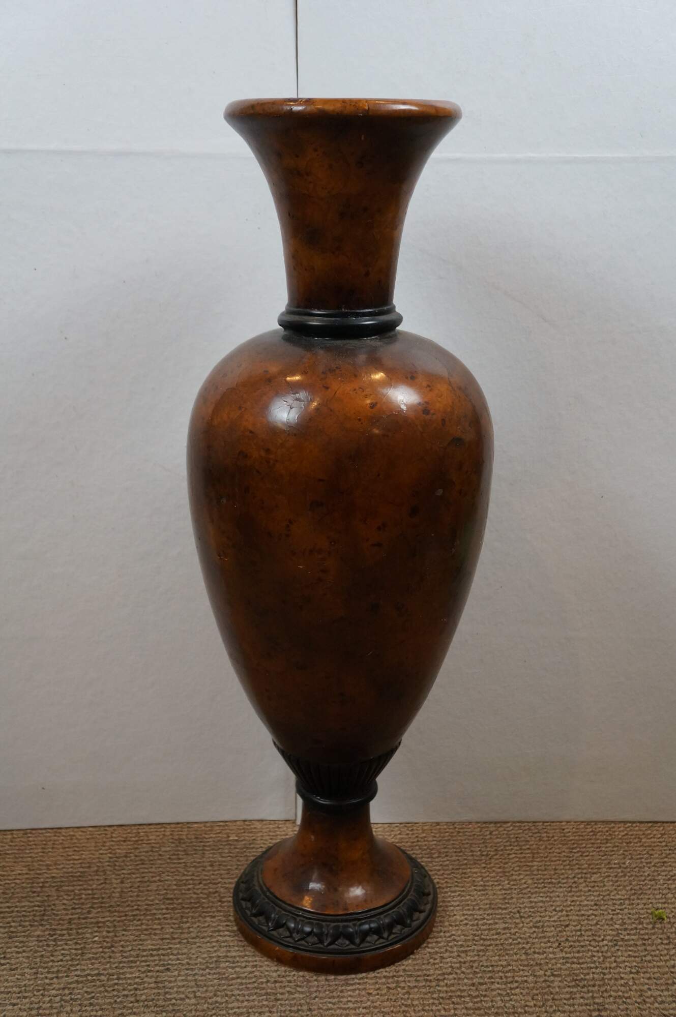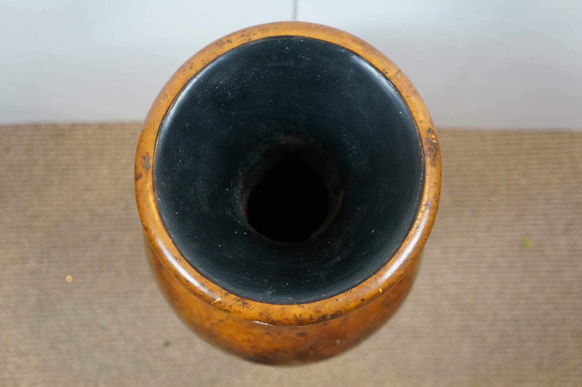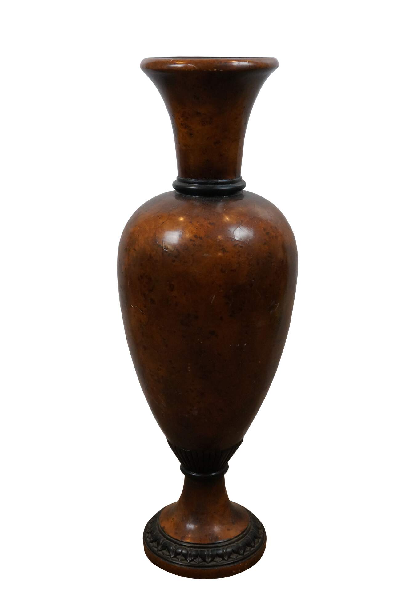 Late 20th century burl wood veneer floor vase / urn with ebonized details and leaf carved border. Leather padded base.