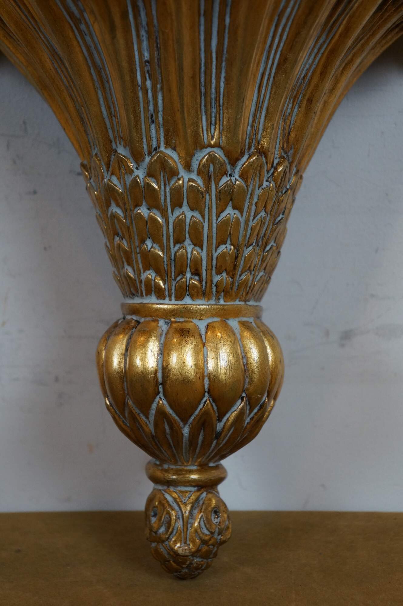 Pair of early 21st century gilt composite wall brackets / sconces / shelves, featuring tapered torch shaped bases with a pineapple and acanthus leaf motif, with a scalloped edge demilune / half round top.