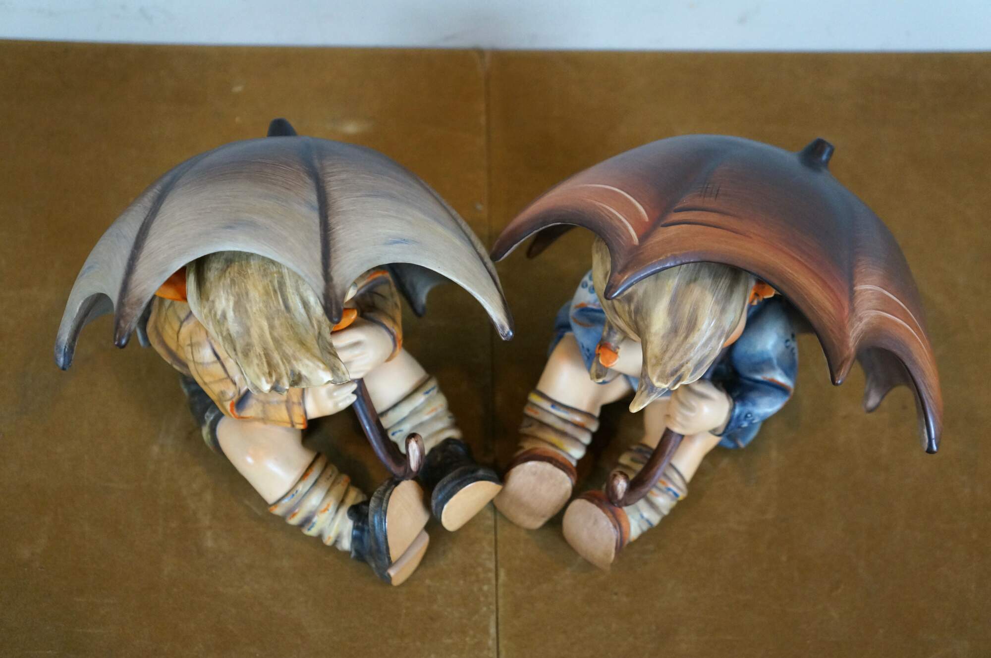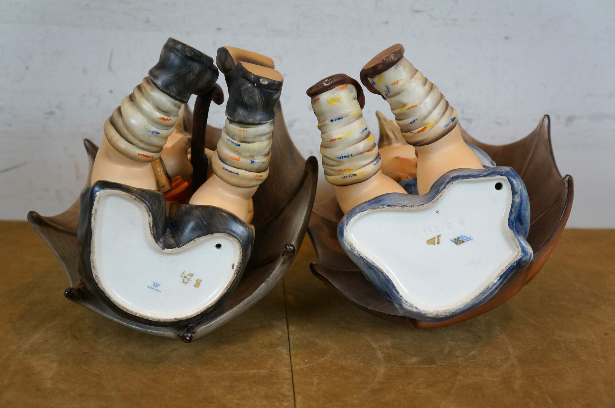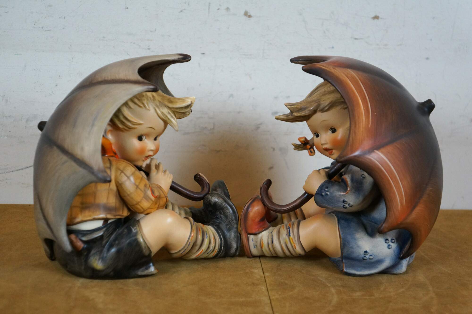 Pair of 1960's Umbrella Boy and Umbrella Girl Goebel / MI Hummel porcelain figurines, depicting a young boy and girl seated under oversized umbrellas. Umbrella Boy - 152A incised mark - TMK-3 Stylized Bee printed mark (circa 1960-1972). Umbrella Girl - 152/IIB / 1951 / 32 incised marks - TMK-4 Three Line printed mark (circa 1964-1972).