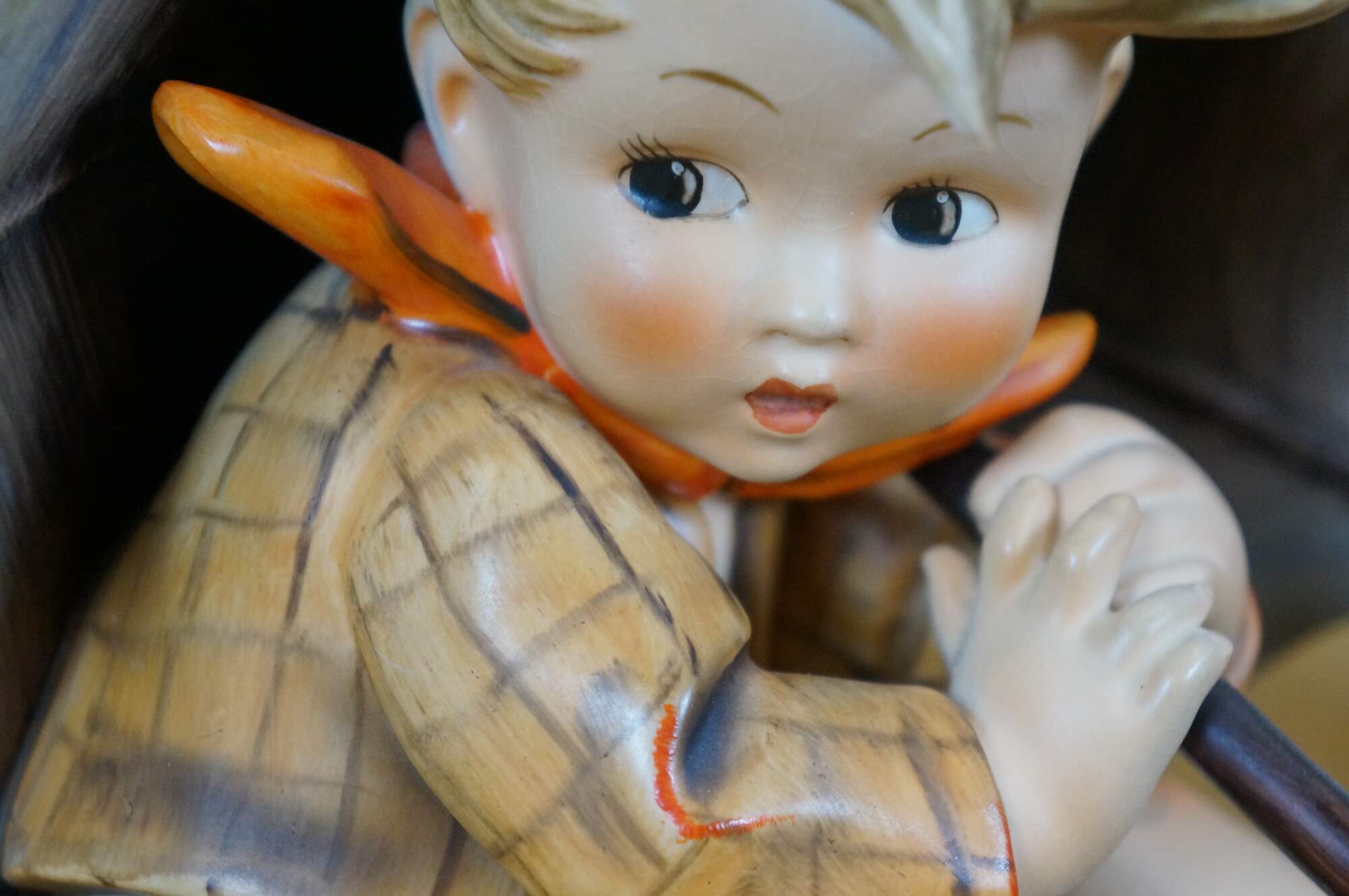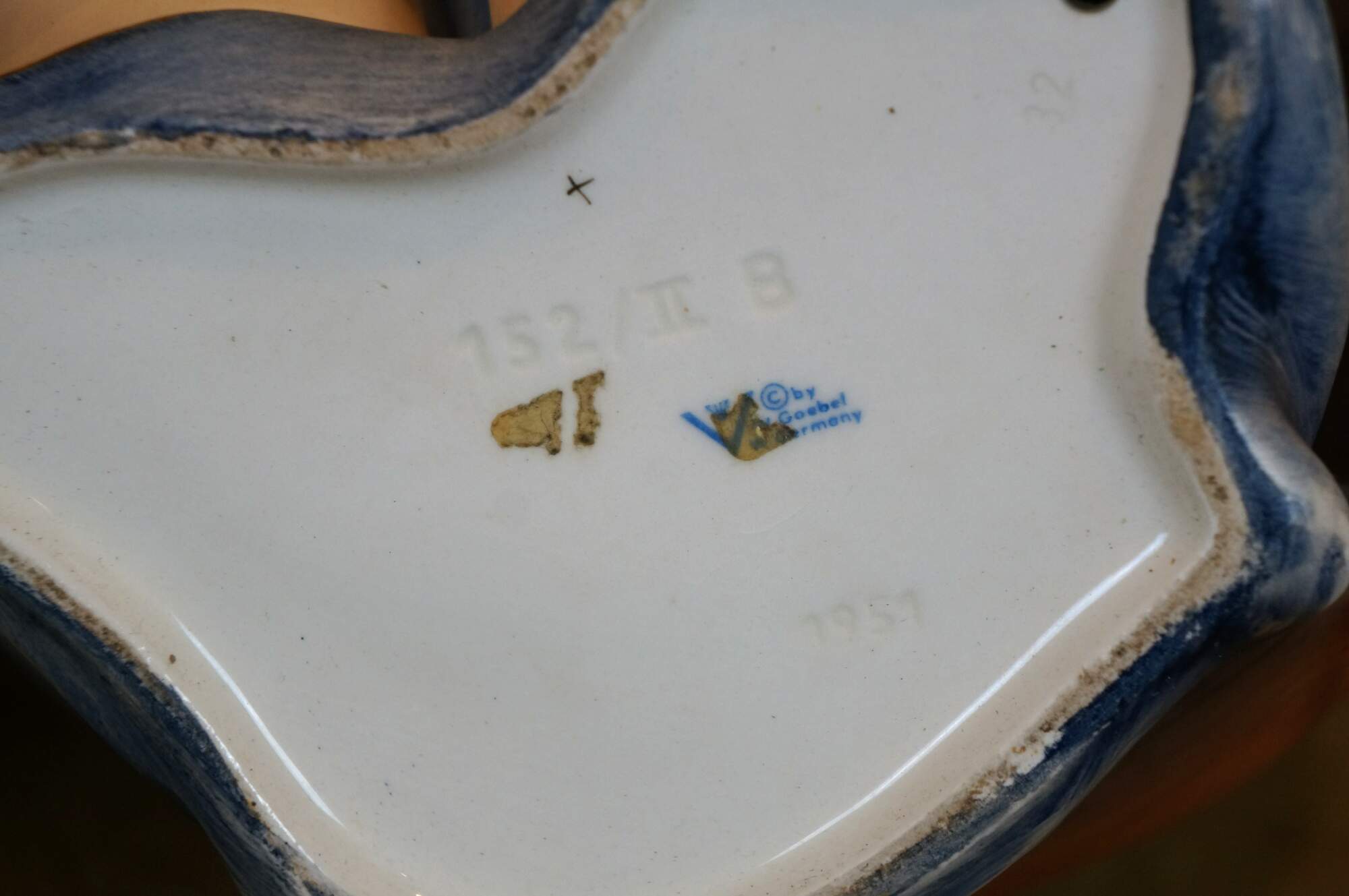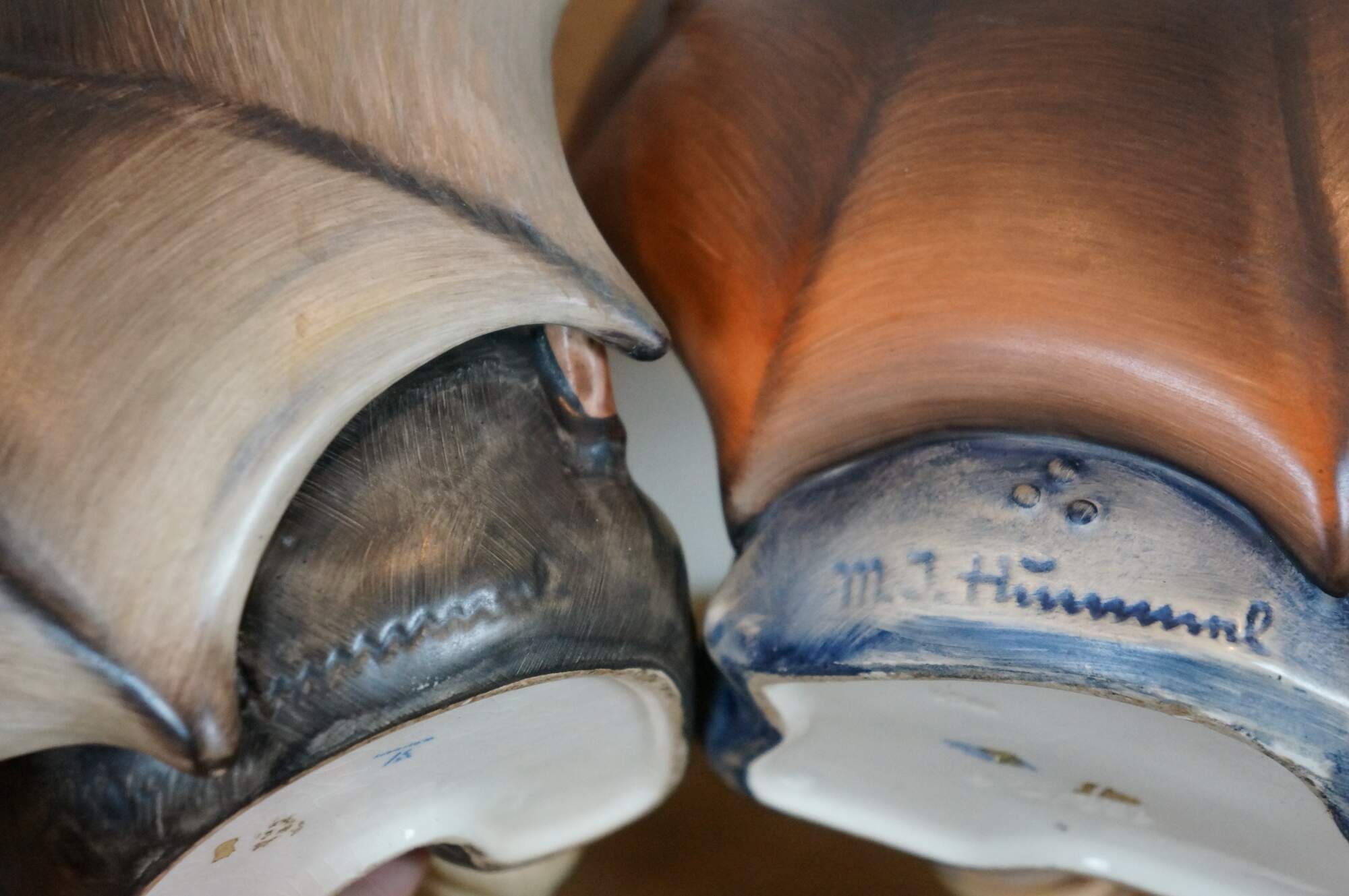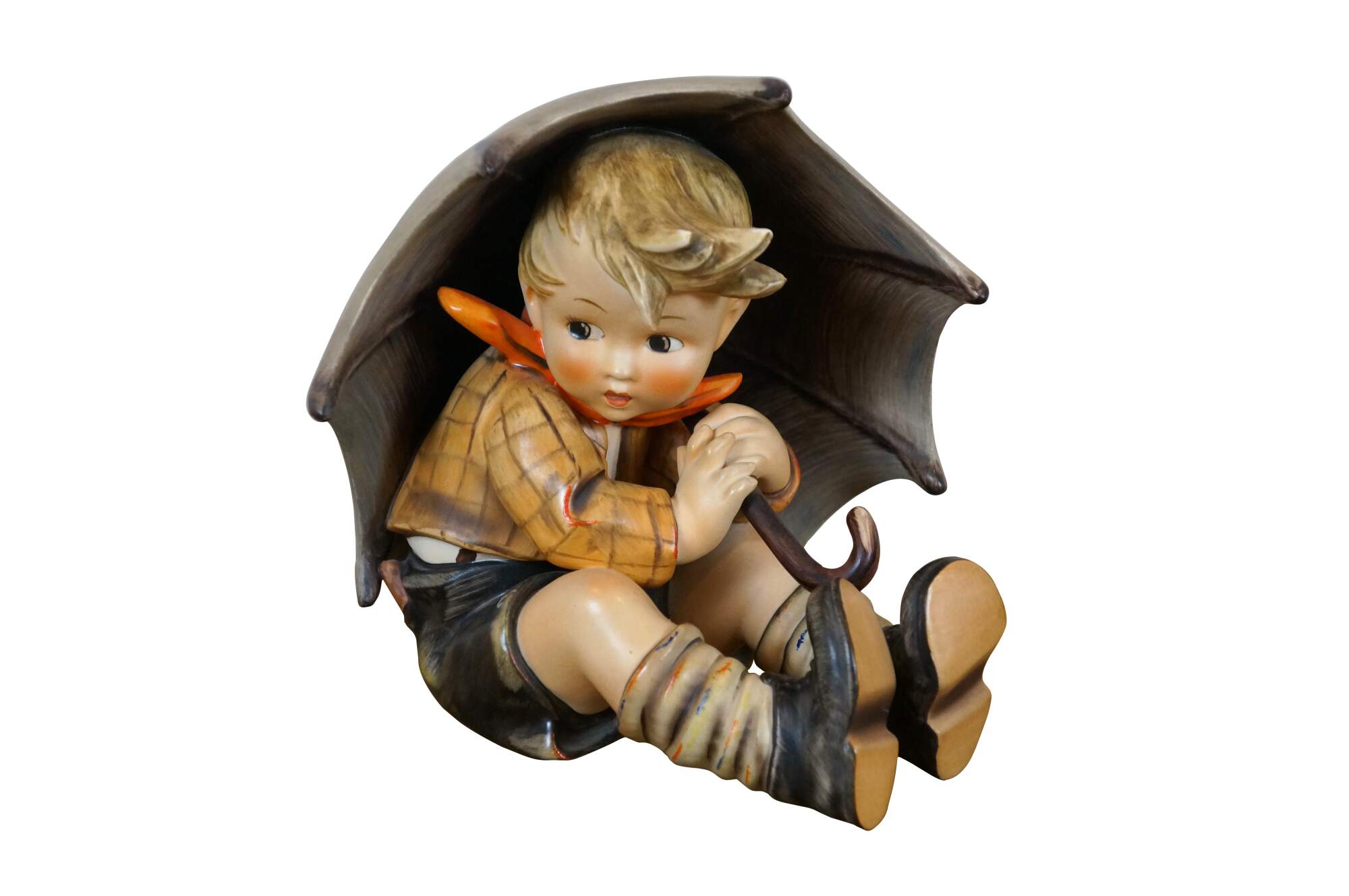 Pair of 1960's Umbrella Boy and Umbrella Girl Goebel / MI Hummel porcelain figurines, depicting a young boy and girl seated under oversized umbrellas. Umbrella Boy - 152A incised mark - TMK-3 Stylized Bee printed mark (circa 1960-1972). Umbrella Girl - 152/IIB / 1951 / 32 incised marks - TMK-4 Three Line printed mark (circa 1964-1972).