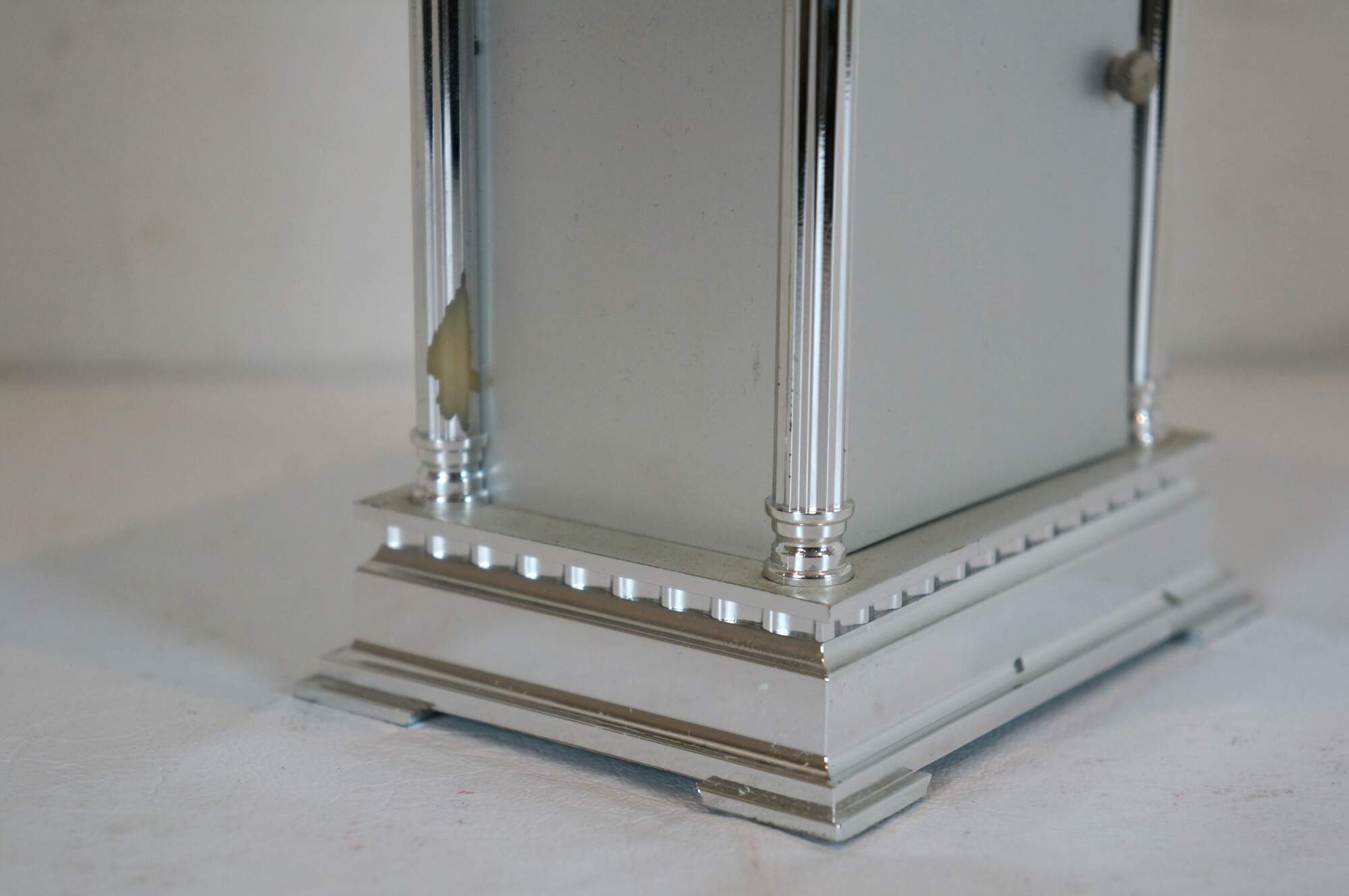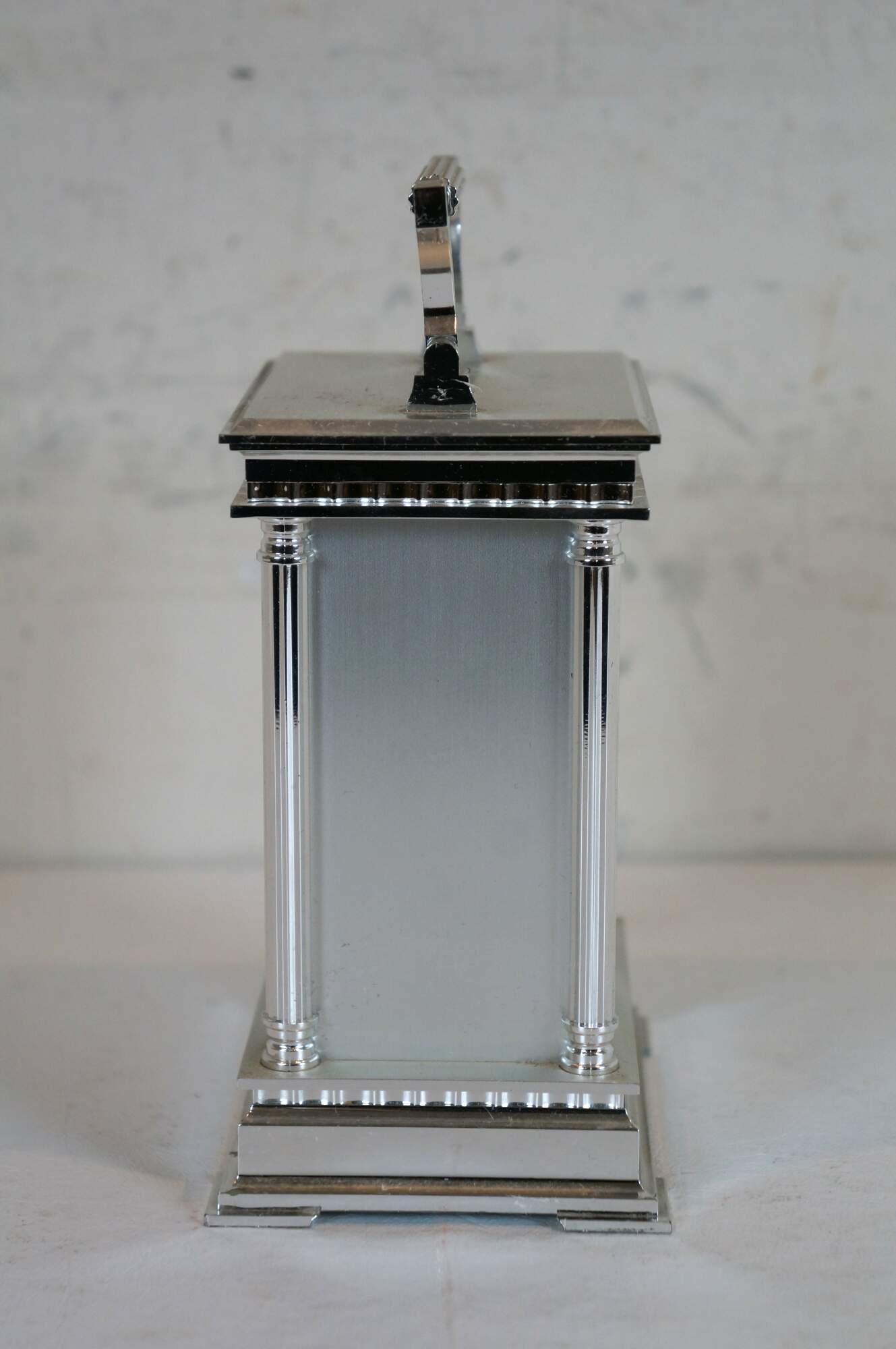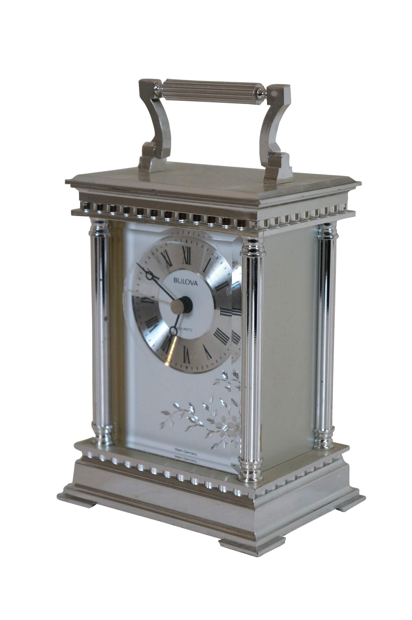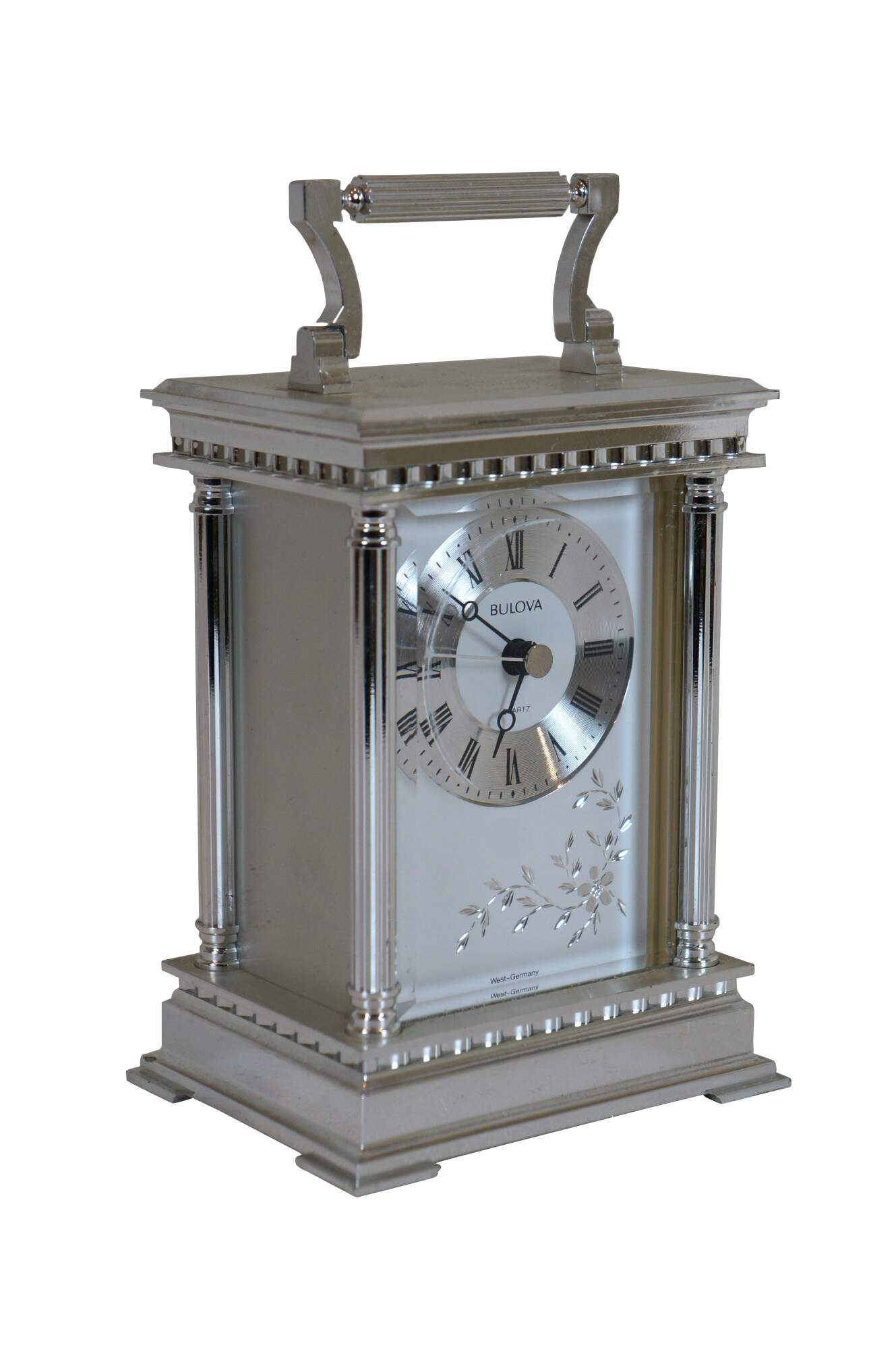 Vintage circa 1980s Bulova model B-1349 carriage-style desk clock. Traditional carriage clock shape with rectangular body and neoclassical columns flanking the silver face with black hands and Roman numerals, with an etched floral accent in the lower right corner. Metal and plastic body, finished in bright silver paint, with a rotating handle on top. Battery-operated quartz movement. Made in West Germany.