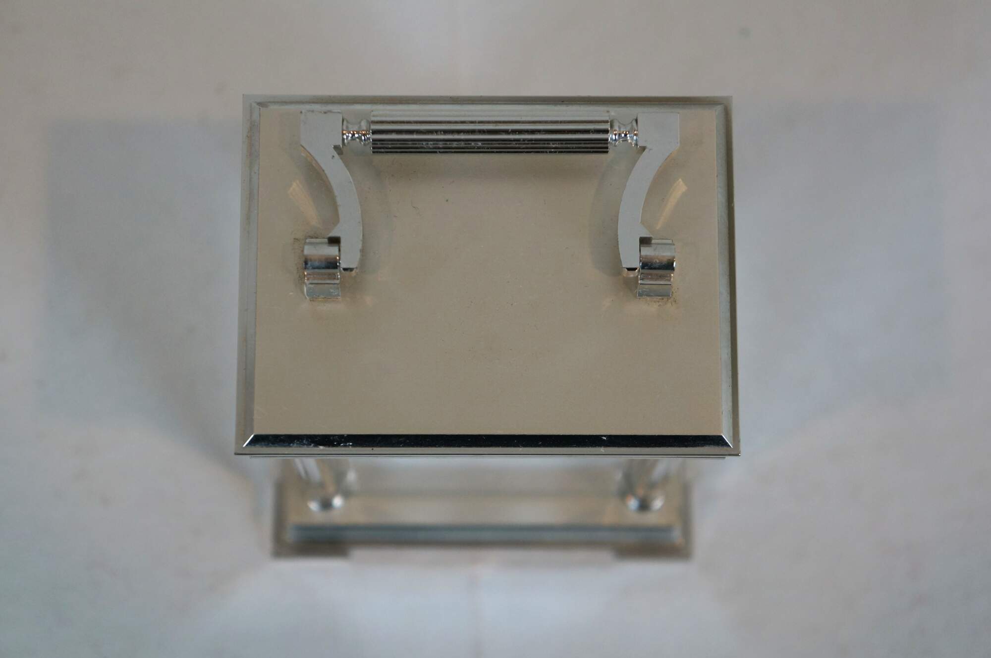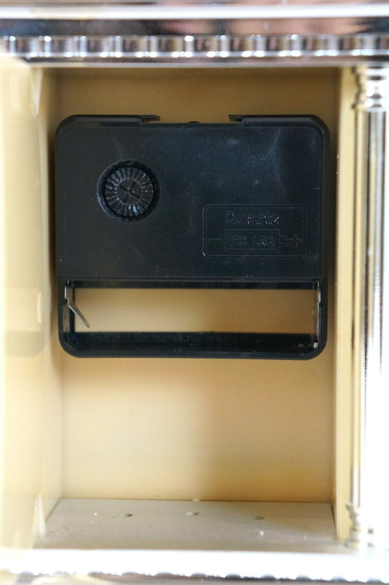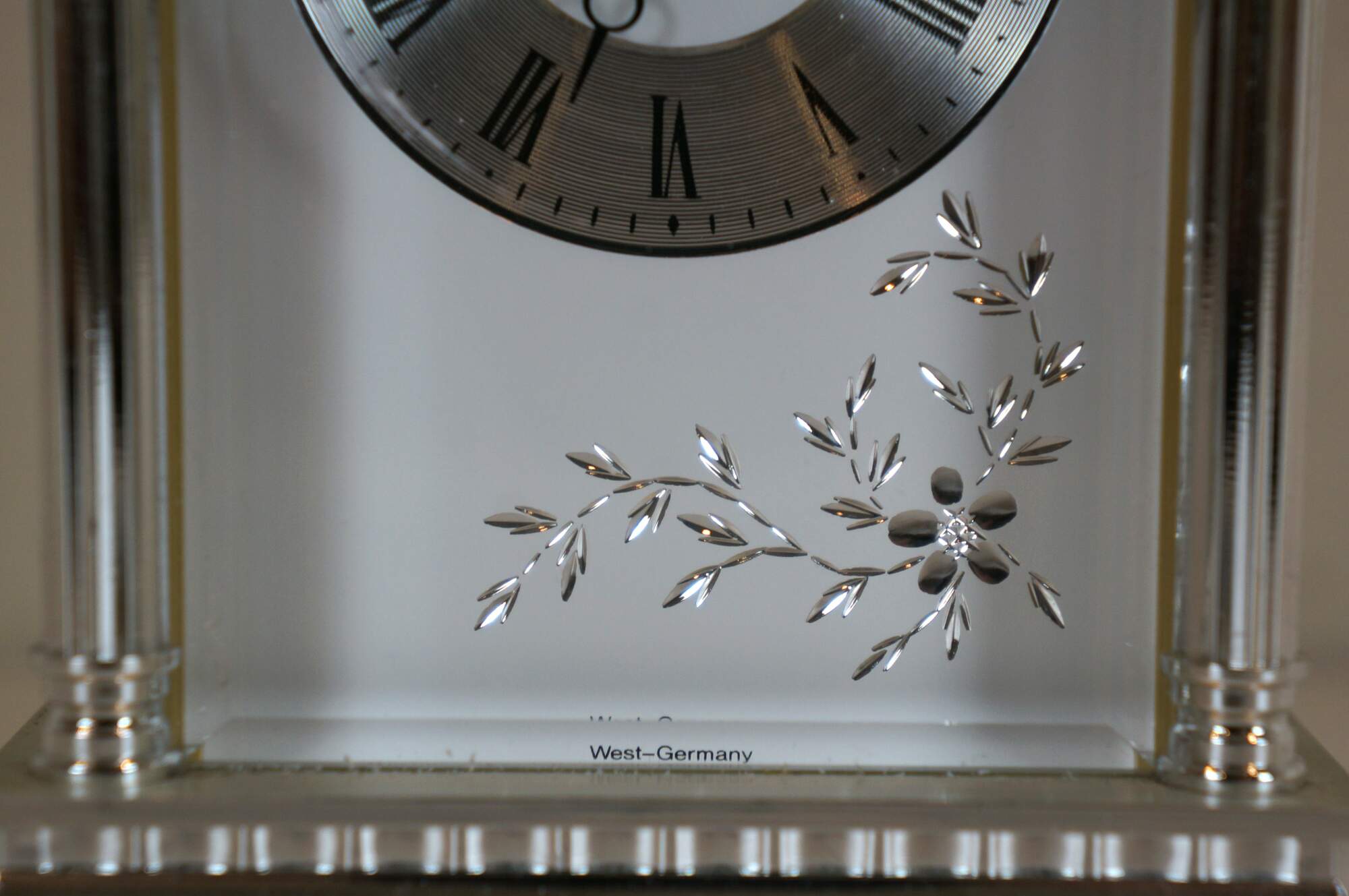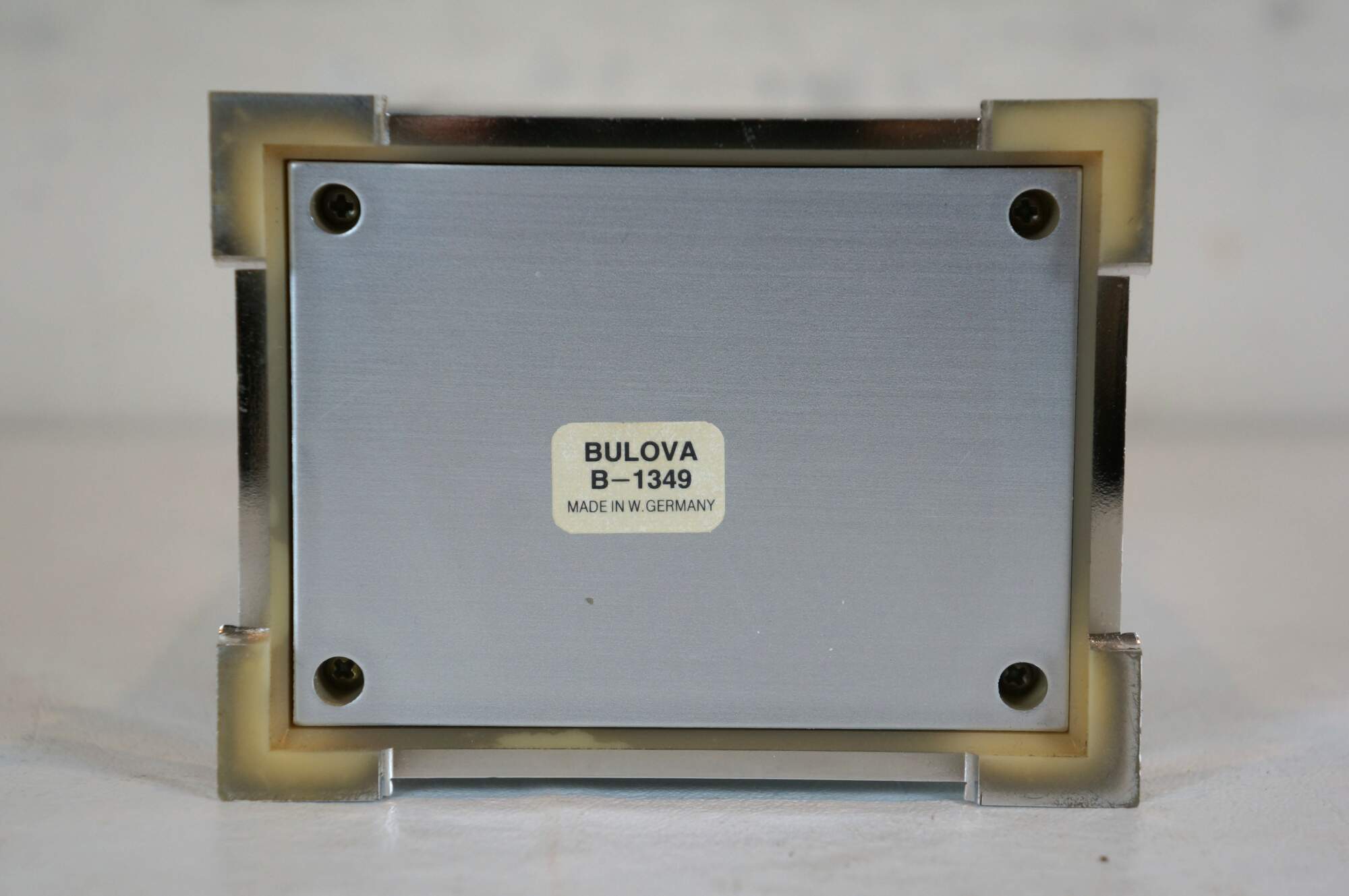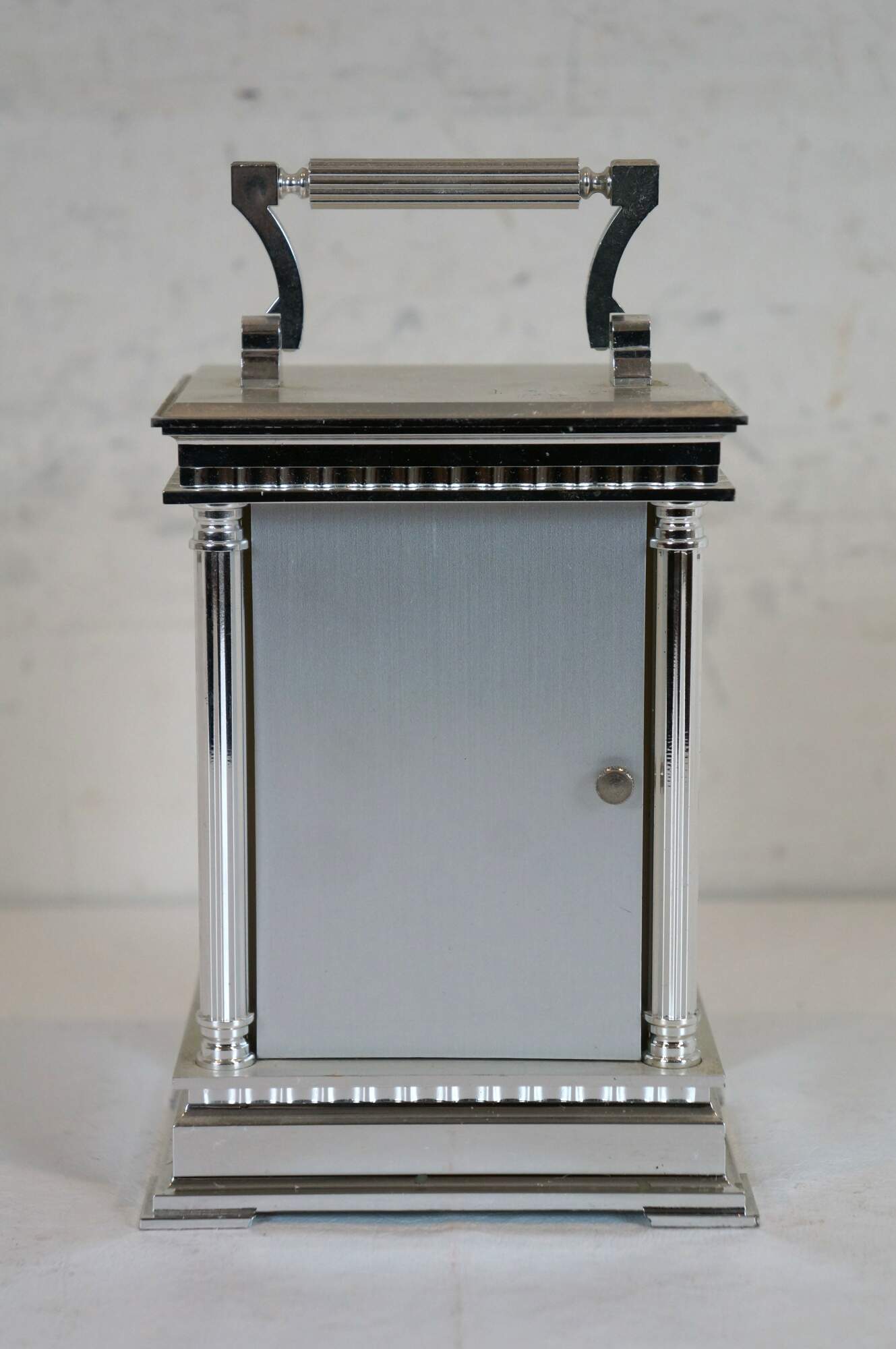 Vintage circa 1980s Bulova model B-1349 carriage-style desk clock. Traditional carriage clock shape with rectangular body and neoclassical columns flanking the silver face with black hands and Roman numerals, with an etched floral accent in the lower right corner. Metal and plastic body, finished in bright silver paint, with a rotating handle on top. Battery-operated quartz movement. Made in West Germany.