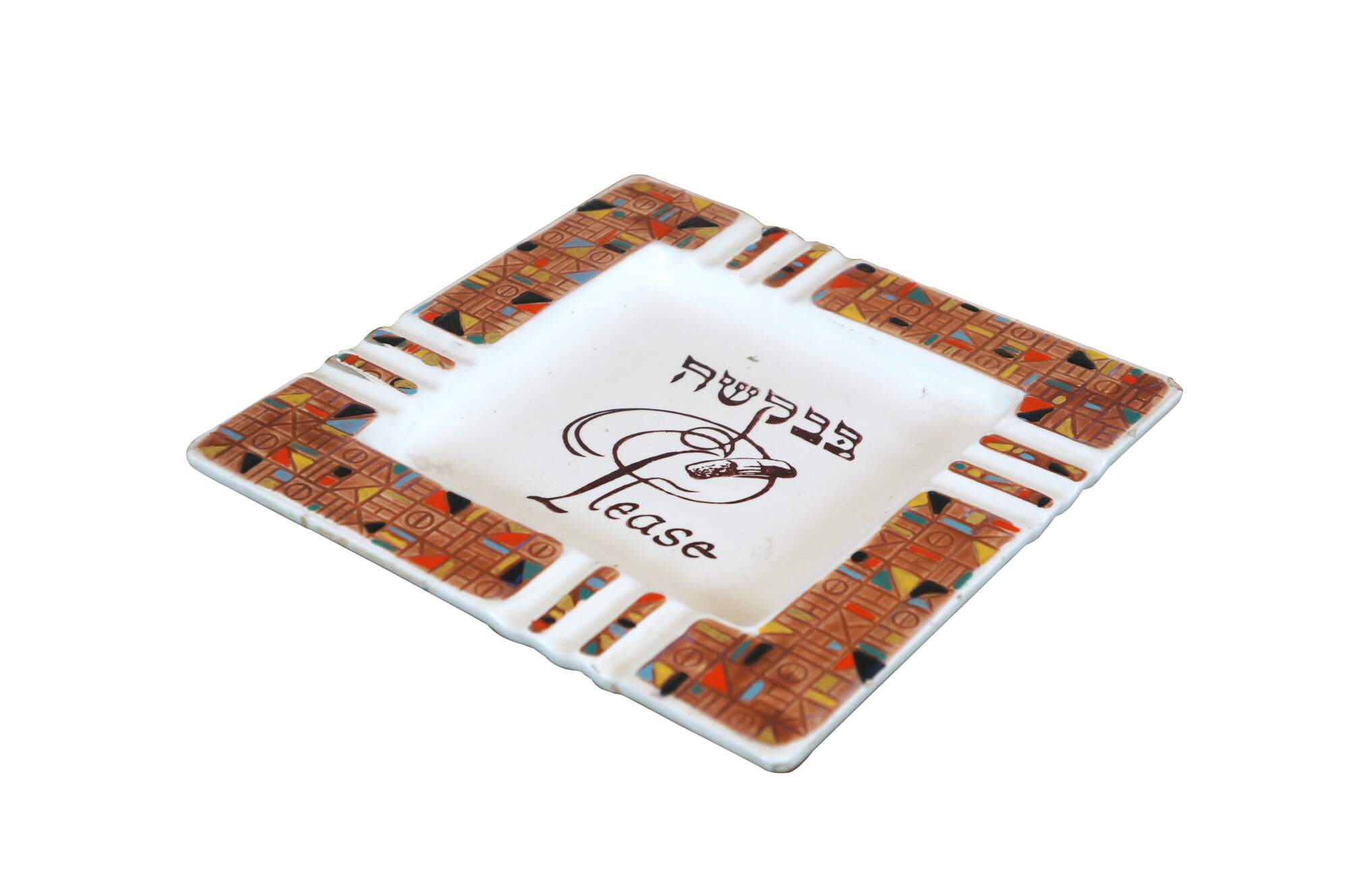 Vintage mid to late 20th century Judaica porcelain ashtray/plate. Square form featuring a multicolored mosaic-style design around the edge, broken by three cigarette rests on each side. At the center is the word "Please" in Hebrew and English, overlaid with a lightly smoking cigar. Designed in America by Va-Dai - E400/P.