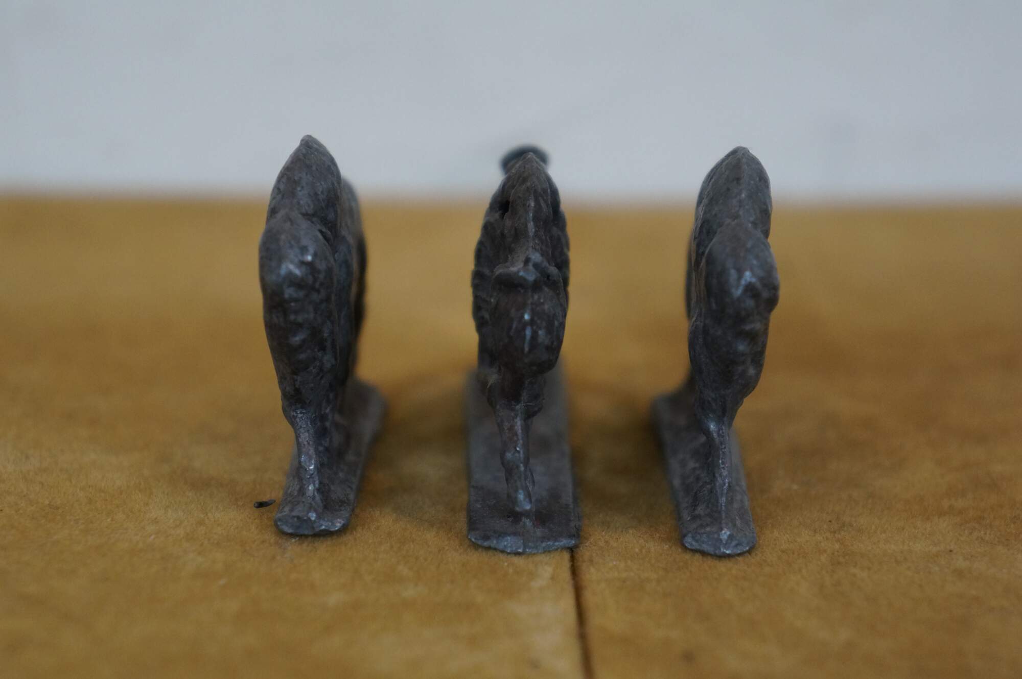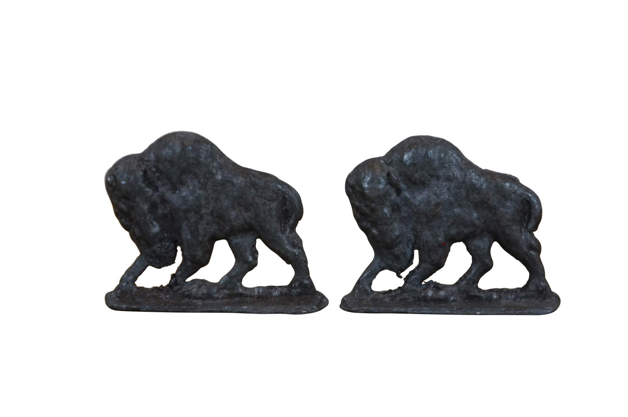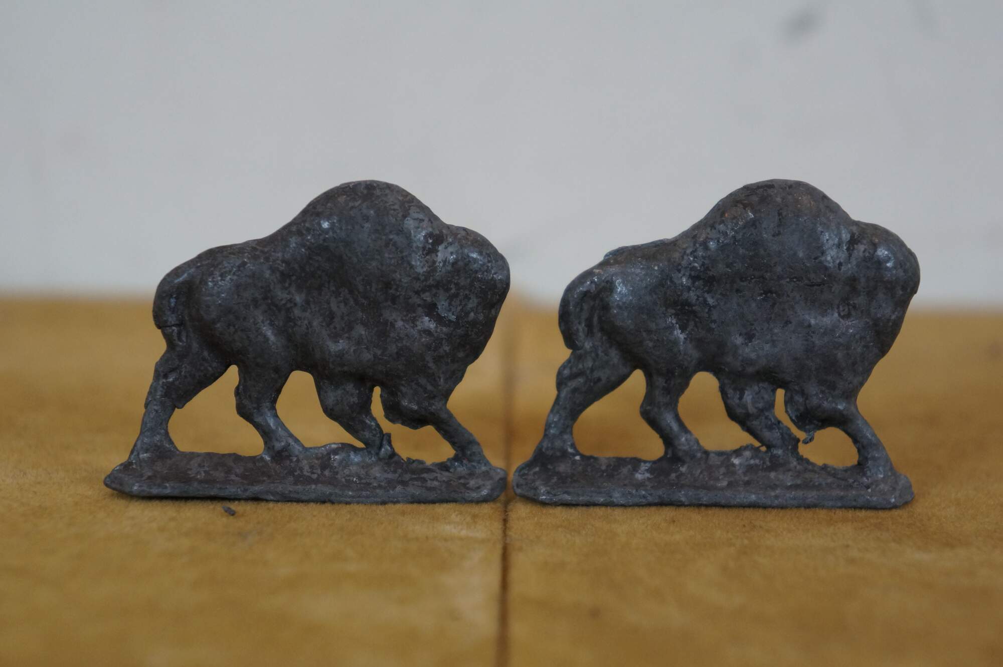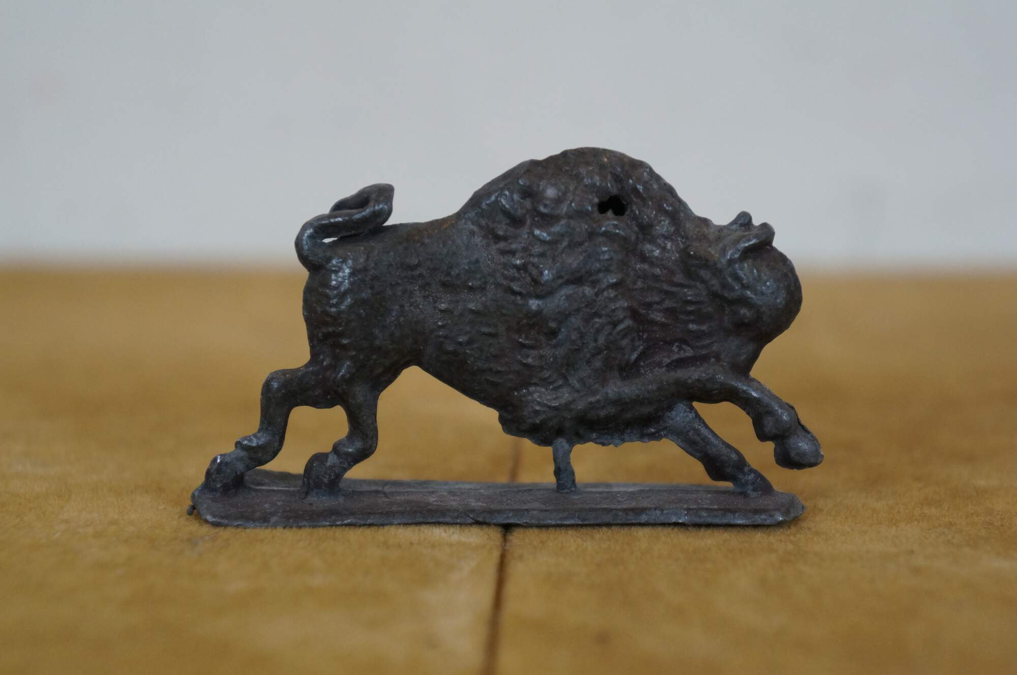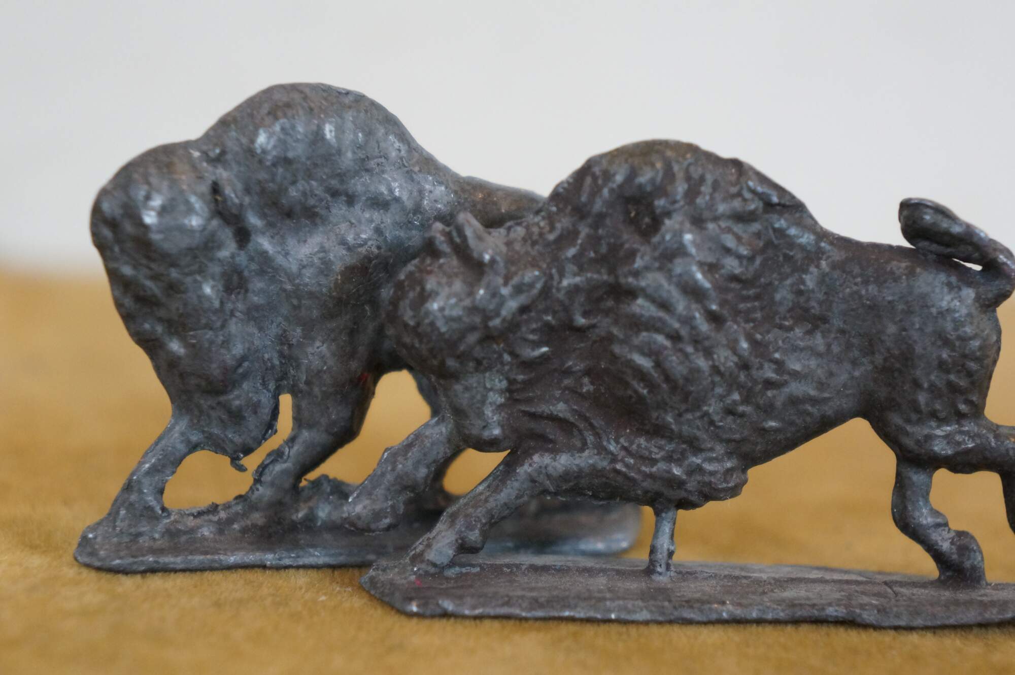 Set of 3 early to mid-20th century cast lead toy figures in the shape of American buffalo / bison. Flat-bodied figures with semi-rectangular bases.