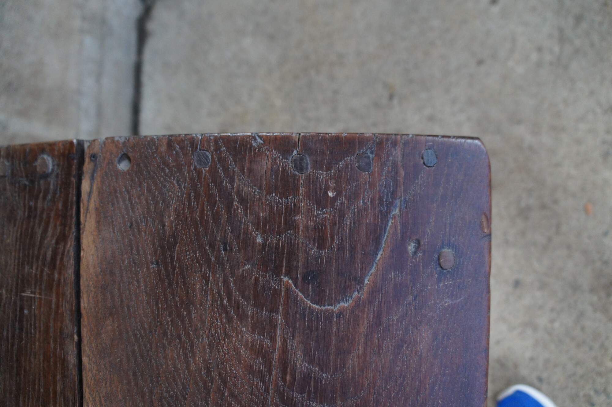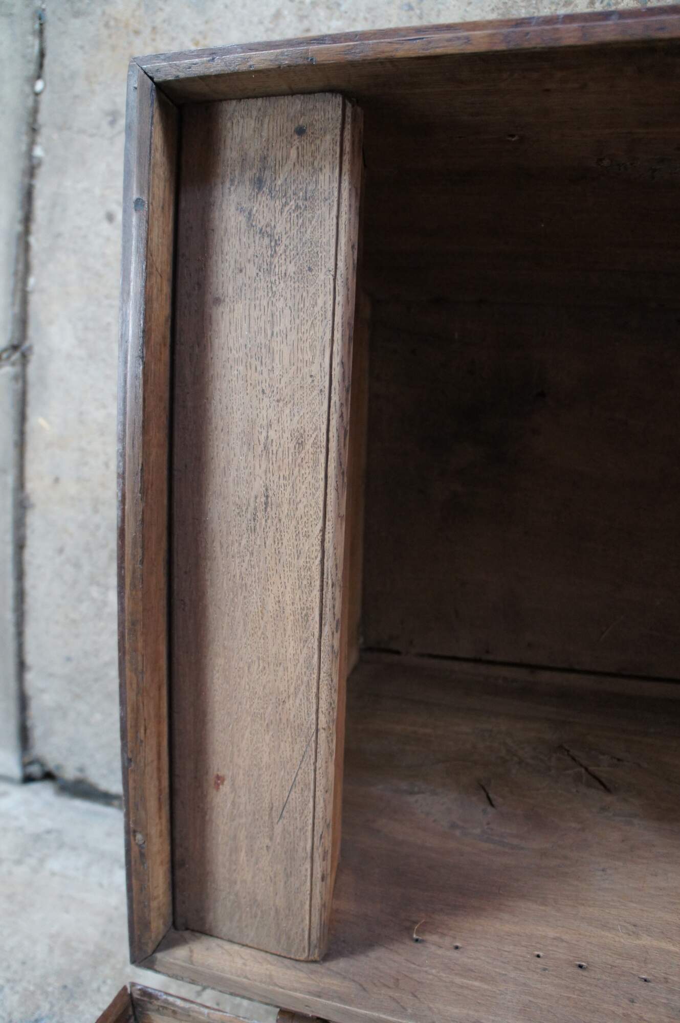 Fair condition, wear and distressing from age and use, splitting / cracking, missing trim, fading, marking / scuffing, missing bottom of escutcheon plate, working lock, strong handles, back hinges replaced at some point.