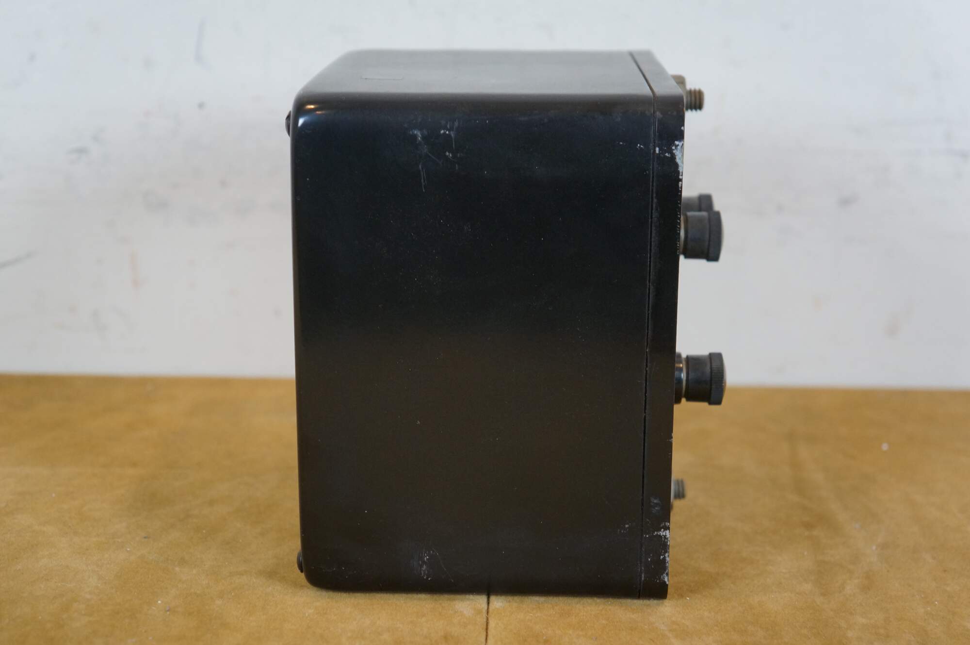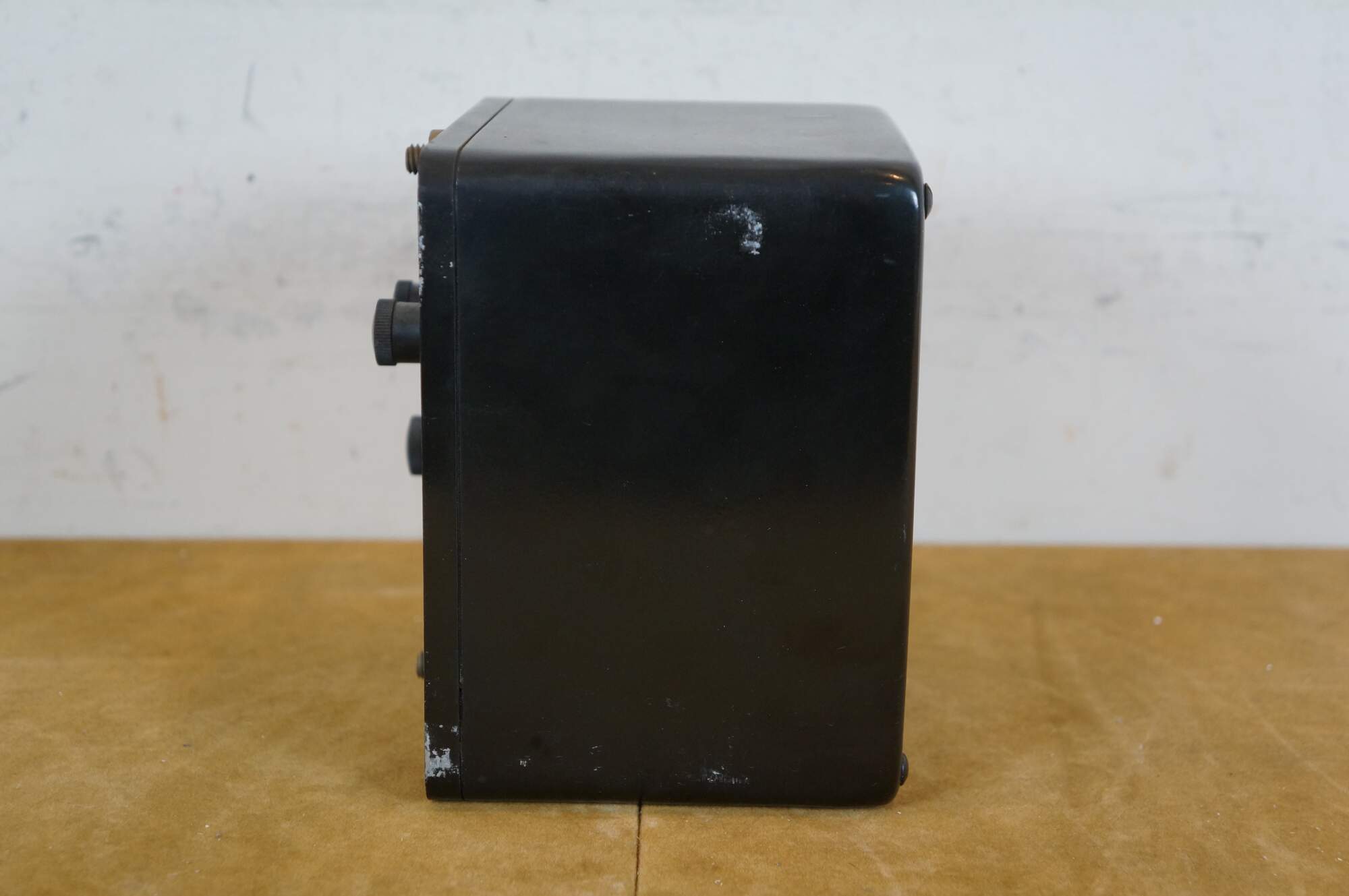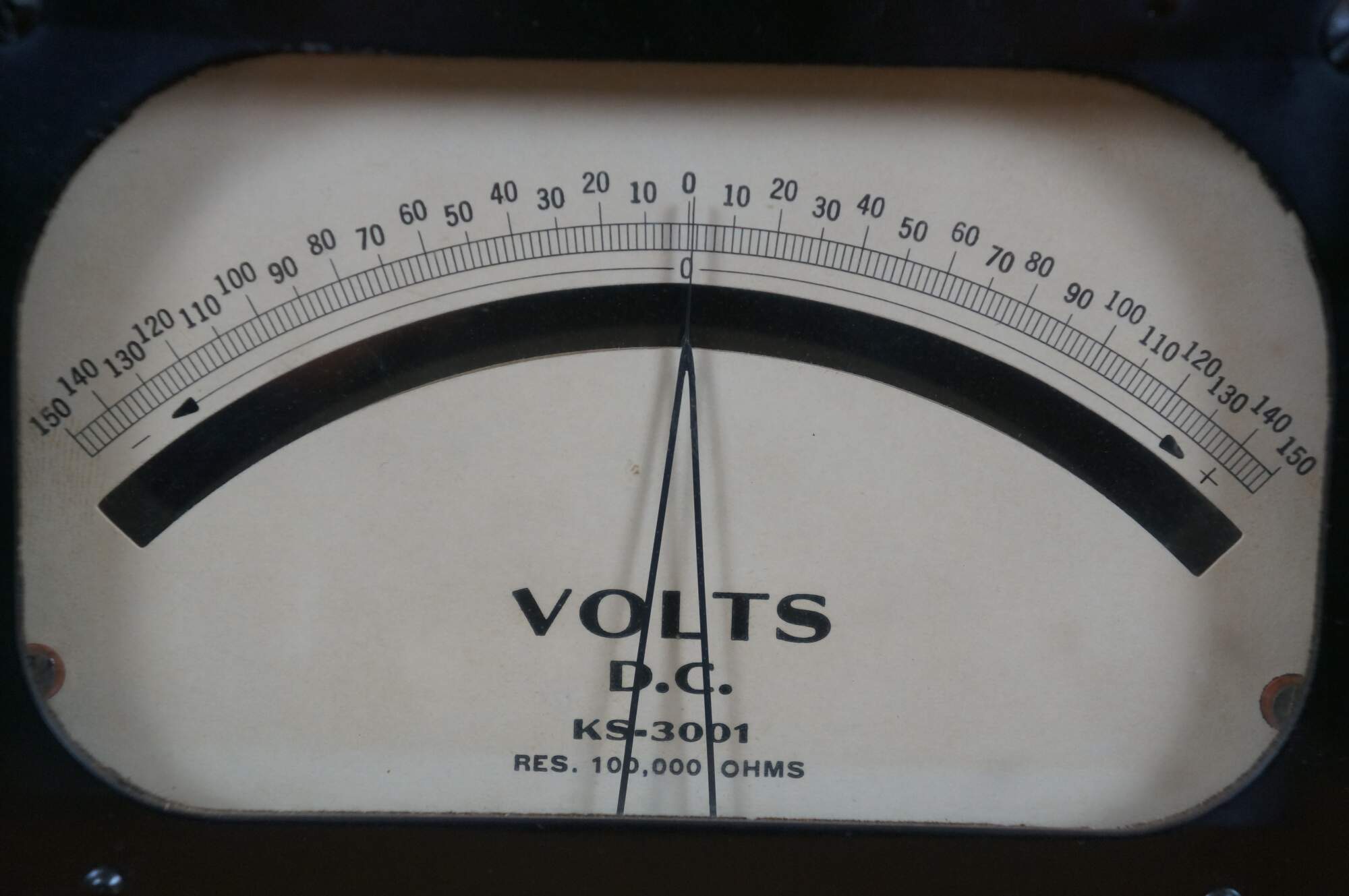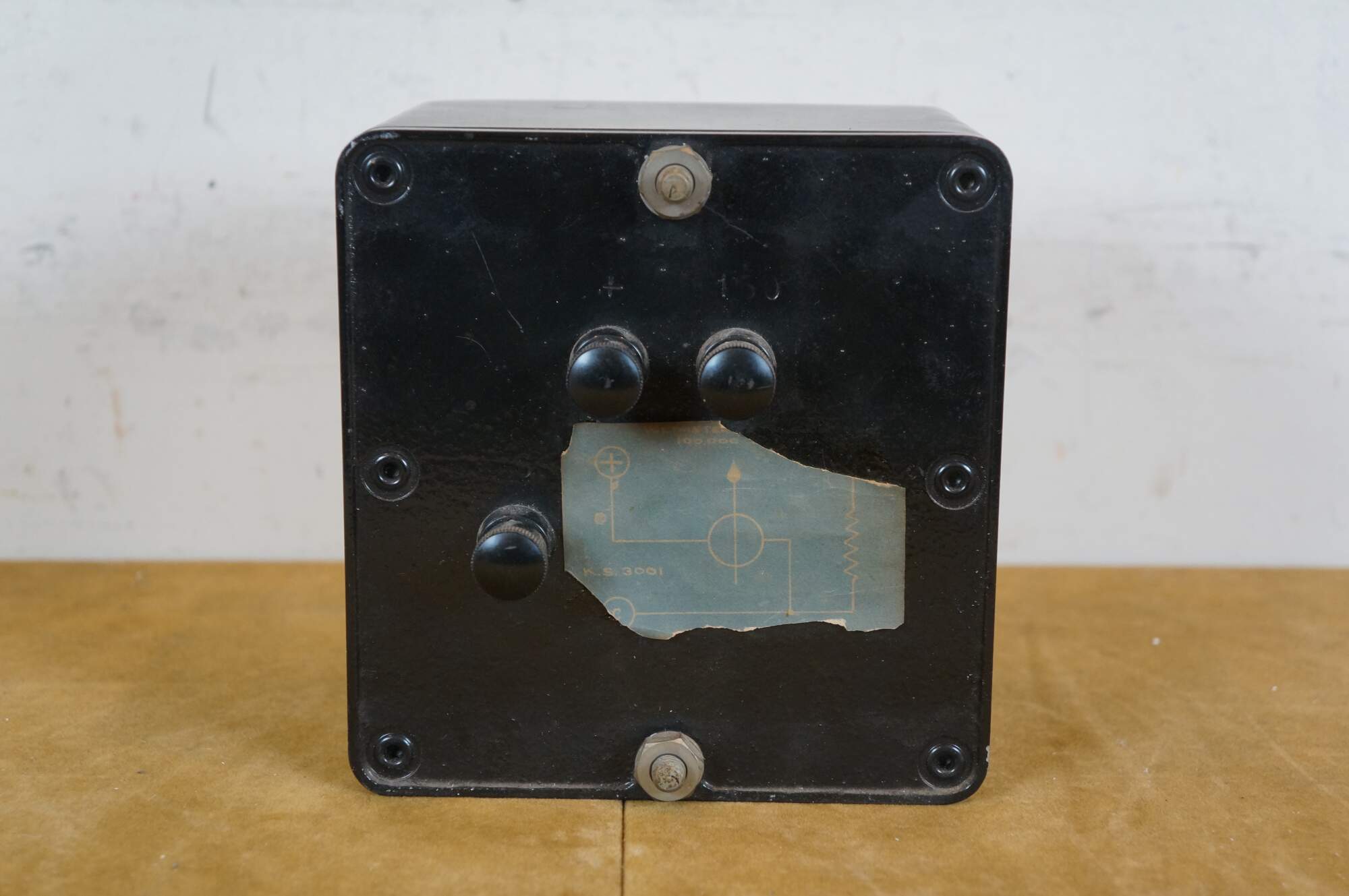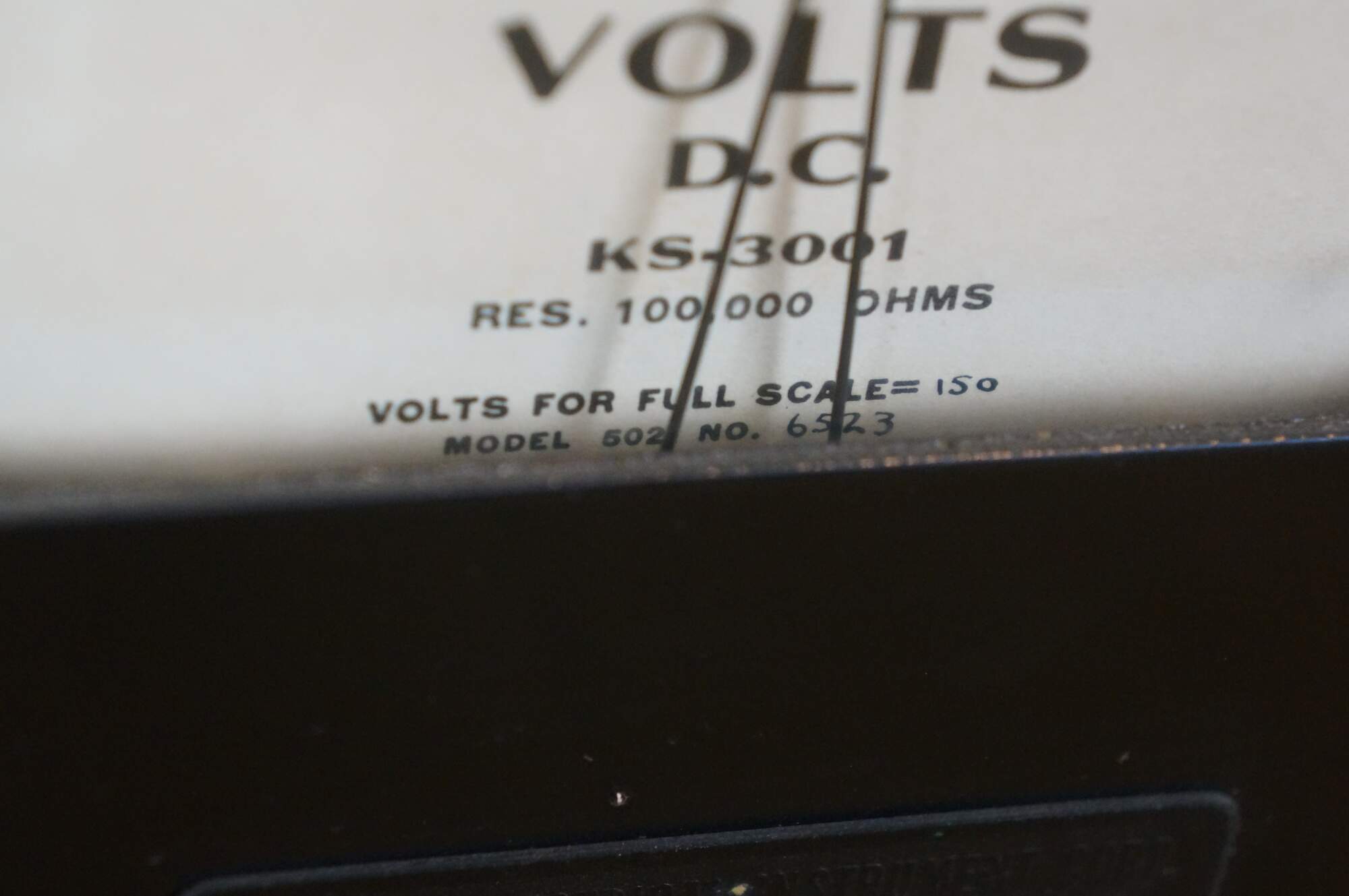 Mid to late 20th century D.C. Volt meter - KS-3001 - Res. 100,000 ohms - Volts for Full Scale = 150 - Model 502 - No. 6523 - Weston Electrical Instrument Corp - Newark, NJ, USA. Black metal case with glass window and three knobs on reverse.