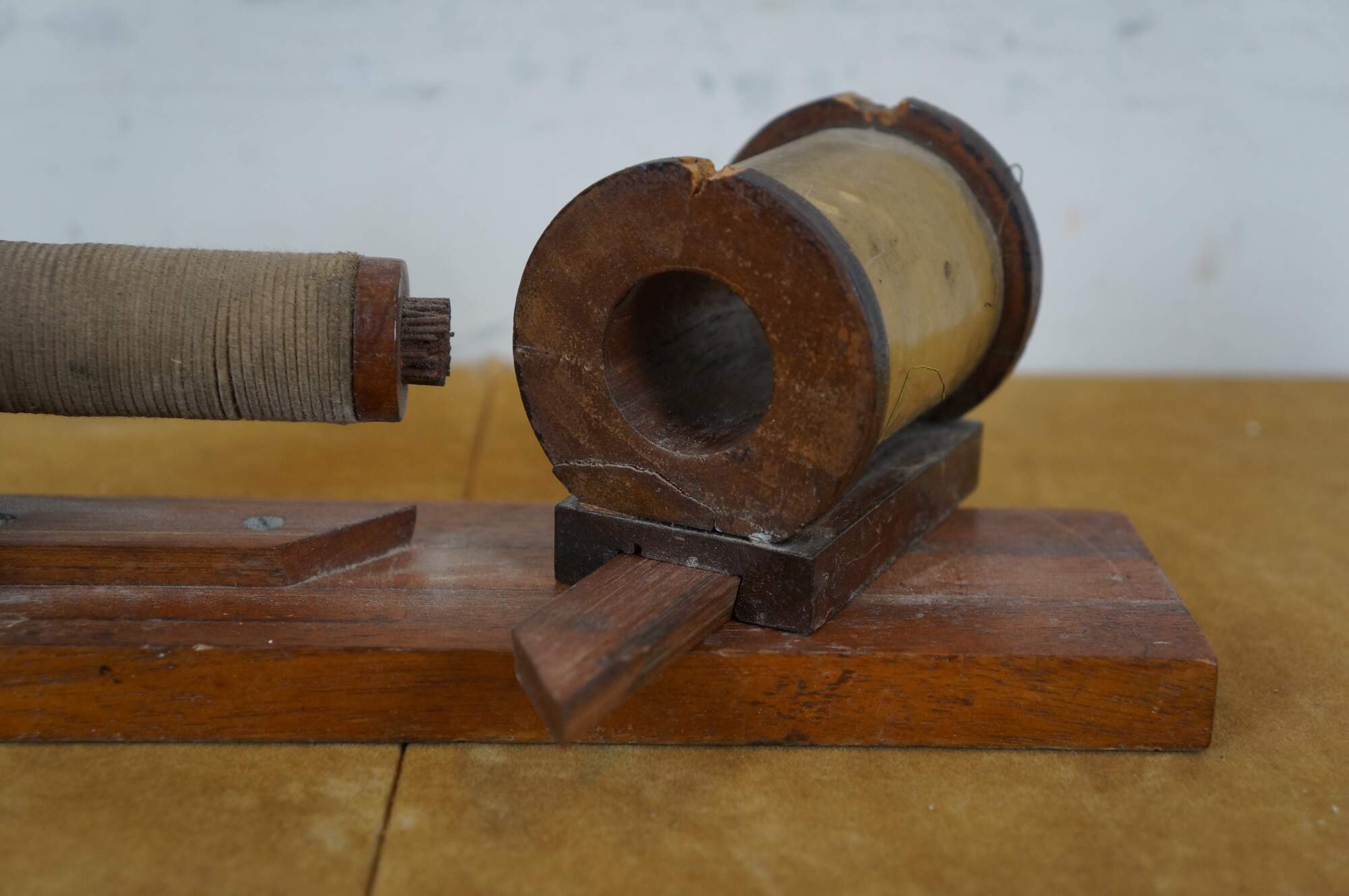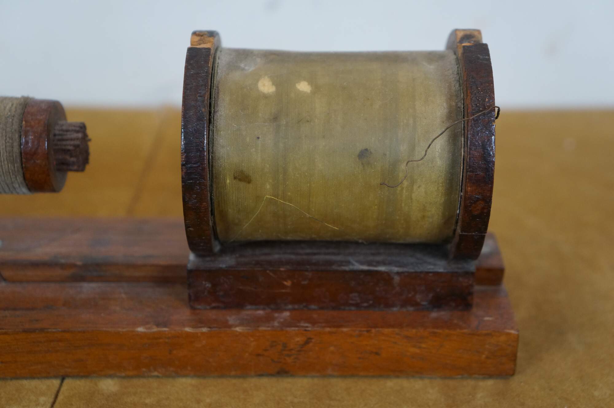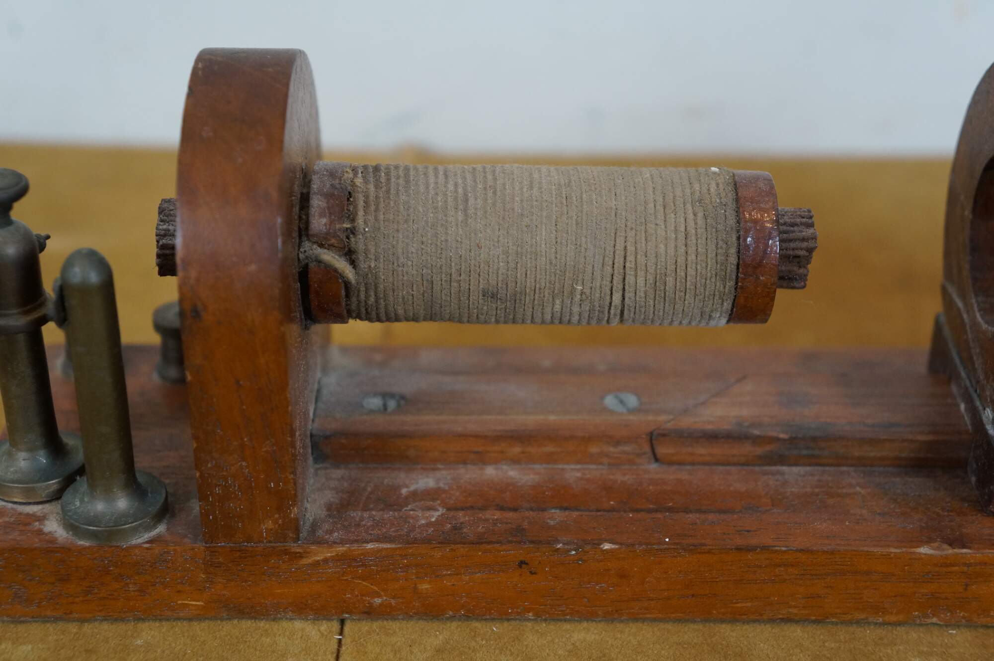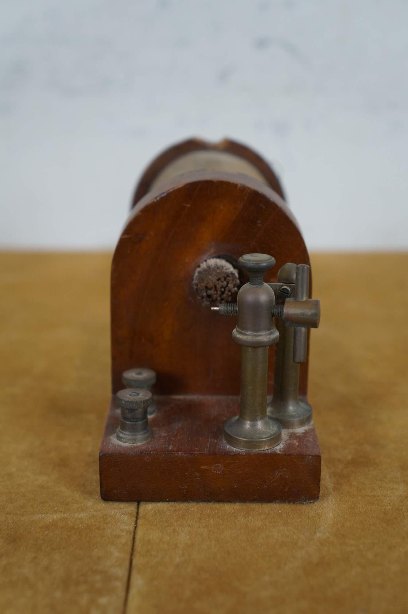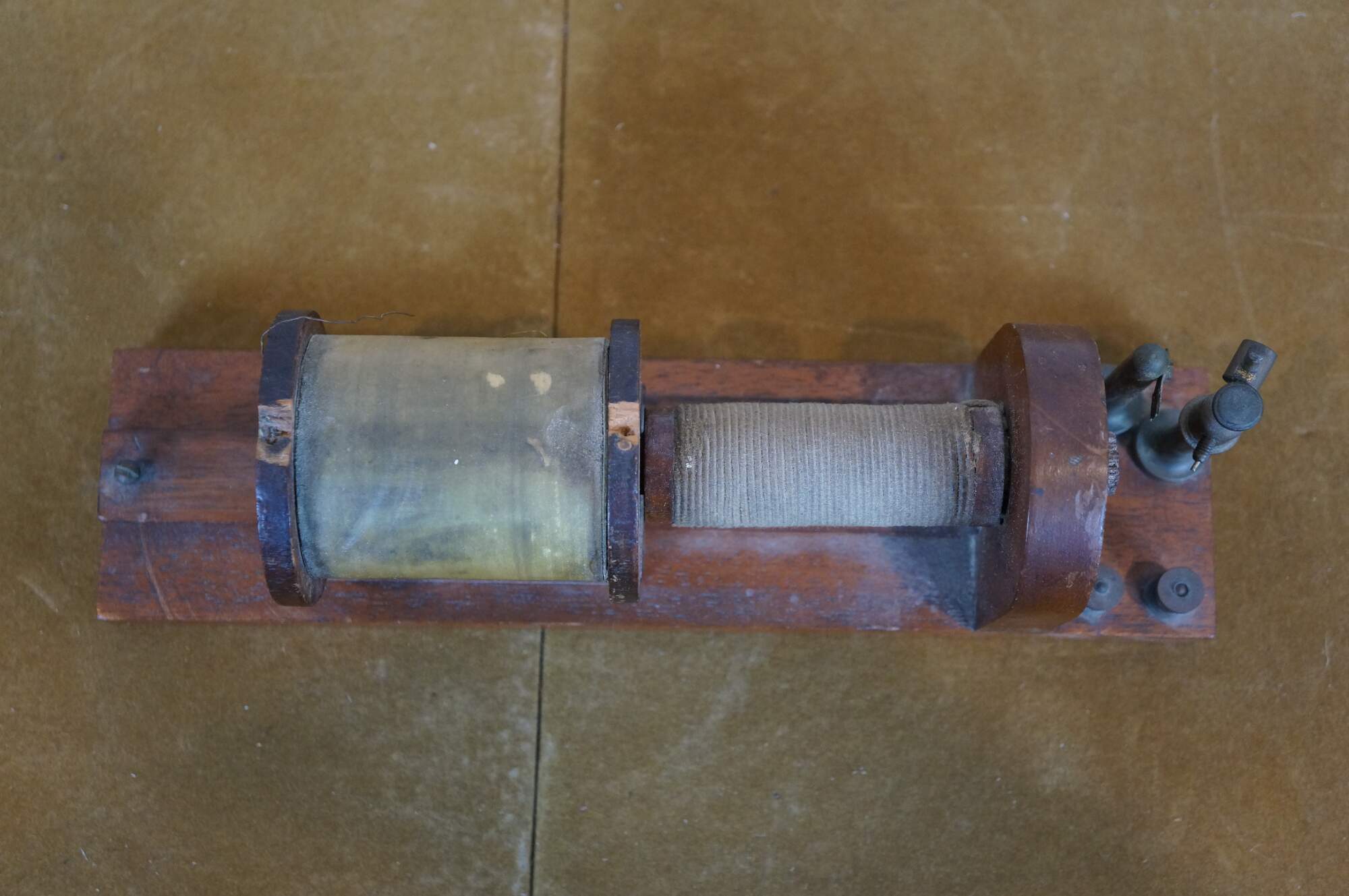 Early 20th century radio induction coil / loose coupler. Wood base supoorting twoconcentric coils around a central iron core. Outer coil can slide down / swivel away from inner coil. Four brass terminals on one end.