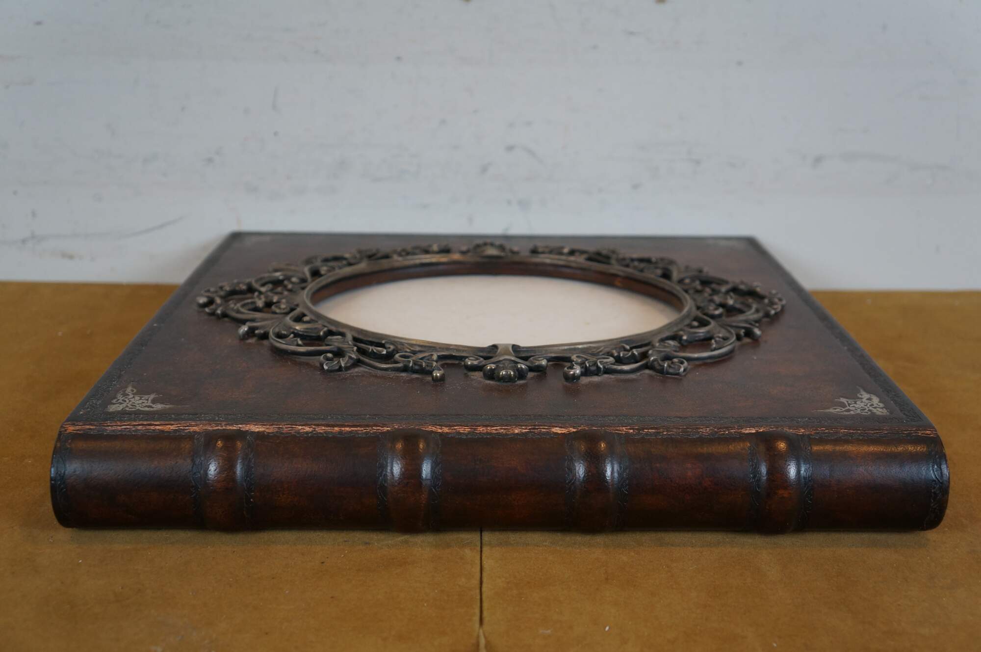 Late 20th century Maitland Smith tooled leather memories photo album scrap book with wooden spine and stamped gilt details. Front of cover incorporates an oval photo space with an ornate silverplate foliate picture frame. Contains approximately 75 blank pages.