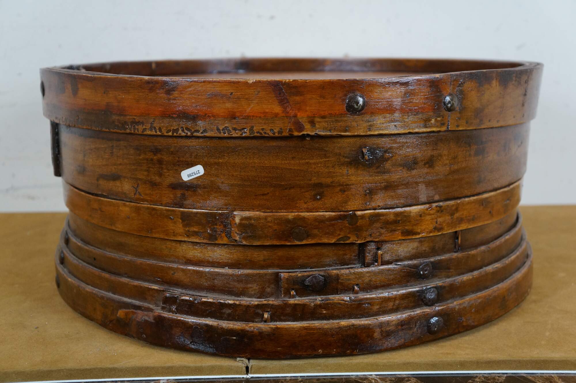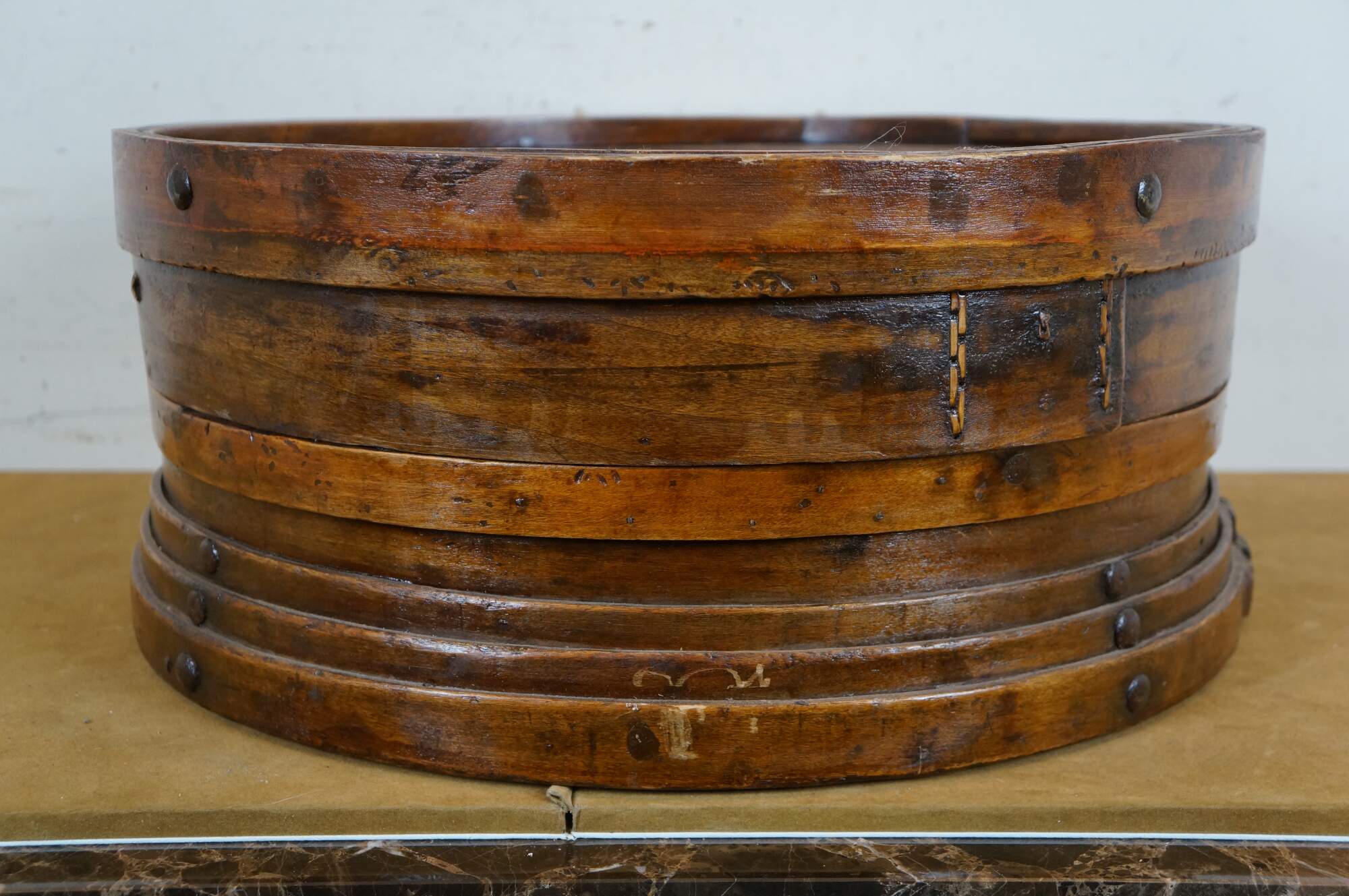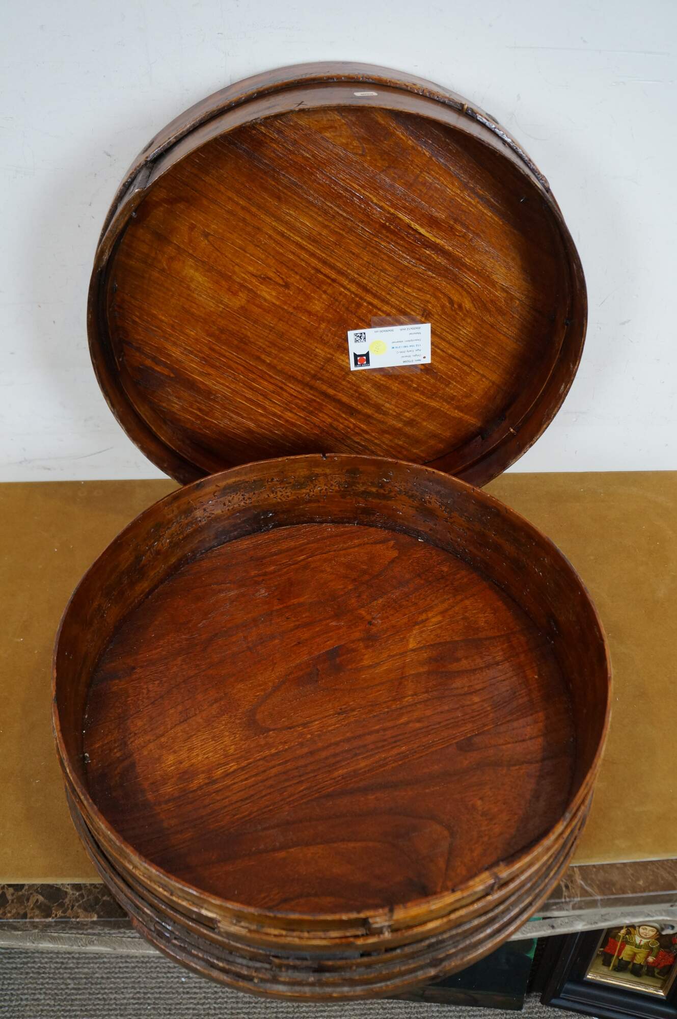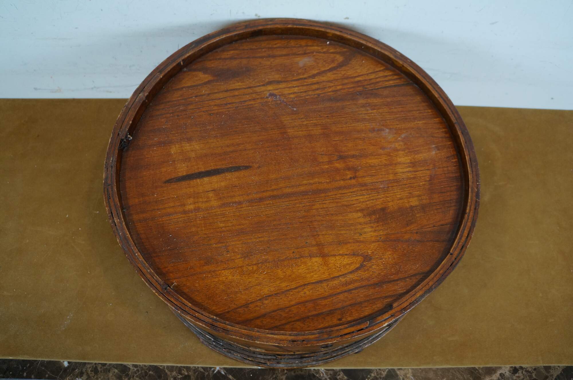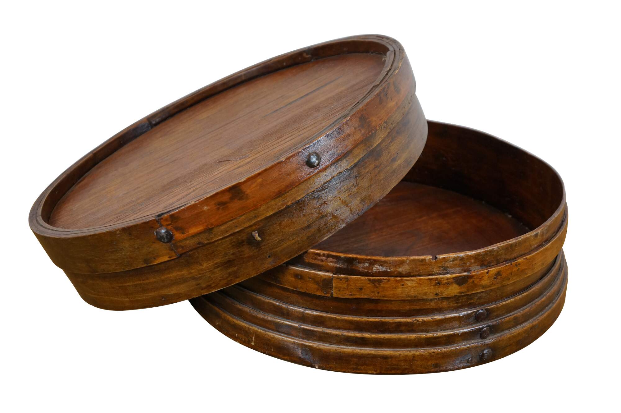 Early 20th century Shanxi wooden storage box used for serving steamed dumplings / food at family gatherings. This steamer box features traditional round, rustic, bentwood construction with metal nails / rivets.