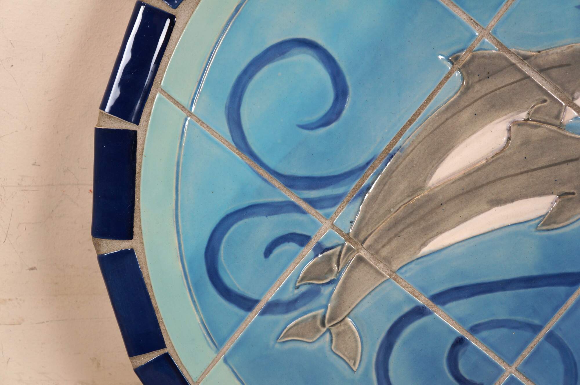 Ceramic tile art wall medallion depicting a pair of dolphins swimming in the ocean. Signed D. Hutch. D&H Studio Inc - Custom Ceramic Tiles - Lake Park, FL.