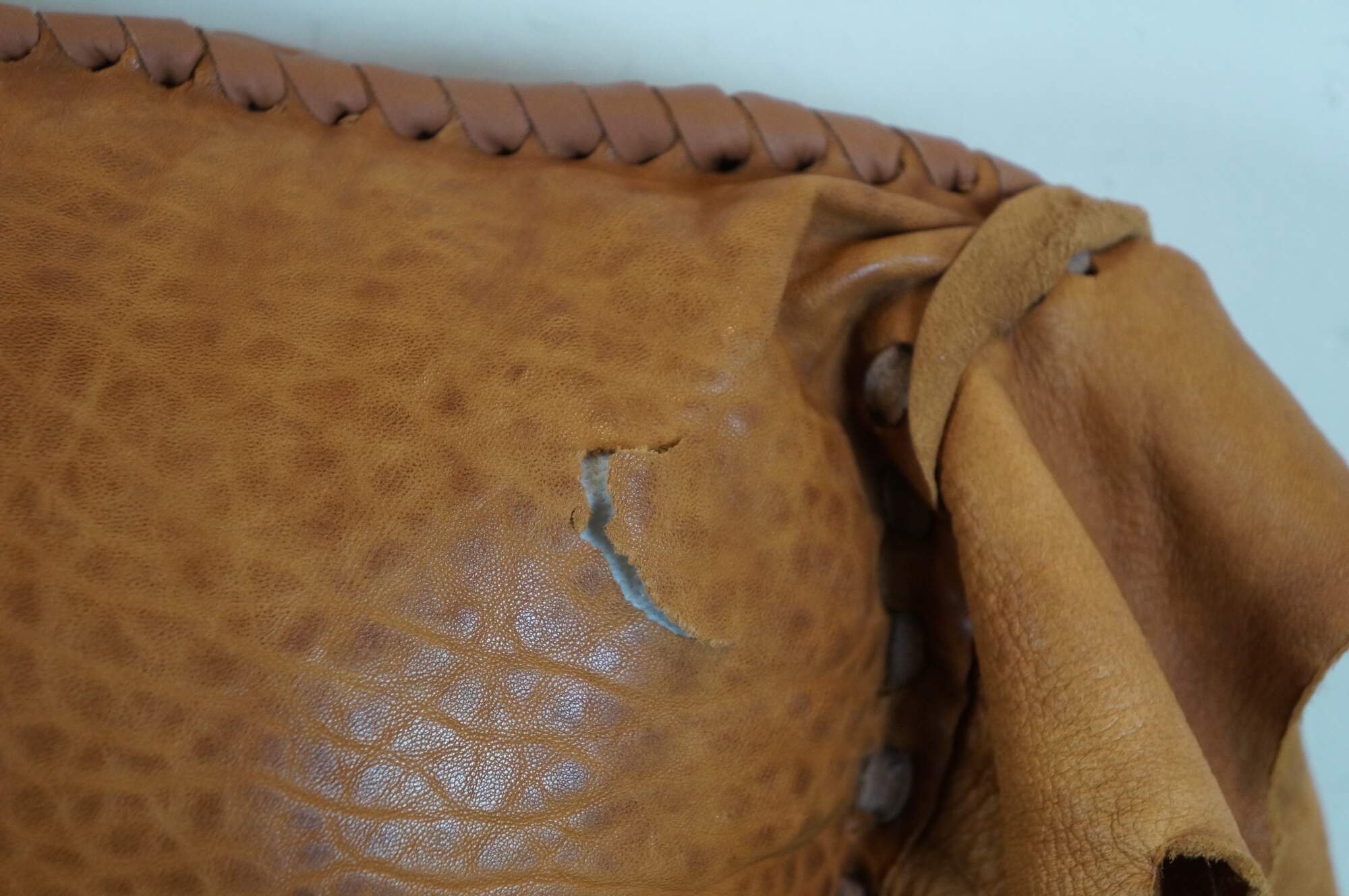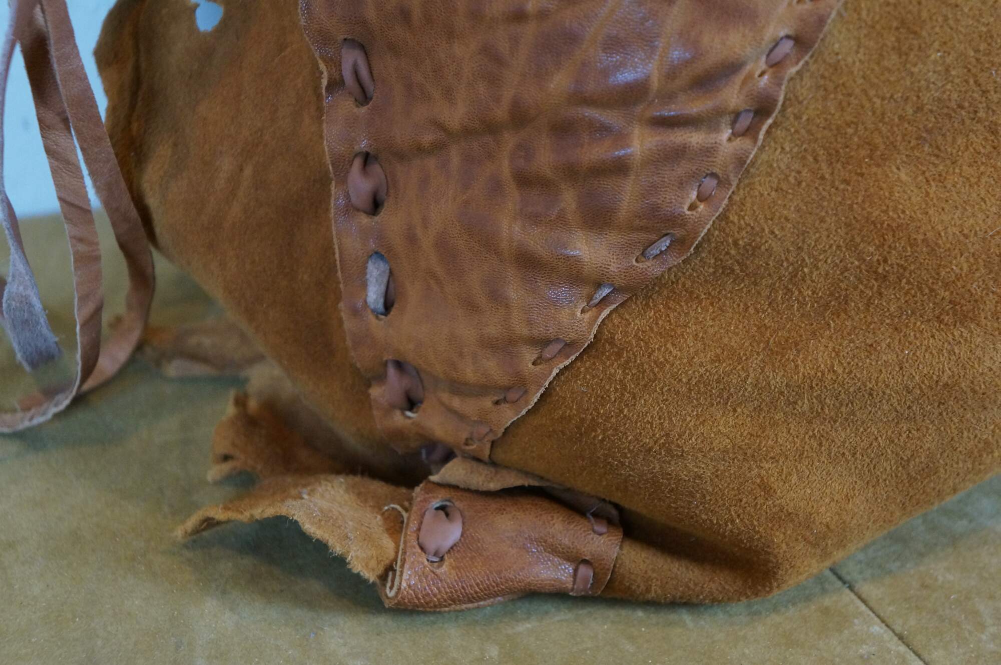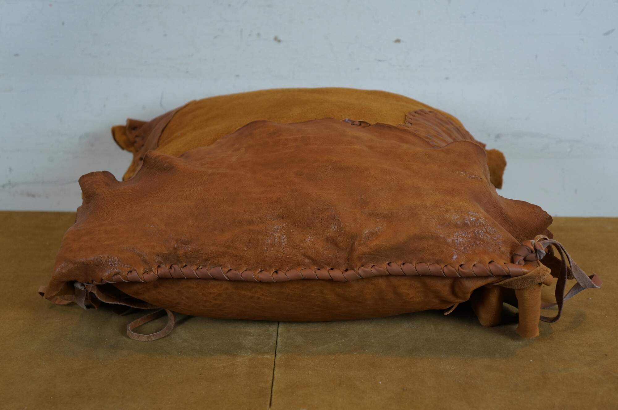 Rustic Southwestern / Native American brown leather throw pillow, fashioned with a patchwork of suede and textured leather with a rough cut edge, decorative stitching and tassel corners. Fiber filled.