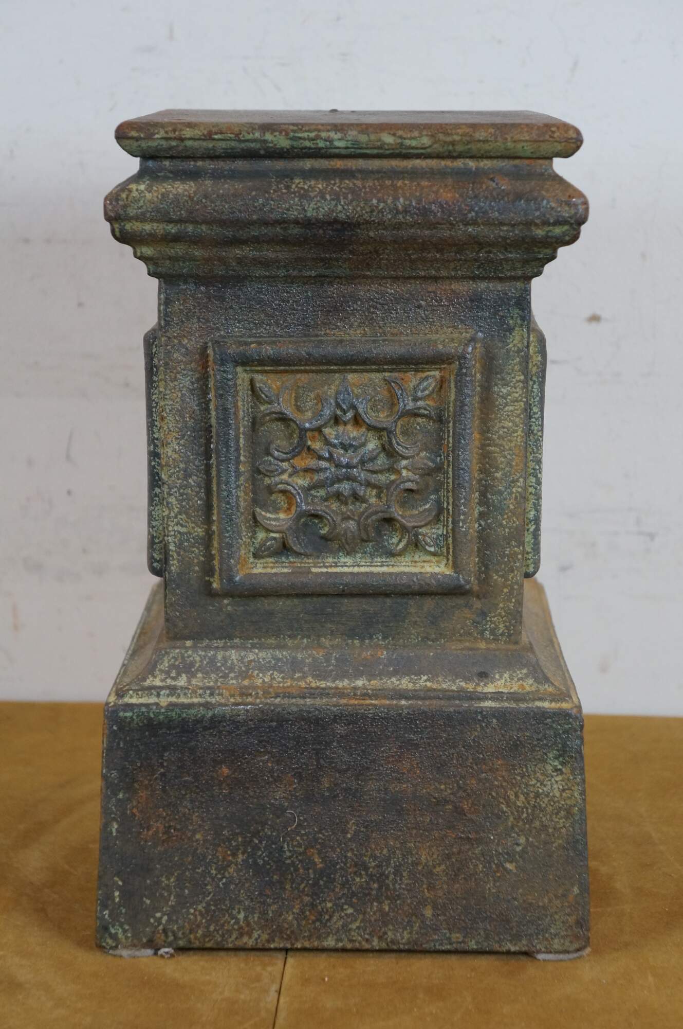 Cast iron square column shaped plinth with floral panels on each side. Perfect for use as a stand for plants, candles, or sculptures, indoors or out.