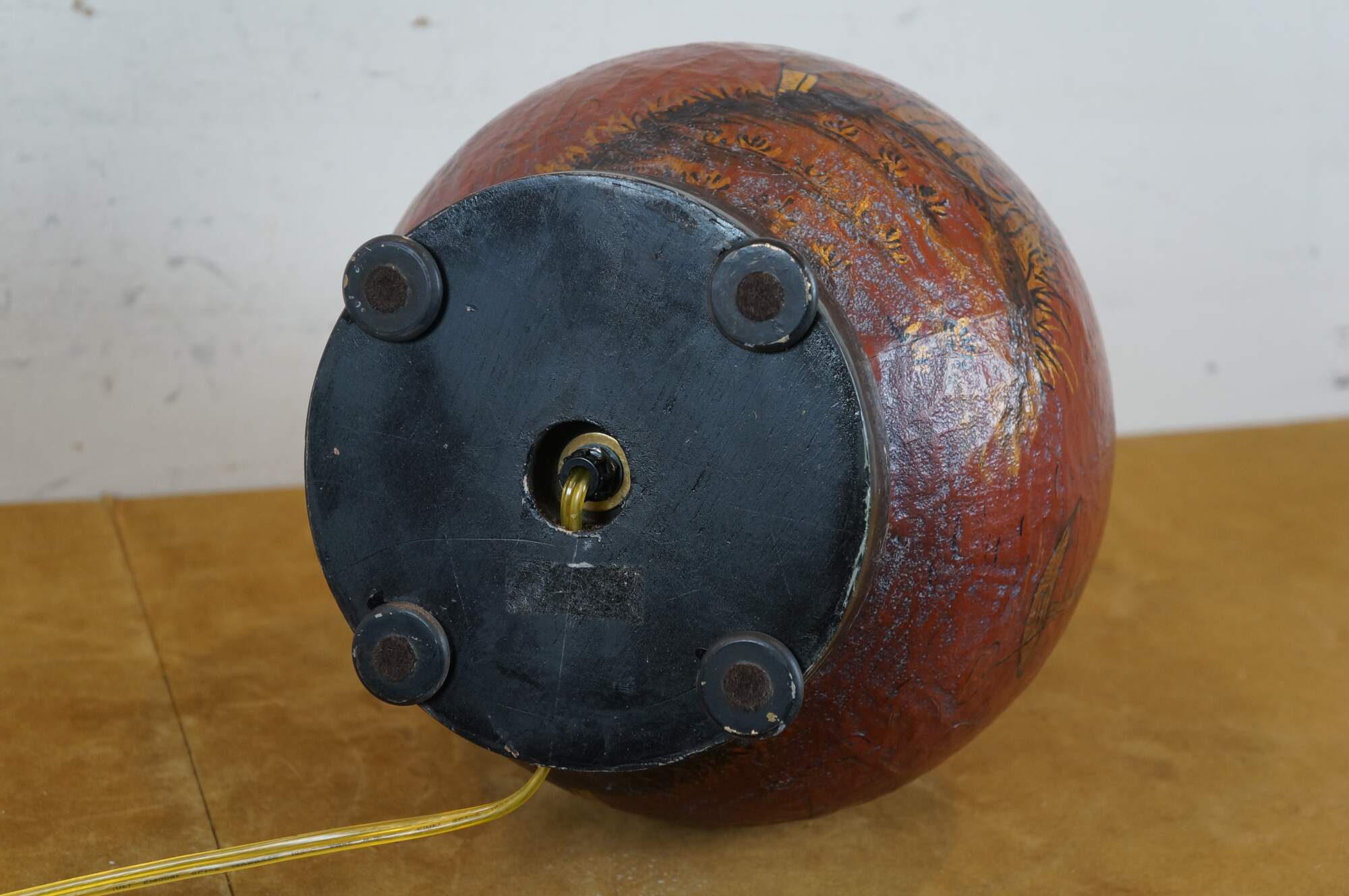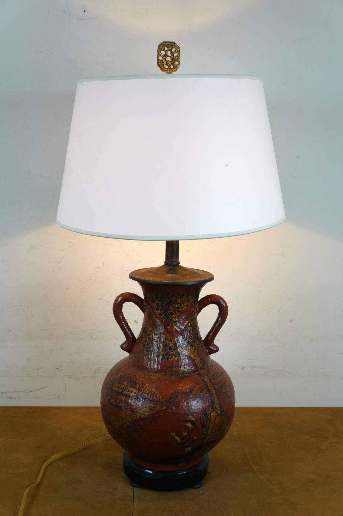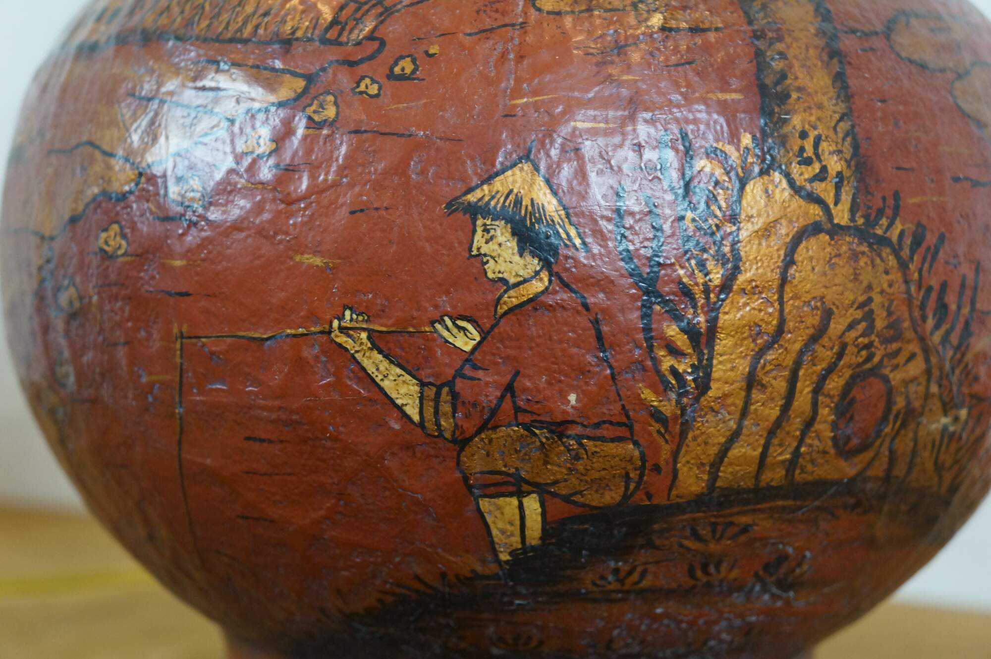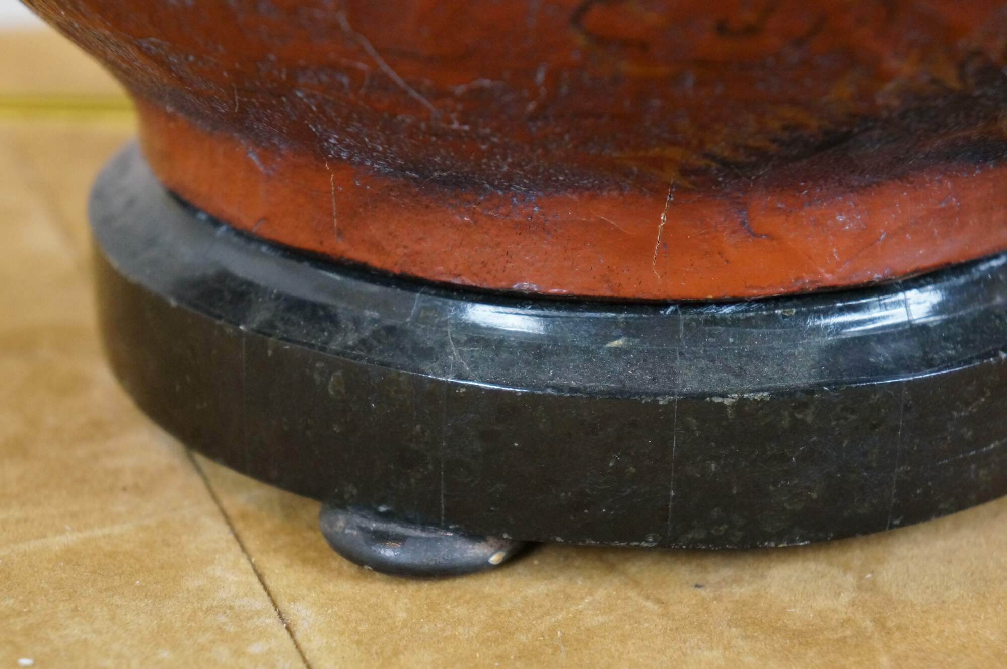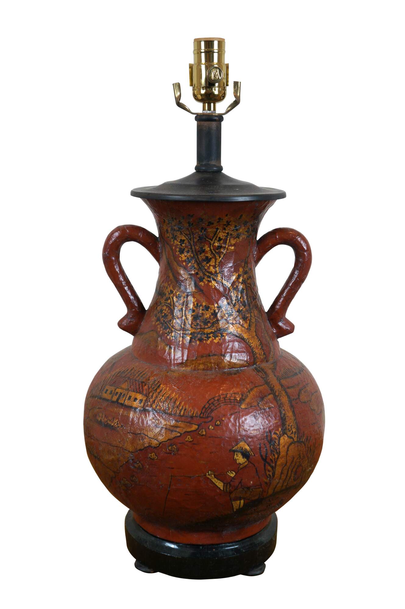 Maitland Smith, circa 1990s, vase / vessel / urn / jug shaped Chinoiserie table lamp featuring red coromandel style lacquer finish with a painted landscape / fishing scene in gold and balck, and black tesselated stone base. Includes harp, white paper shade and brass Chinese finial.