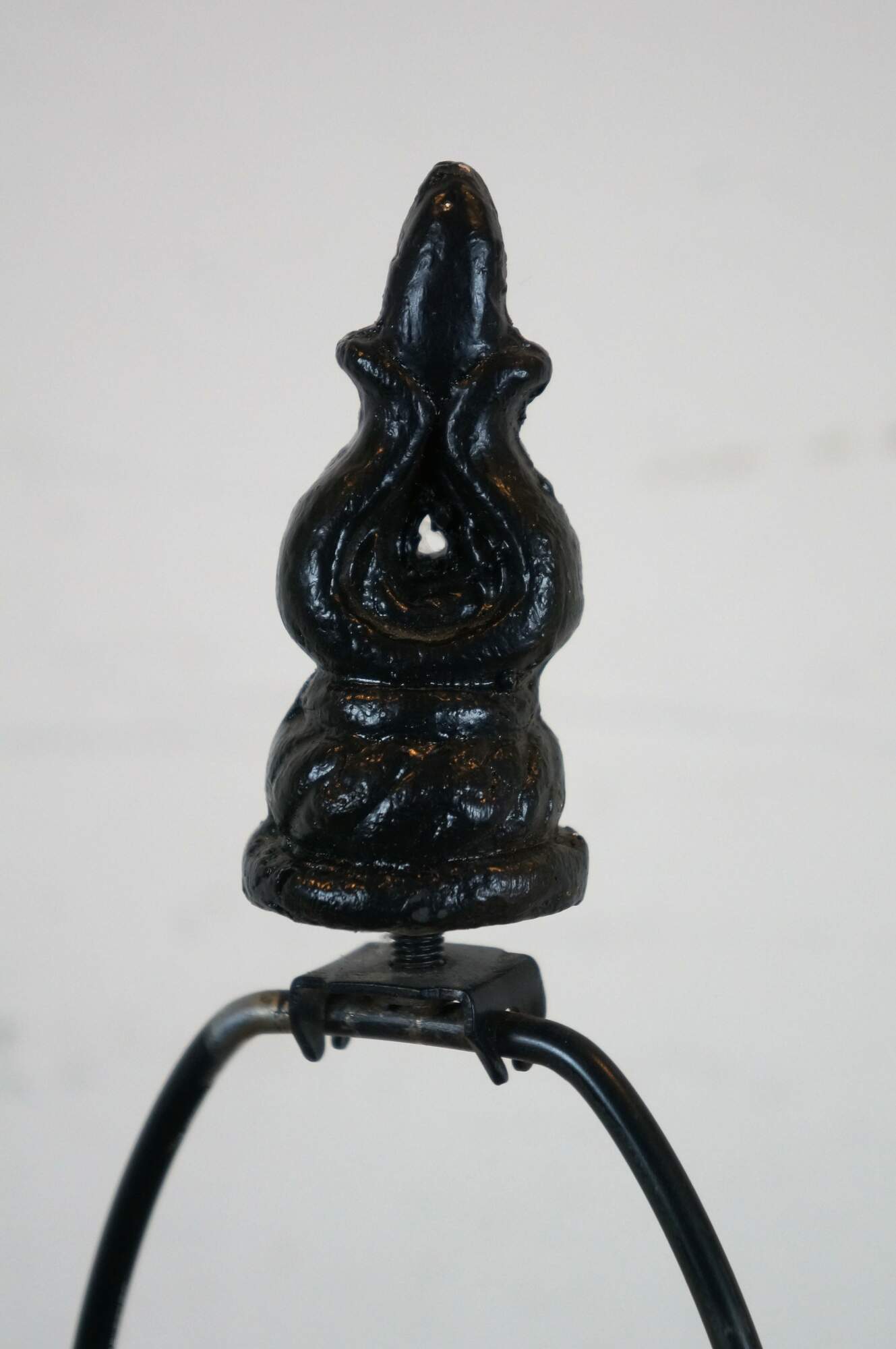 Black painted ceramic table lamp in the shape of a horse head on a rectangular plinth. Includes harp and flame shaped finial. Made in China.