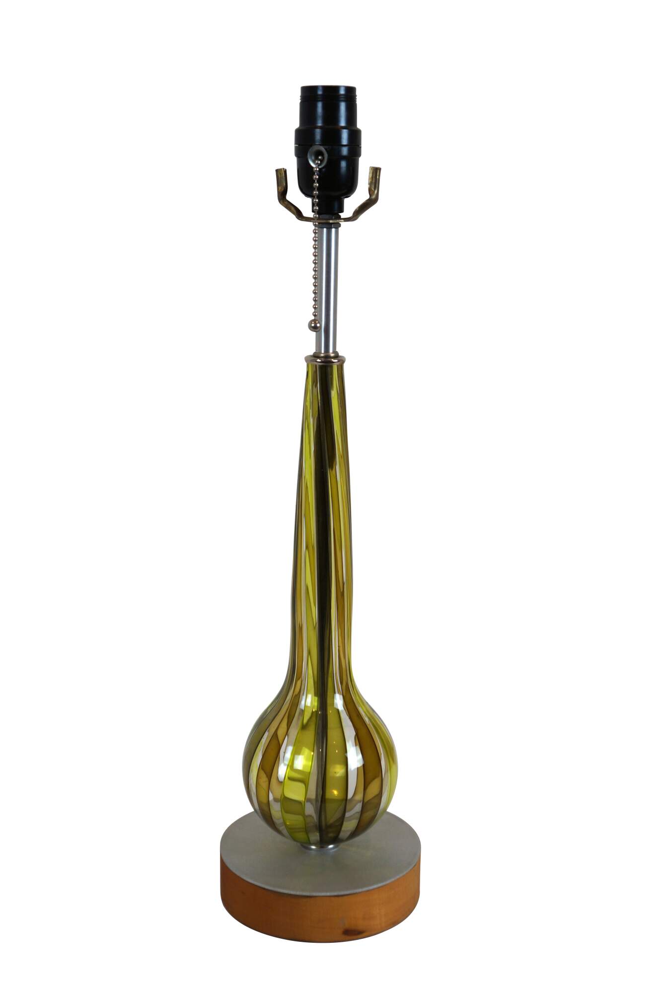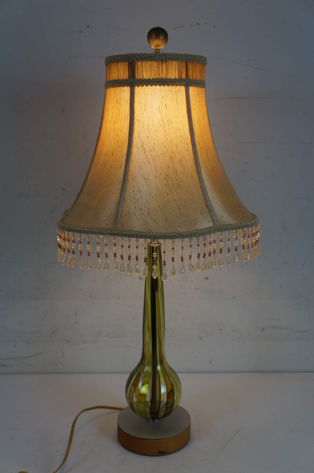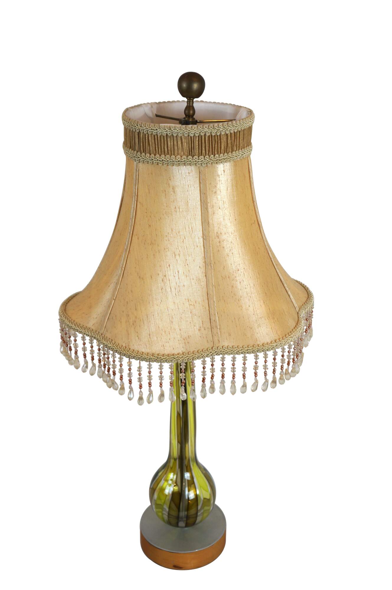Early 21st century hand blown glass table lamp - balloon shape, striped in light green and olive brown, set on a round wood and metal base. Pull chain switch. Includes harp, brass ball finial, and a golden silk shade with braided trim and beaded fringe.