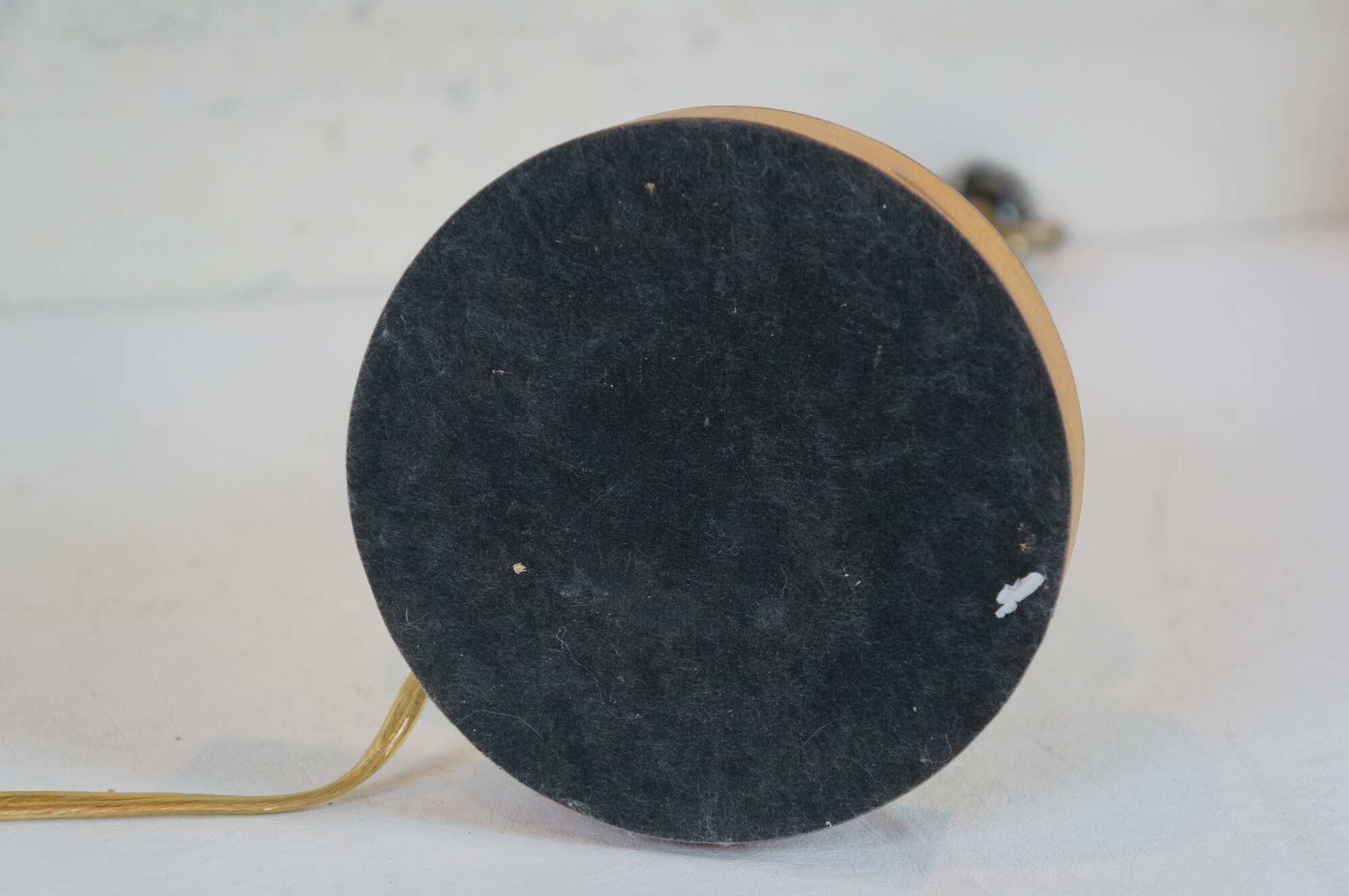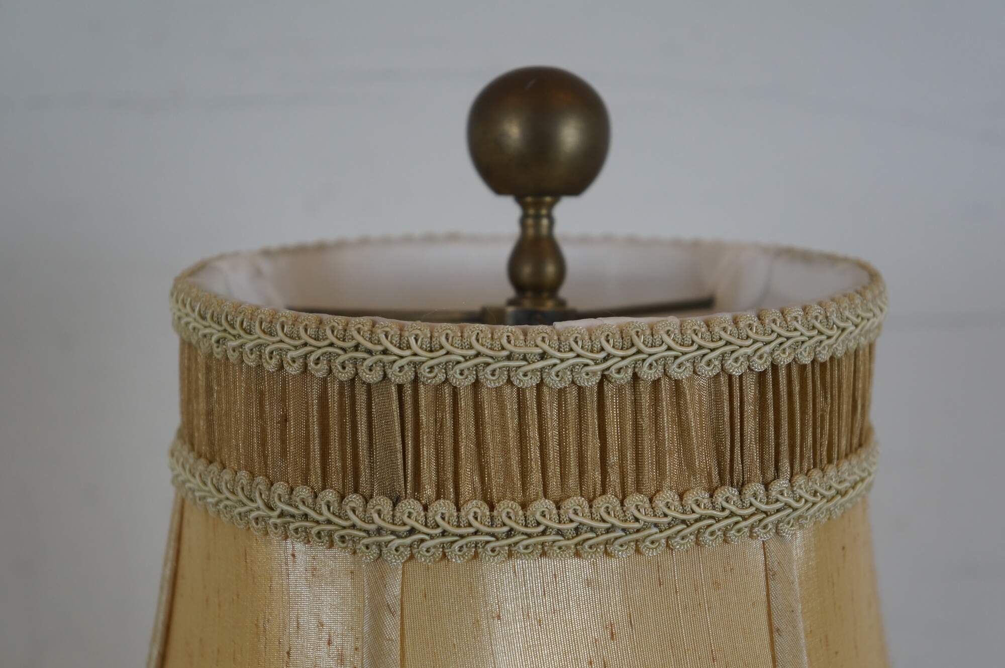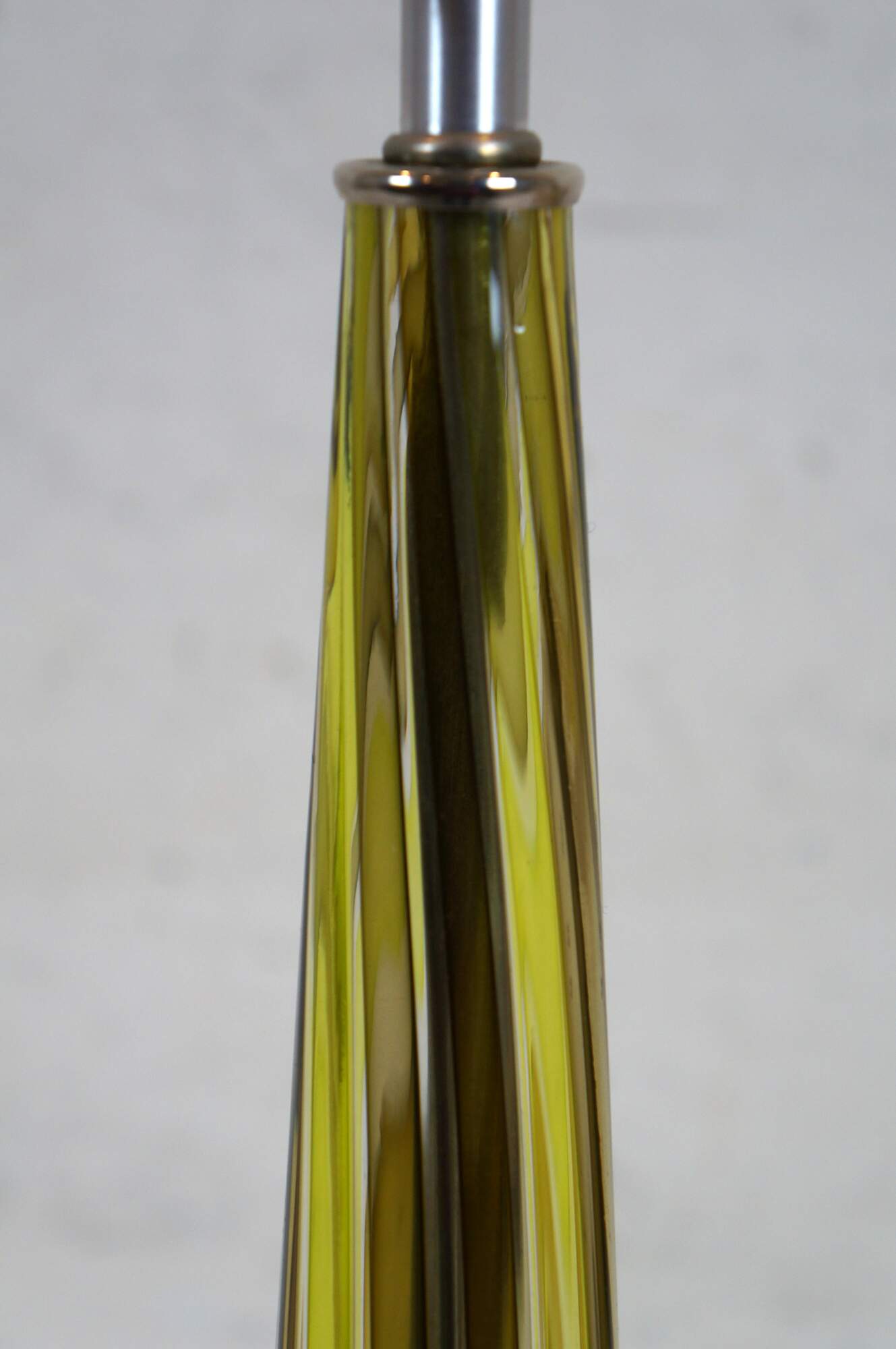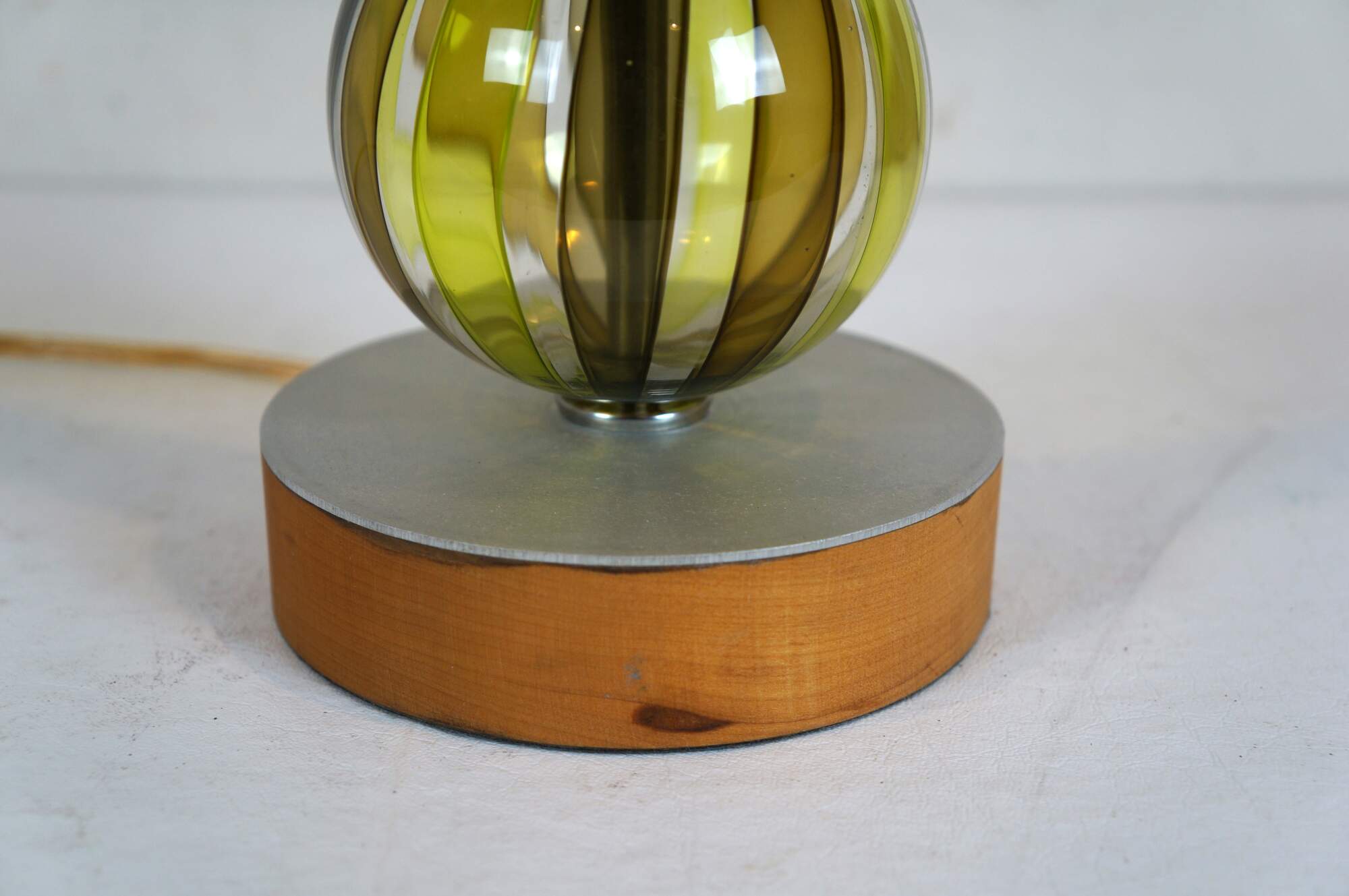 Early 21st century hand blown glass table lamp - balloon shape, striped in light green and olive brown, set on a round wood and metal base. Pull chain switch. Includes harp, brass ball finial, and a golden silk shade with braided trim and beaded fringe.