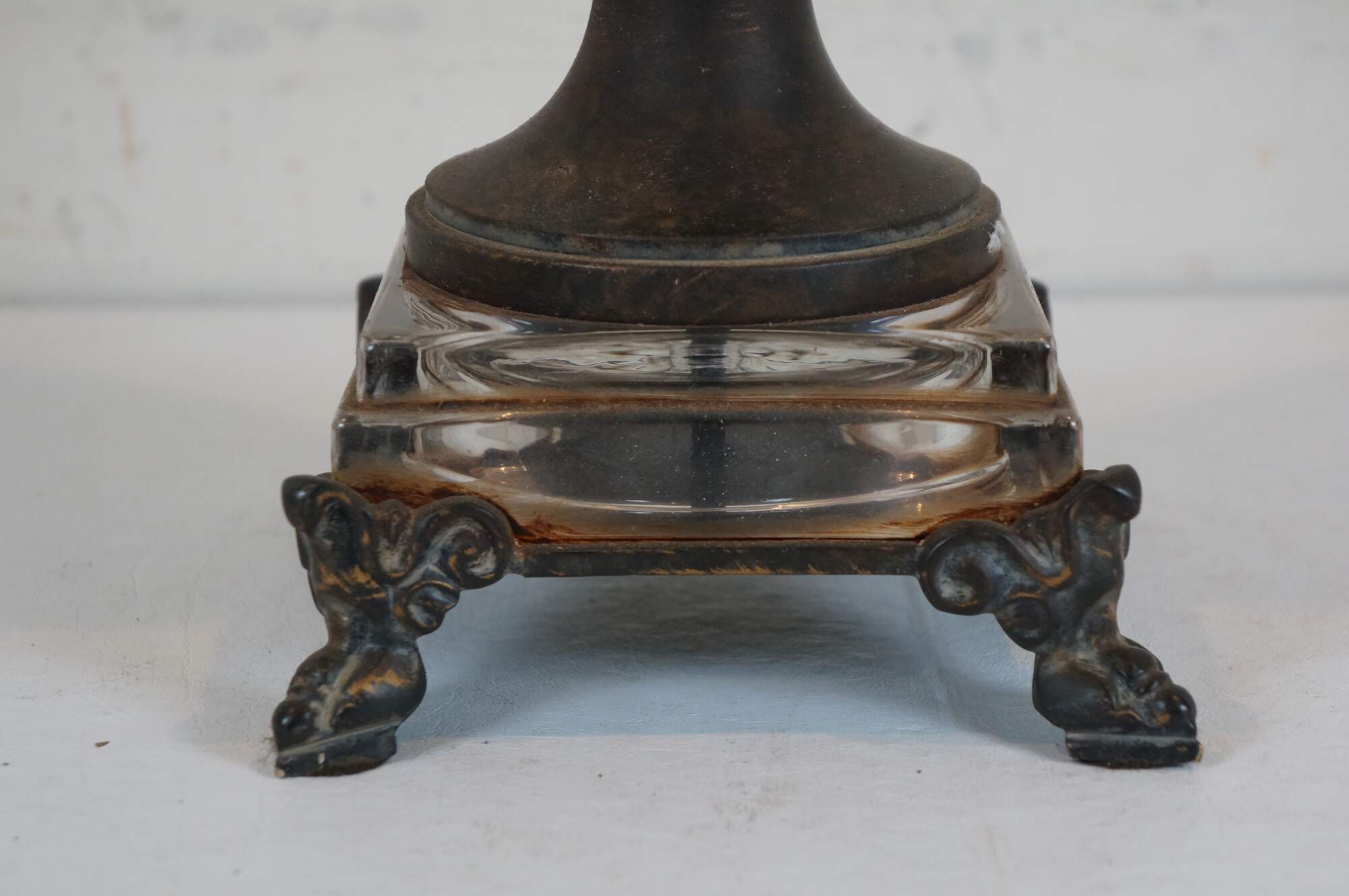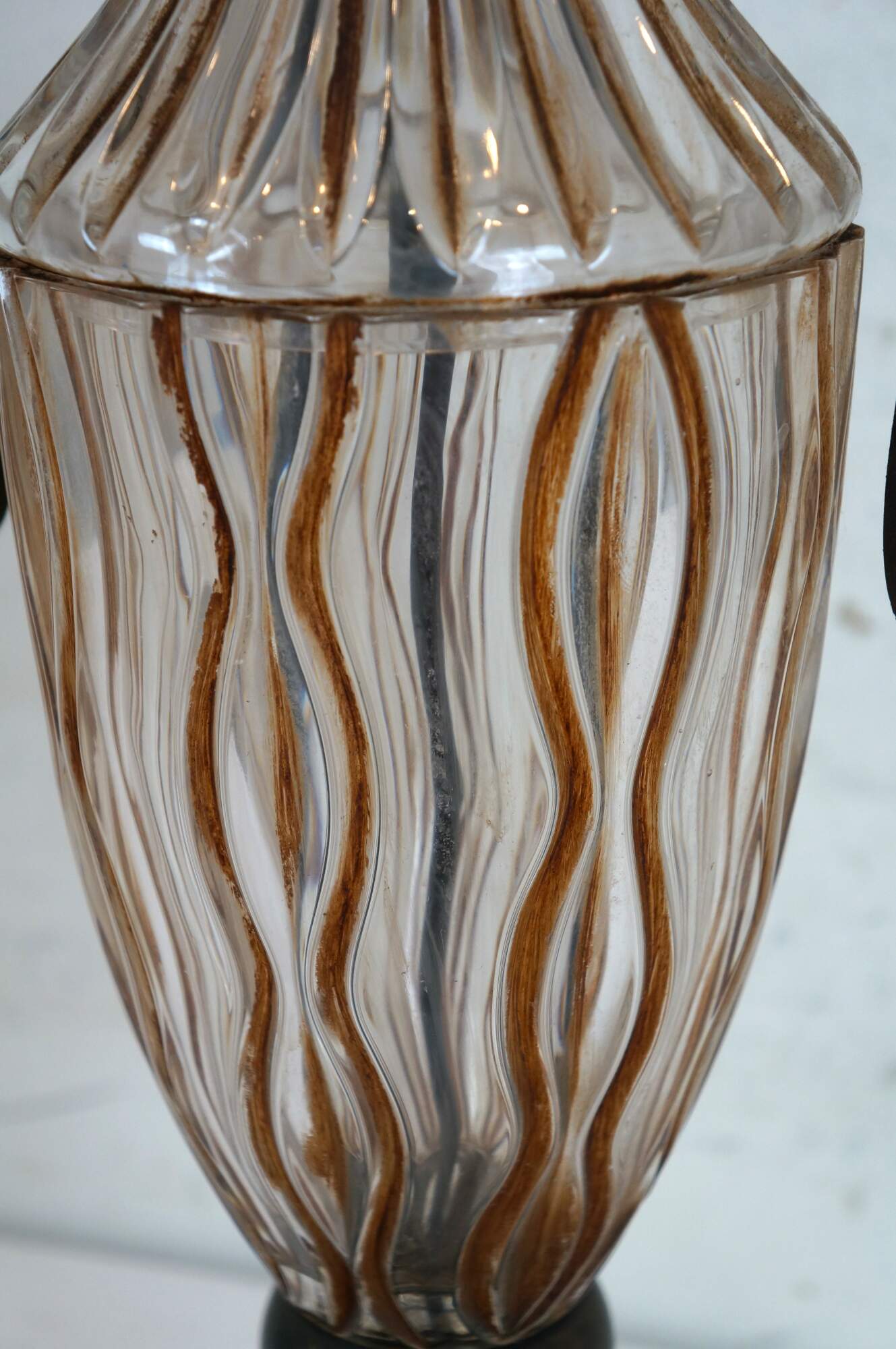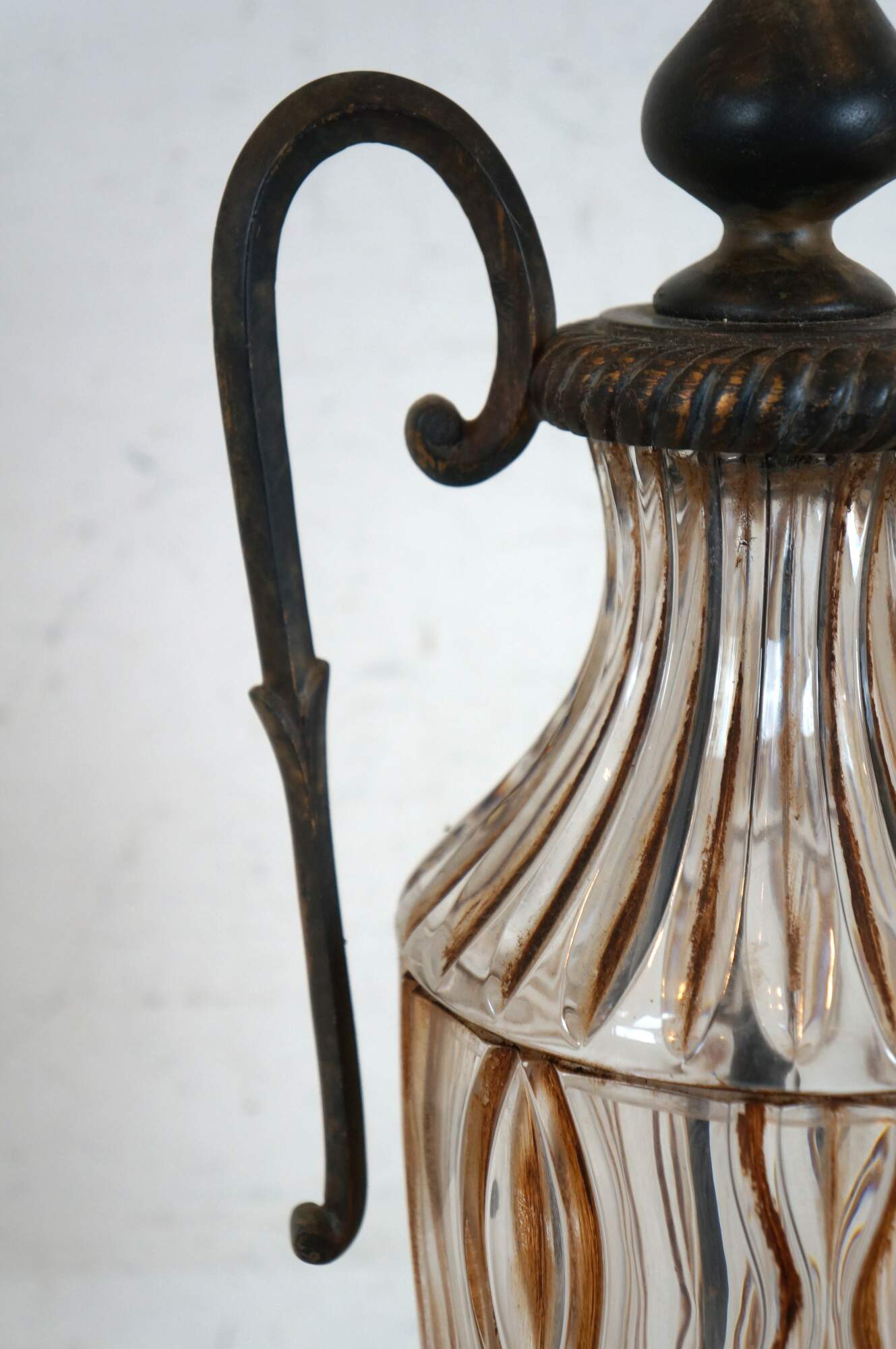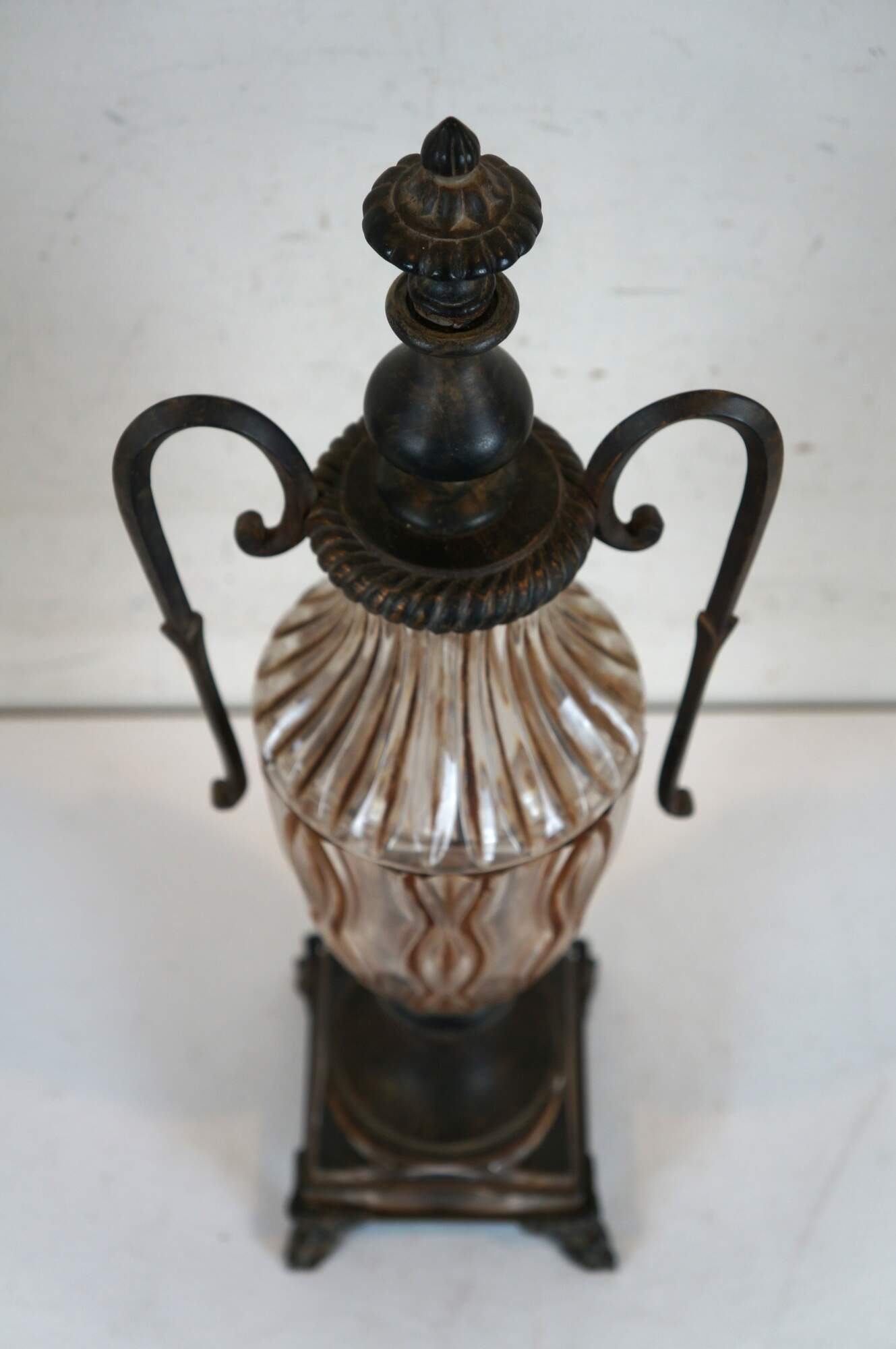 Early 21st century slender, neoclassical mantel urn, fashioned of fluted glass painted with brown accents and dark brass feet, base, top, and handles. Can be converted into a lamp.