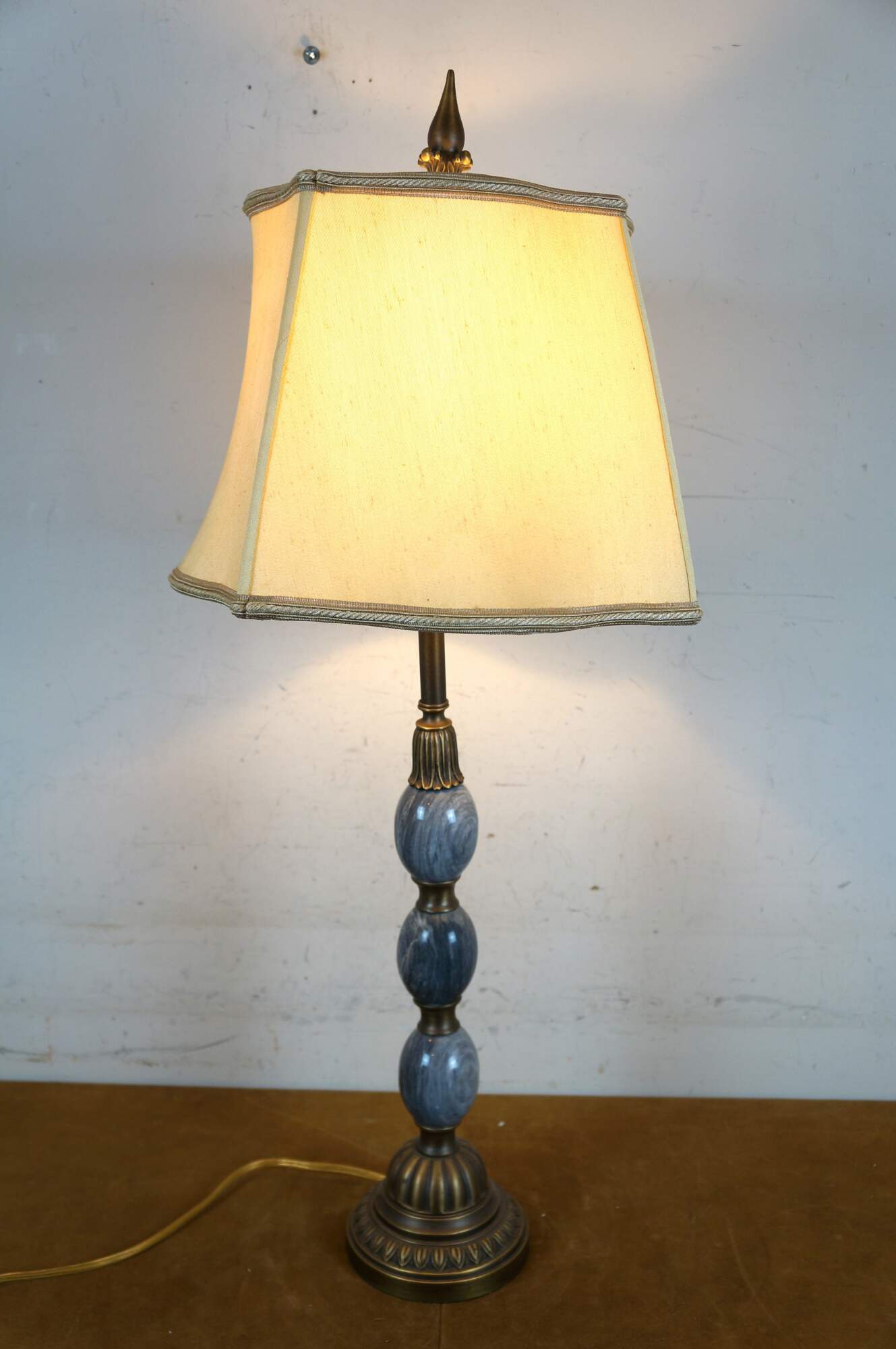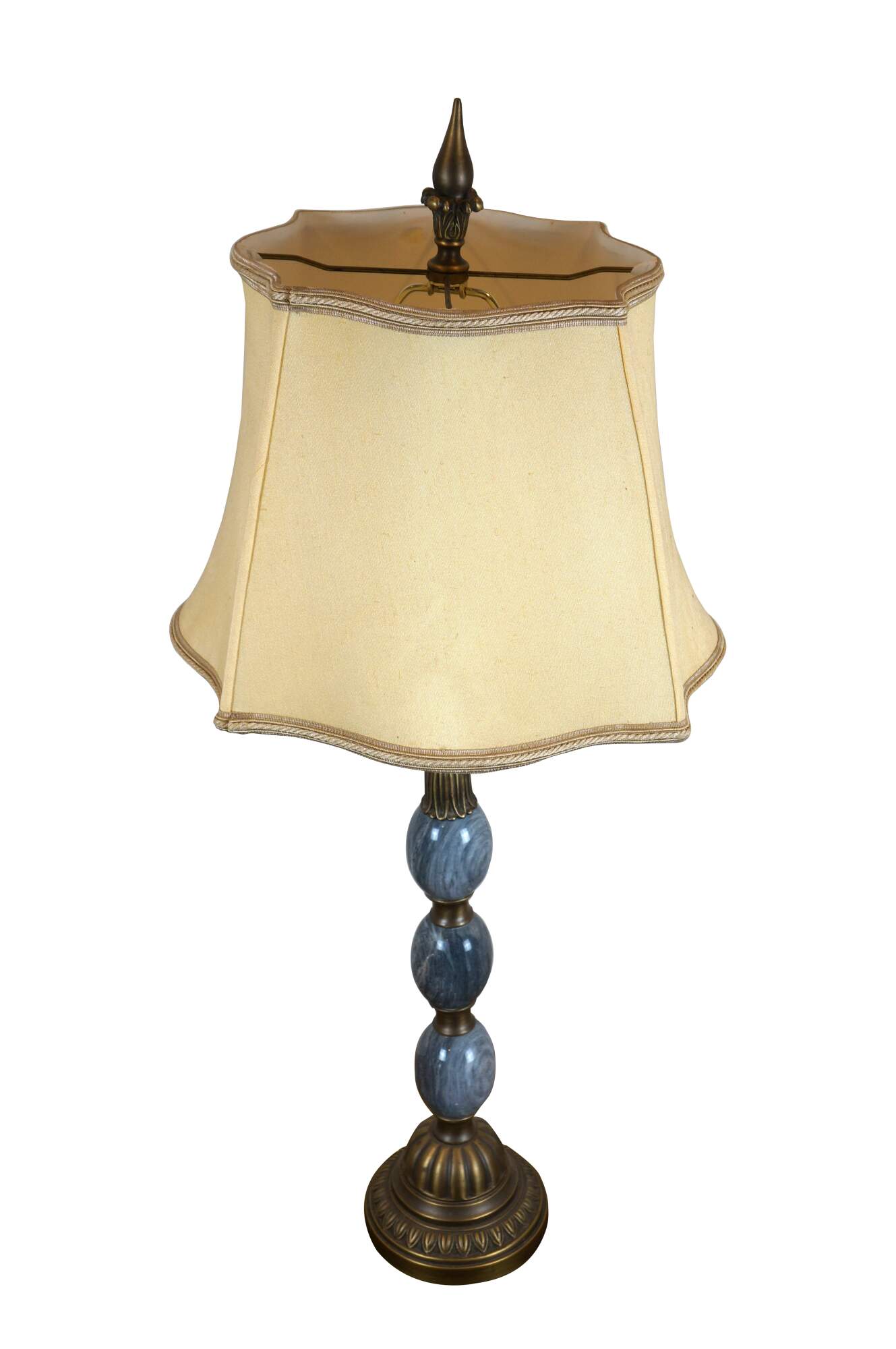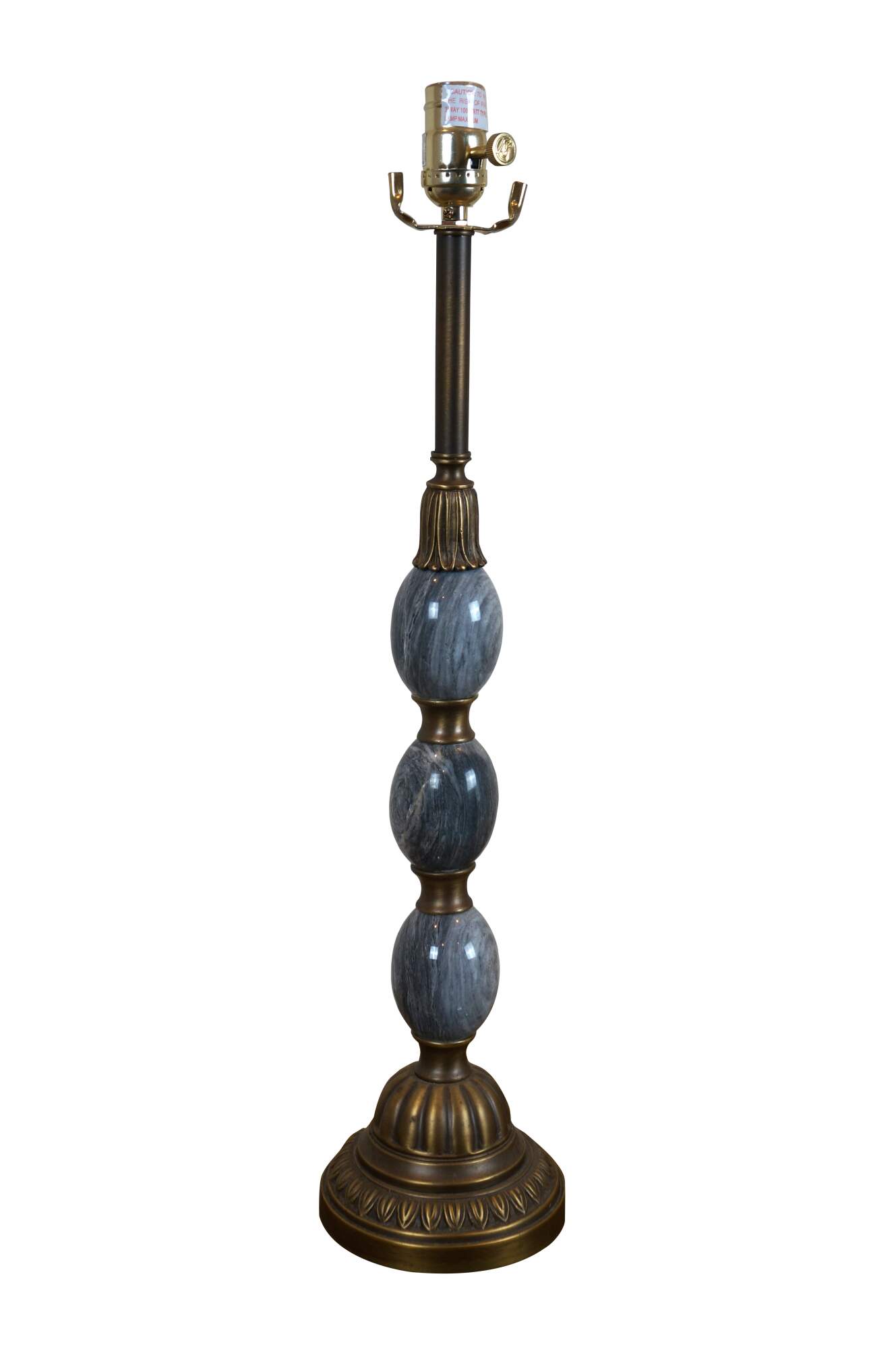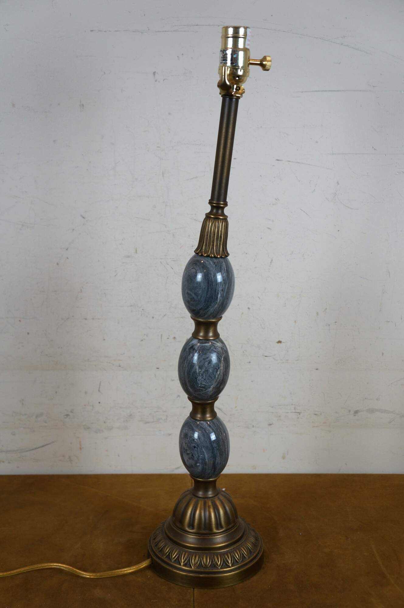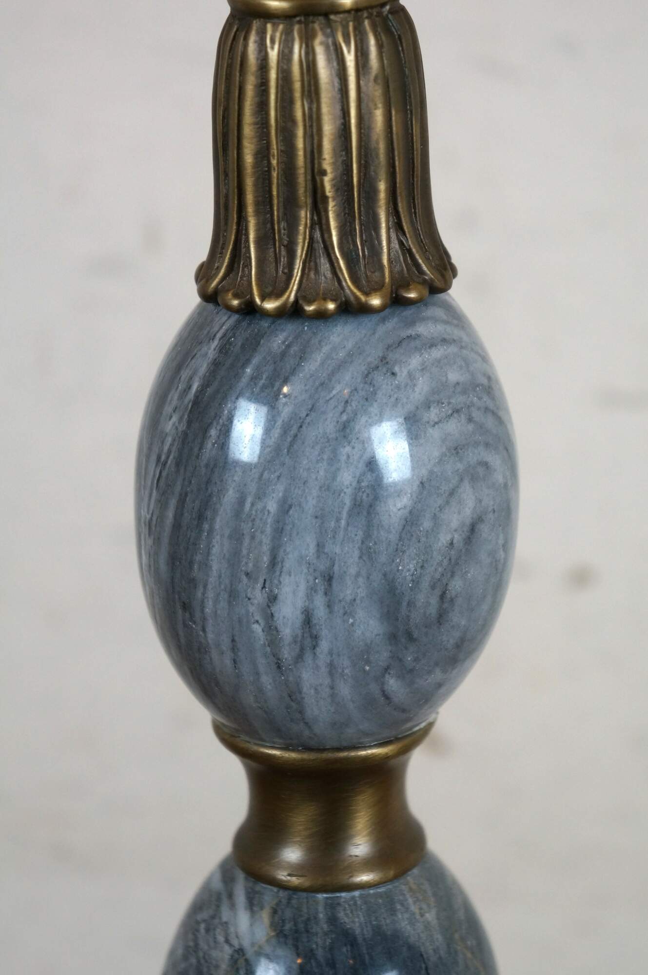 Late 20th century Maitland Smith gray marble egg and brass table lamp. Hand Made in Philippines. Includes harp, flame shaped foliate finial, and scalloped, cream colored fabric shade.