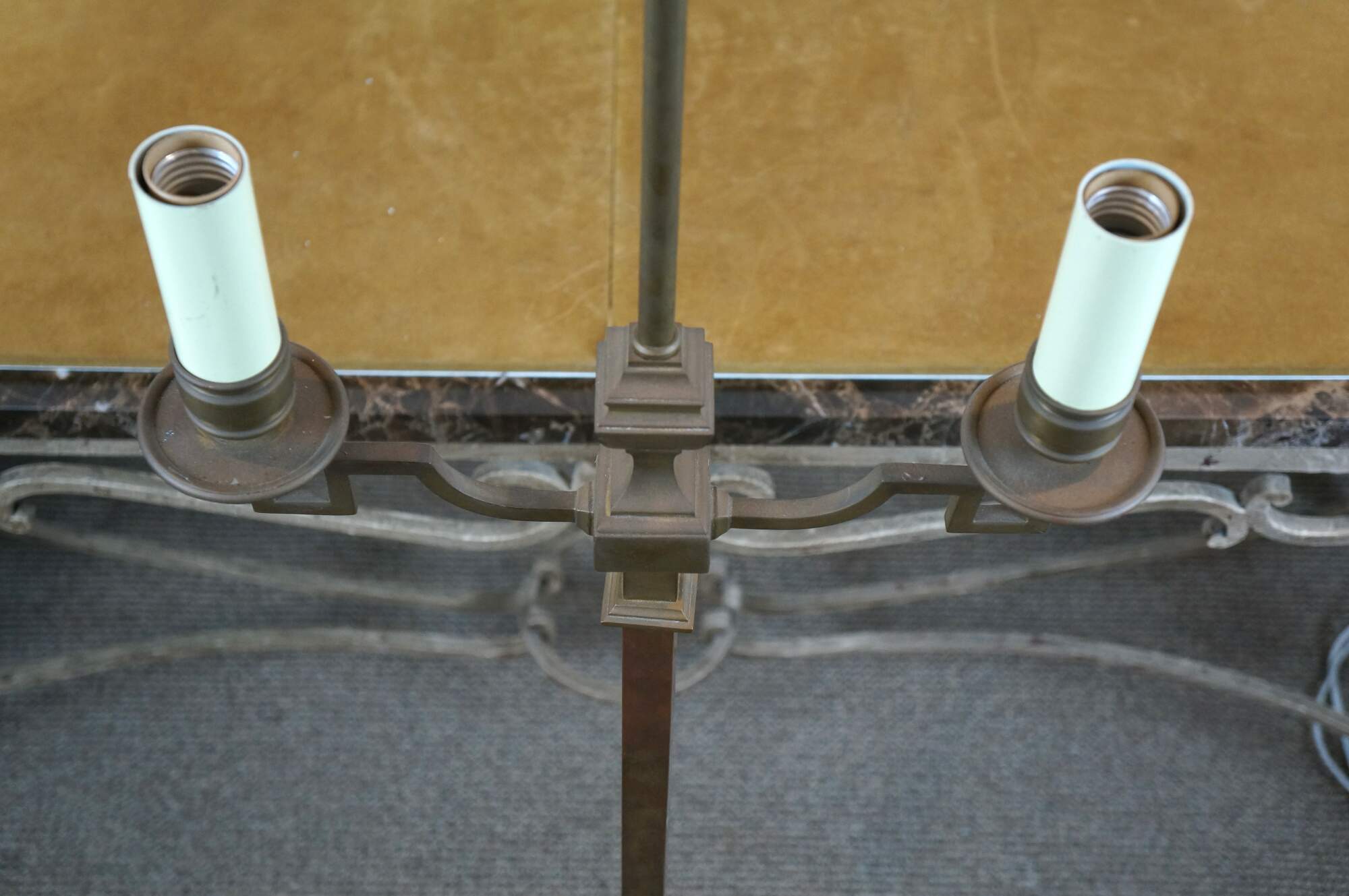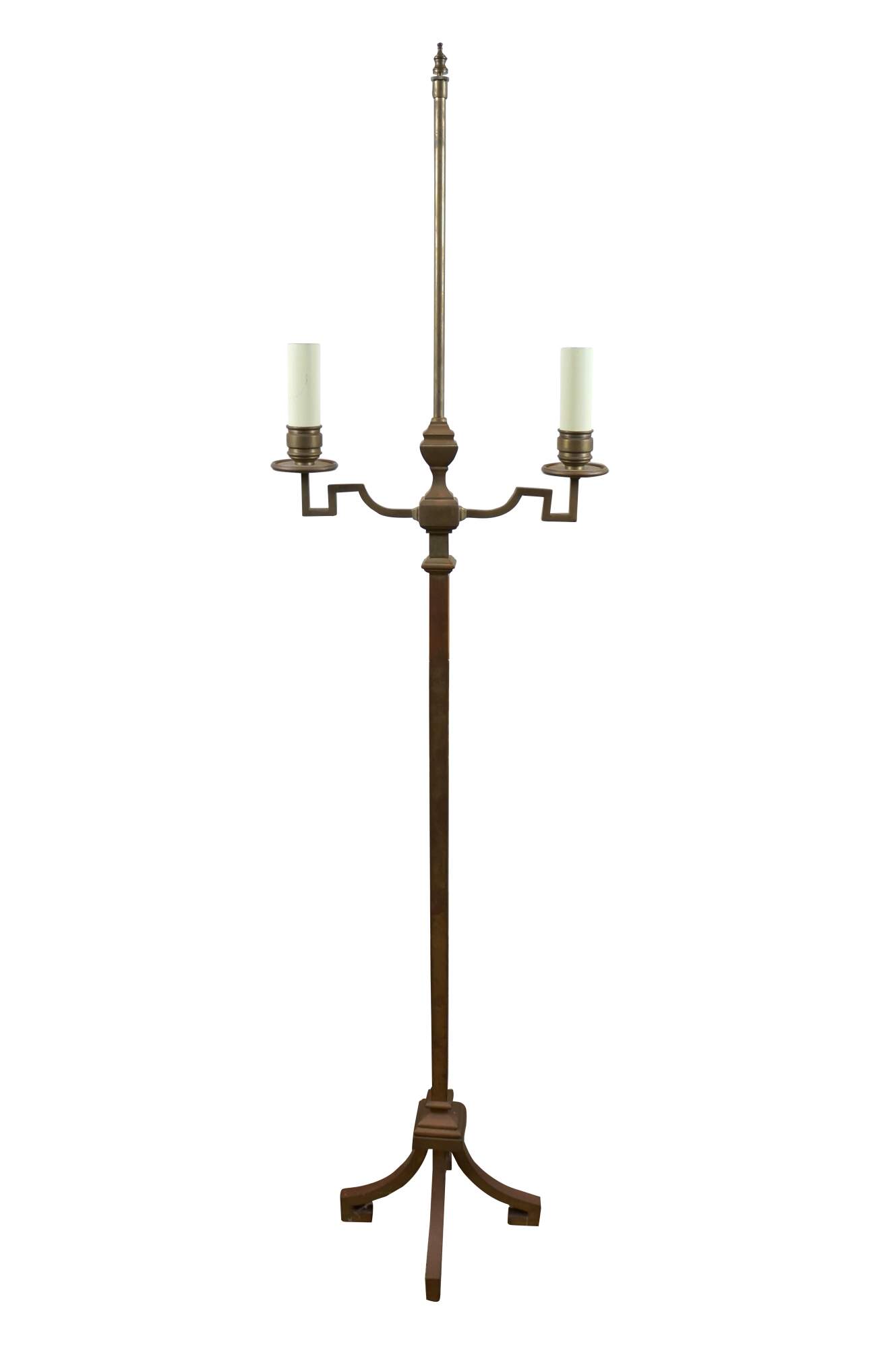 Vintage Visual Comfort / Chapman brass floor lamp featuring a geometric four footed base and two arm faux candleabra top, with height adjustable stem supporting the black paper shade. Dimmable switch.