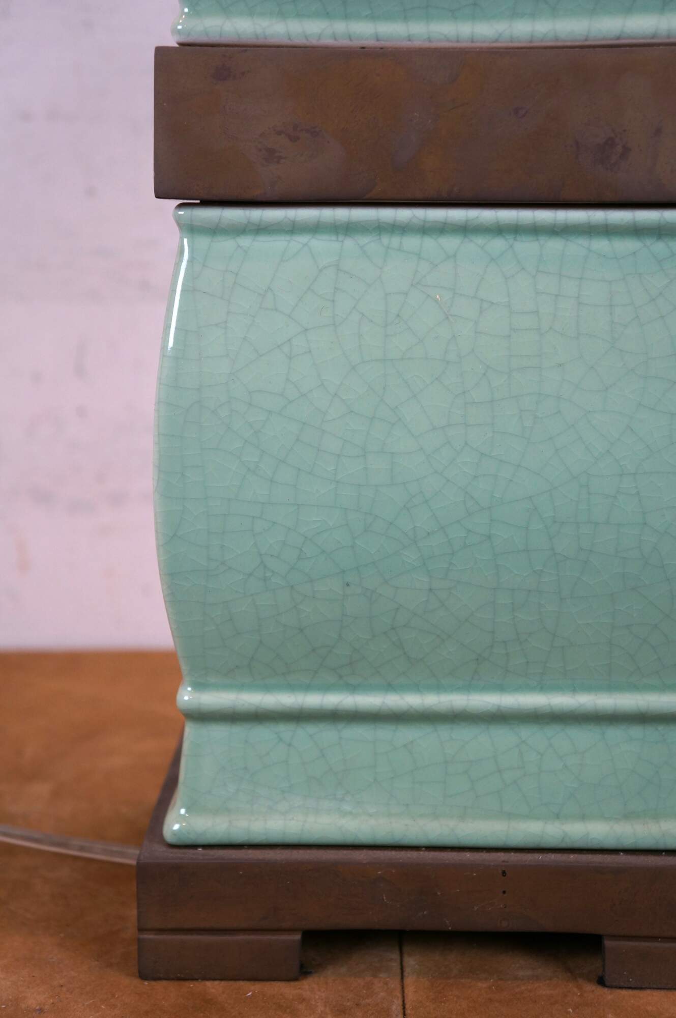 Pair of 2009 Visual Comfort & Co / Chapman table lamps, choiserie styled stacked effect of brass and celadon green porcelain. Dimmable switch. Includes harp, brass ball finial, and black paper shade with reflective interior.