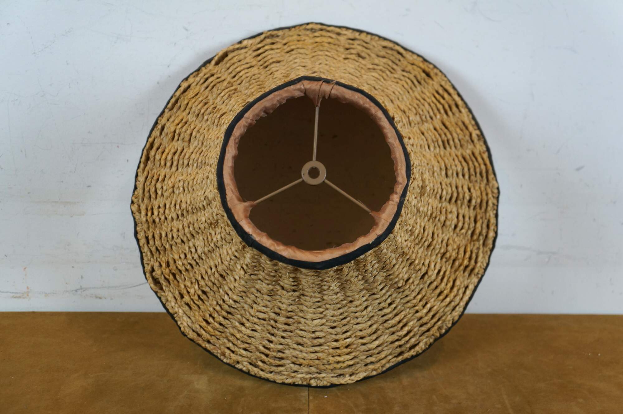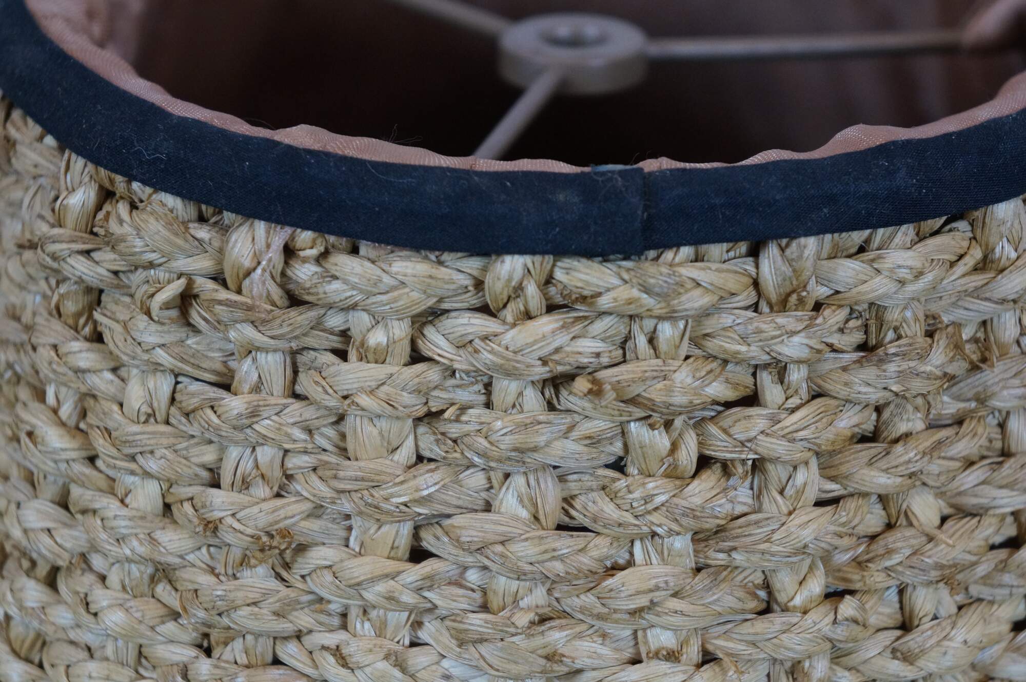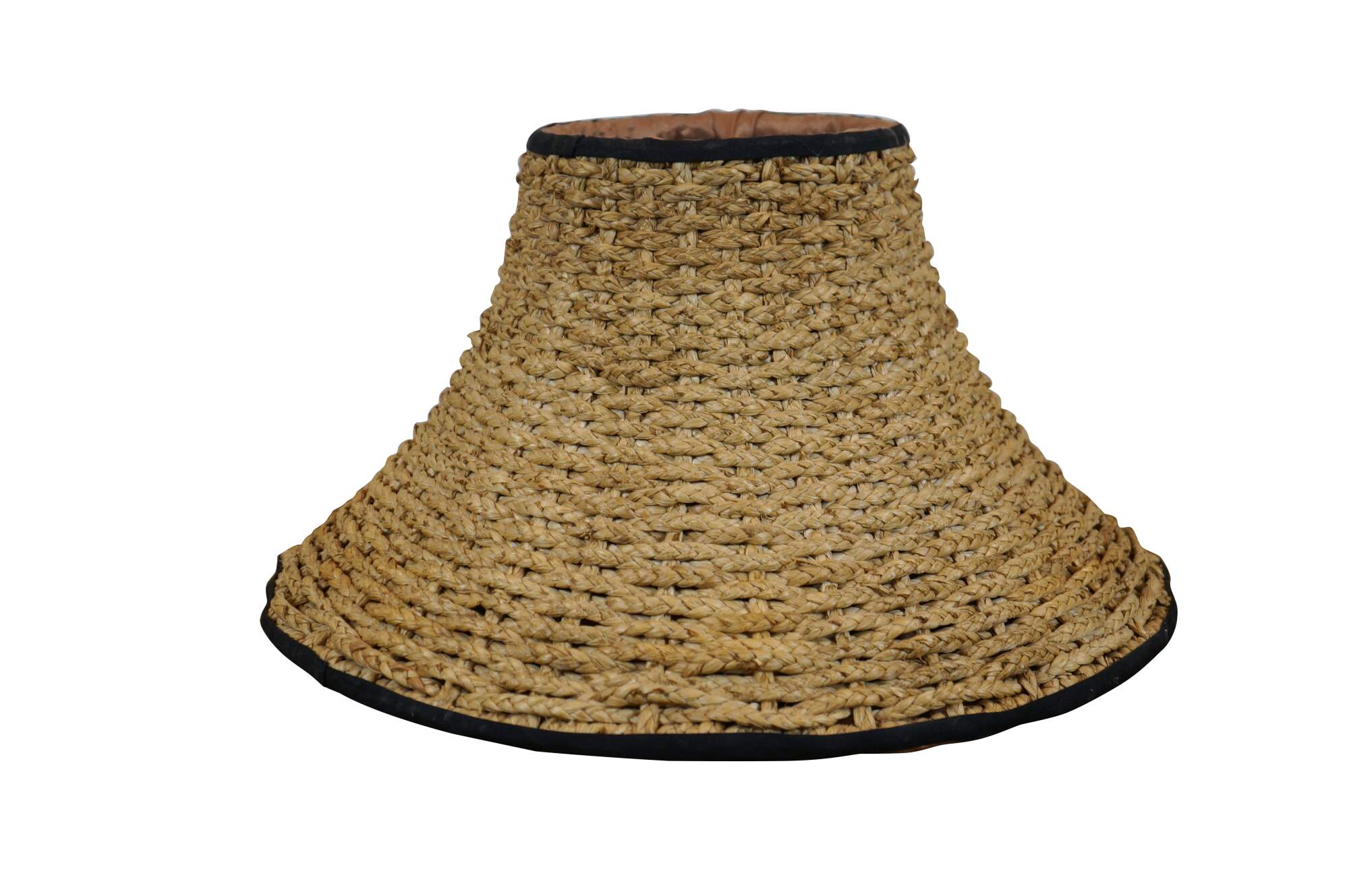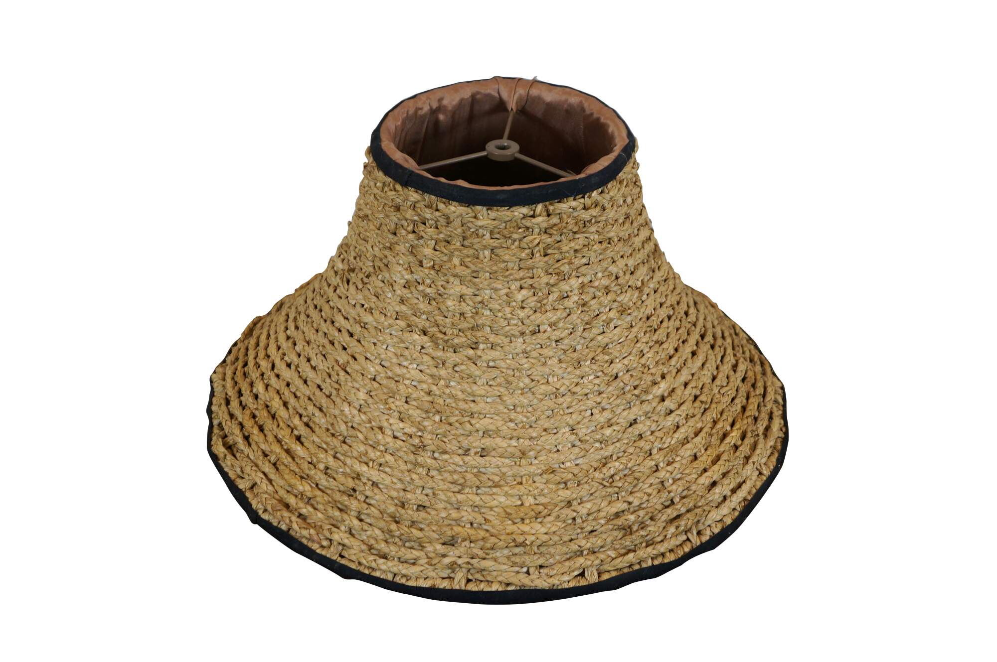 Late 20th century bell shaped lamp shade crafted of woven / braided rattan, trimmed with black cotton borders and apricot silk lining.