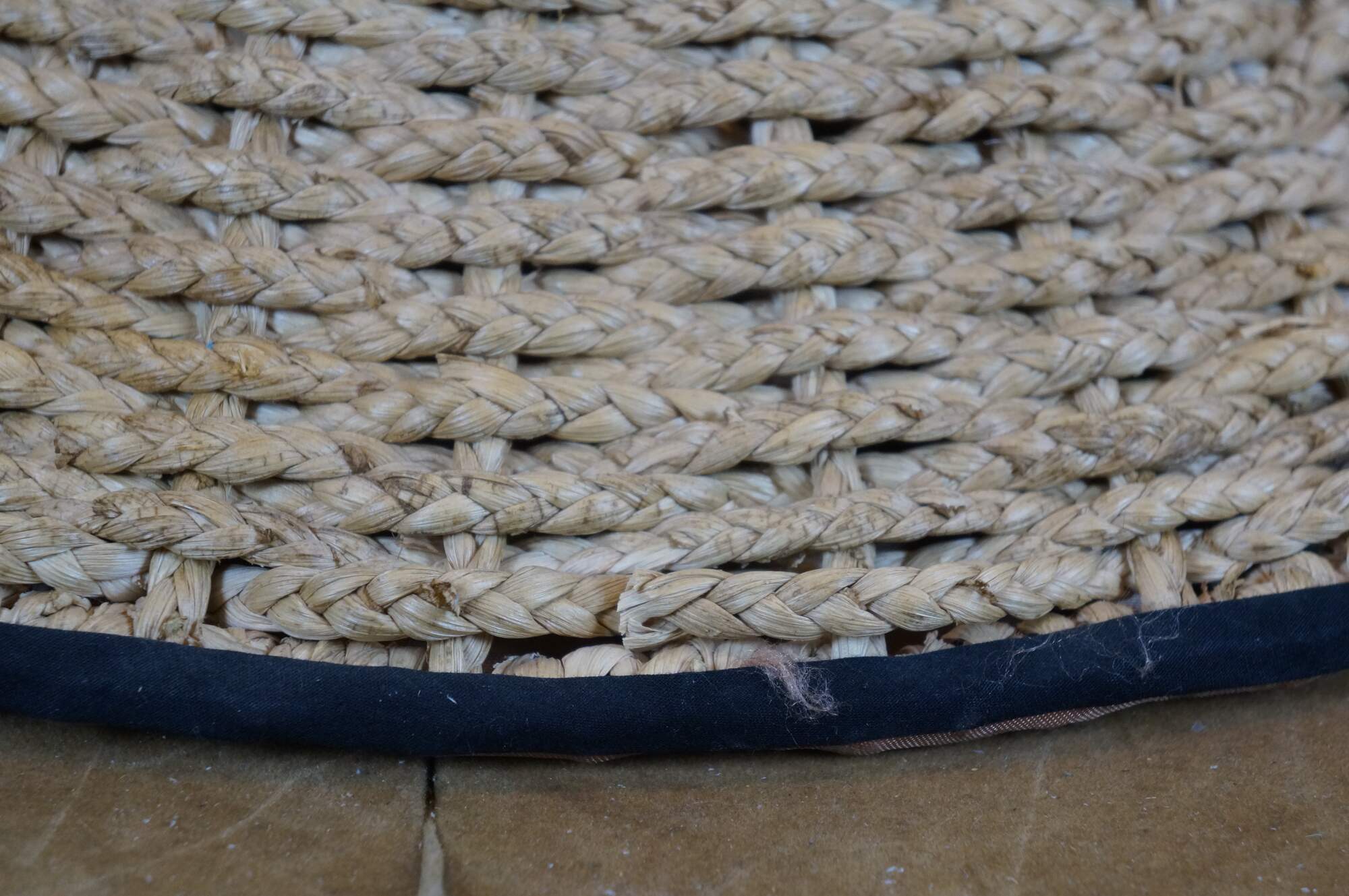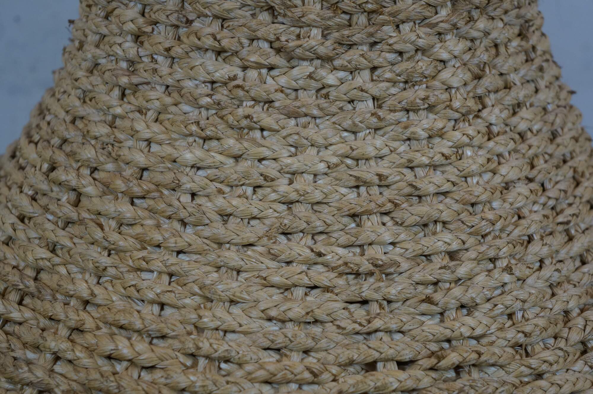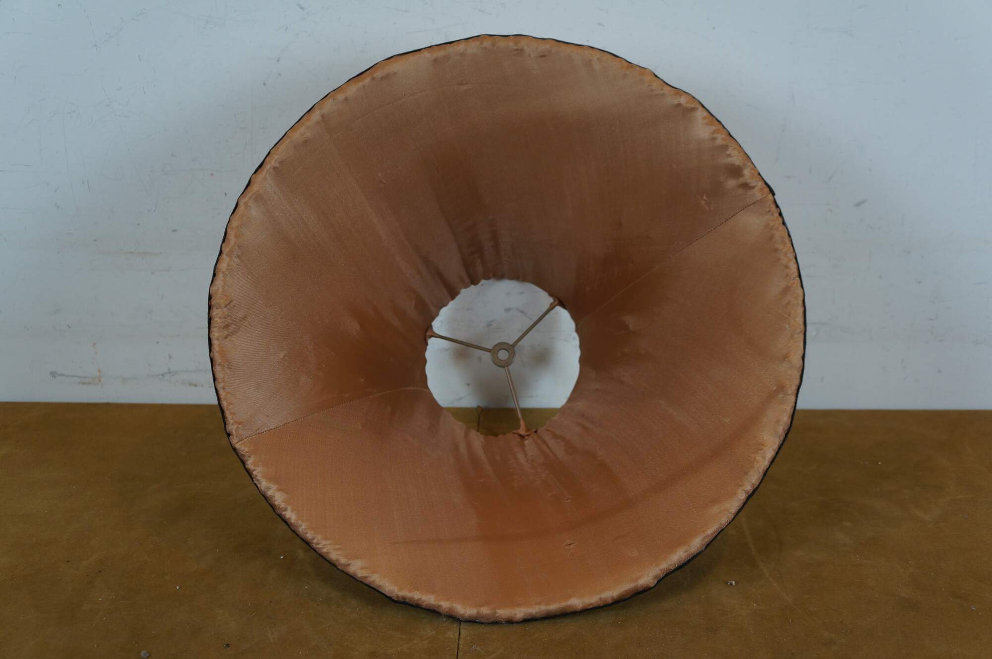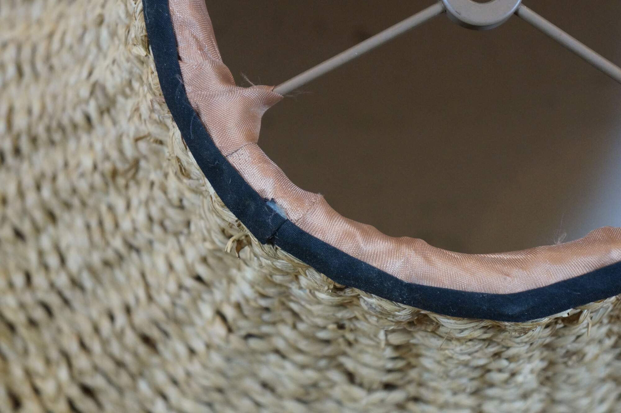 Late 20th century bell shaped lamp shade crafted of woven / braided rattan, trimmed with black cotton borders and apricot silk lining.
