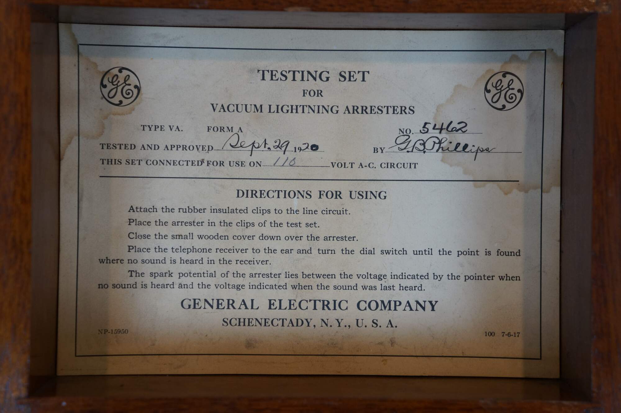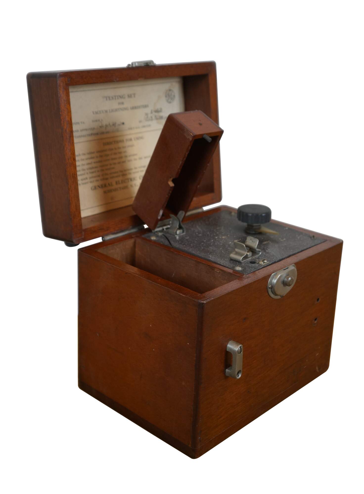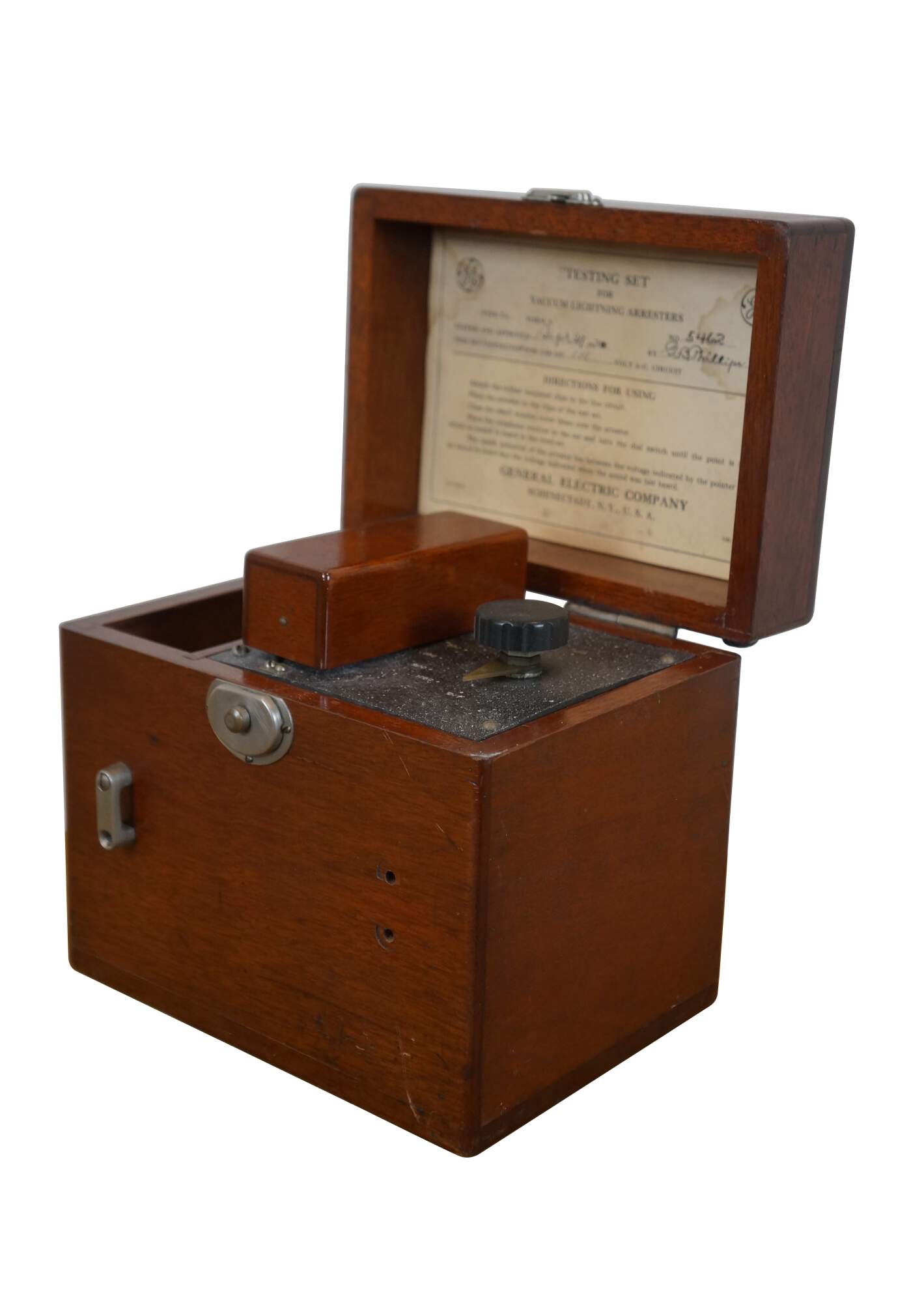 Antique 1920 Testing Set for Vacuum Lightning Arresters - Type VA - Form A - No 5462 - General Electric Company, Schenectady, NY, USA. Wood case, Bakelite top.