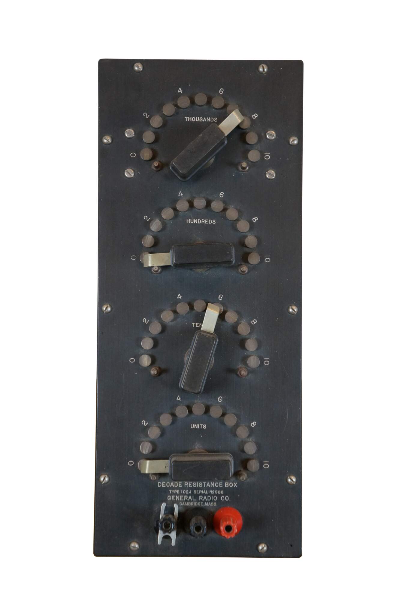 "General Radio Company (later, GenRad) was a broad-line manufacturer of electronic test equipment in Massachusetts, U.S. from 1915 to 2001. During the middle of 20th century, they were a major competitor to Hewlett-Packard and Tektronix. On June 14, 1915, Melville Eastham and a small group of investors started General Radio Company in Cambridge, Massachusetts, a few blocks northwest of Massachusetts Institute of Technology. During the 1950s, the company moved to West Concord, Massachusetts, where it became a major player in the automatic test equipment (ATE) business, manufacturing a line of testers for assembled printed circuit boards. It also produced extensive lines of electrical component measuring equipment, sound and vibration measurement and RLC standards. In 1975, the company name was changed to GenRad. In 1991, a startup QuadTech was founded as spinoff of GenRad's Instrumentation division and Precision Product lines, as well as the rights to use the "GenRad" and "General Radio" names. In 2000, IET Labs acquired from QuadTech the GenRad RLC standards, impedance decades, megohmmeters, digibridges, audio lines, stroboscope lines. Then in 2005 IET Labs purchased the Digibridge and Megohmmeter lines, which continue to be manufactured in West Roxbury, Massachusetts. In 2001, Teradyne acquired the GenRad board test system lines, which were relocated to Teradyne's corporate campus in North Reading, Massachusetts. Among General Radio's accomplishments over the years have been: The introduction of one of the world's first portable oscilloscopes. The production of many high-precision standards for inductance, resistance, and capacitance. The production of the stroboscope as the Strobotac. The production of the sound level meter. The Variac variable autotransformer, which was a U.S. trademark of General Radio from 1934 to 2001. Invention of the "five-way" binding post connector. Invention of the GR connector." (Source: Wikipedia)