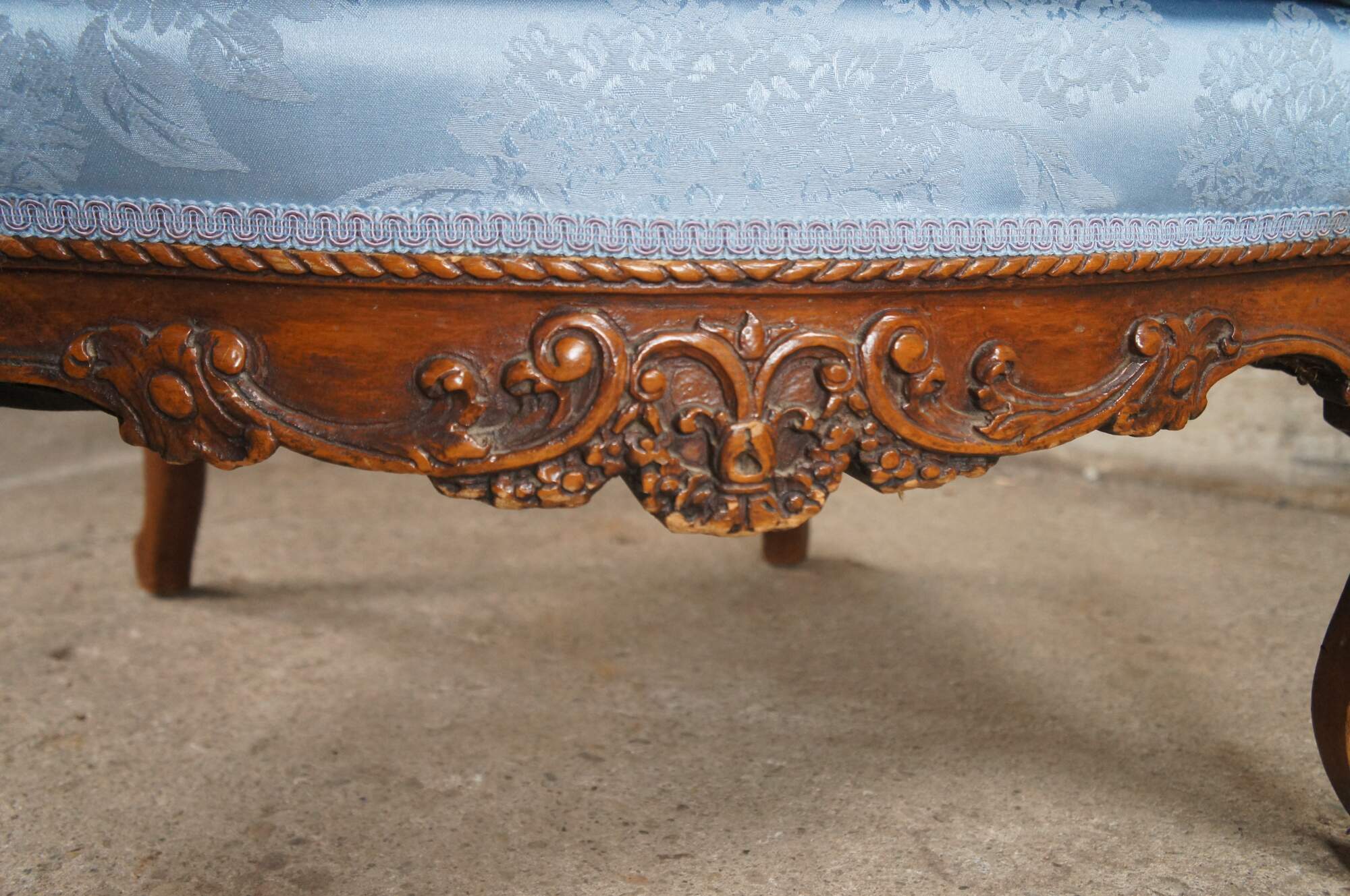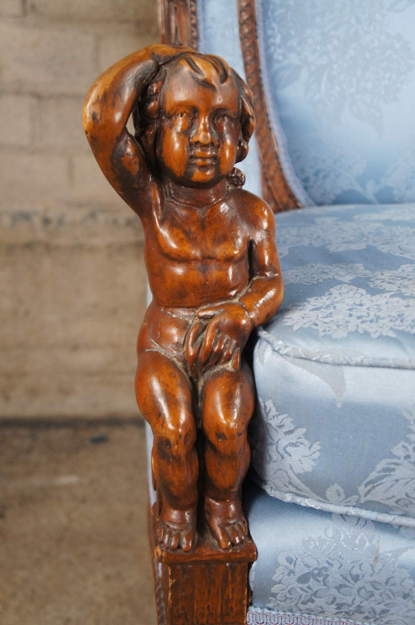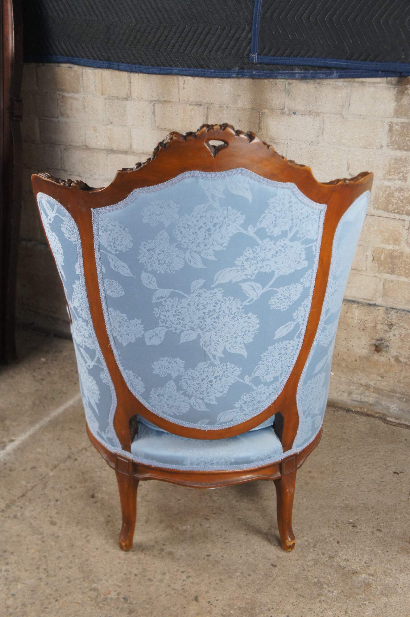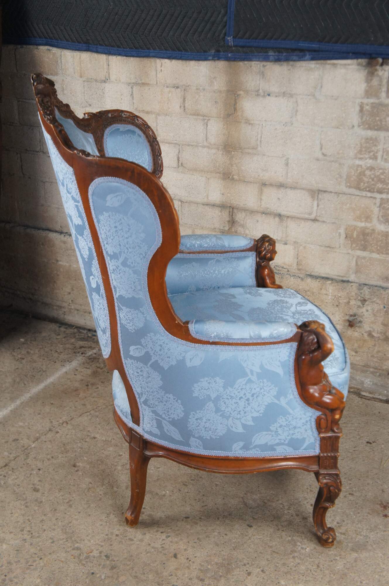 Antique French Louis XVI style Bergère library wingback reading chair, circa 1890-1910. Made from walnut with a striking pediment featuring a quiver, arrows and torch amongst roses and ribboning. The pediment is set over a three-part silk upholstered back, carved with acanthus leaf, interlaced or twisted detail and egg and dart design. Features a padded seat set between apposing figural putto figures, intricately carved with hand resting over head. Lower apron is carved with scrolling foliate between cabriole legs with acanthus carved knees. The blue silk fabric showcases a chrysanthemum pattern. A truly remarkable specimen that will make a statement in any setting.