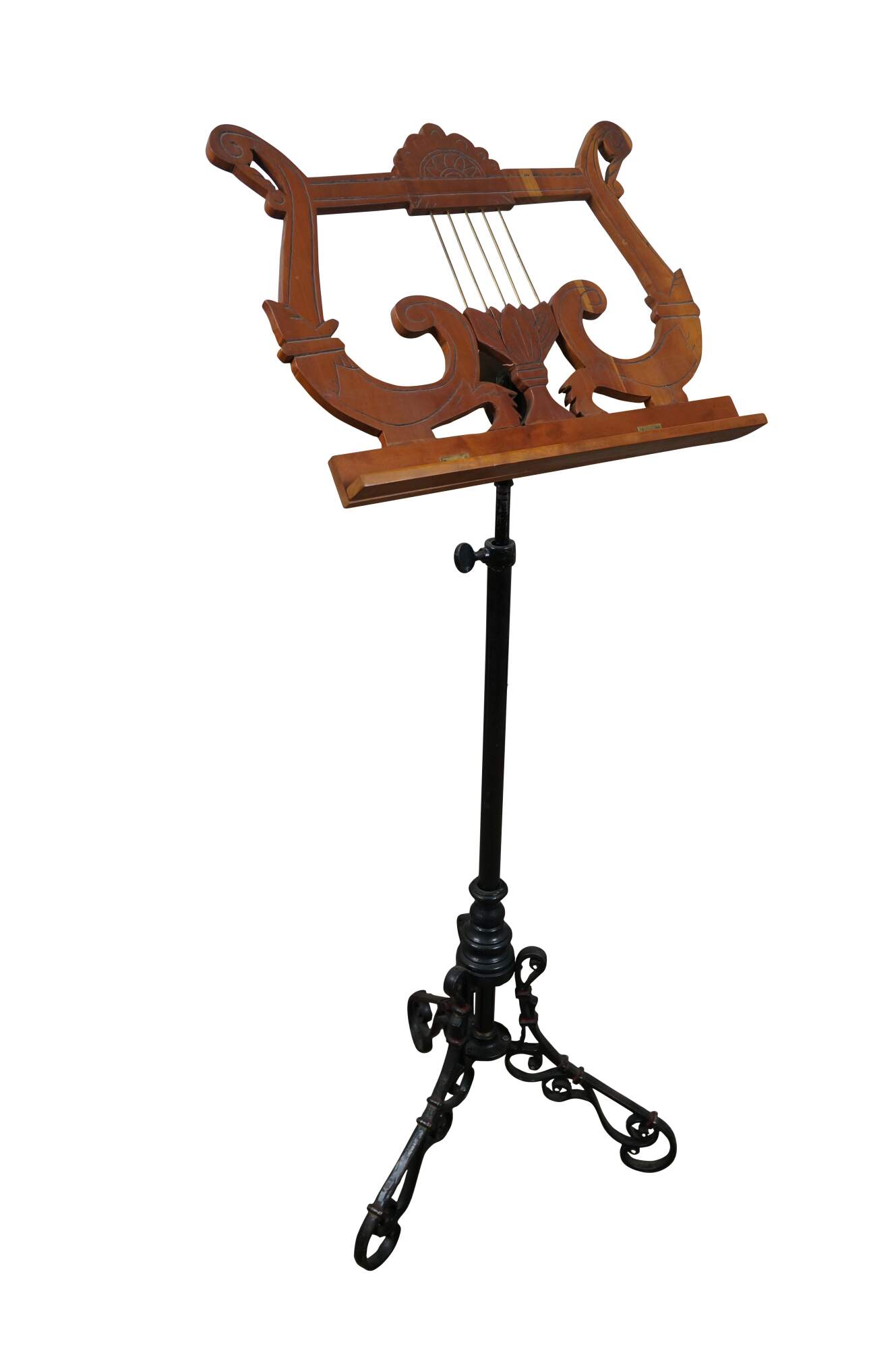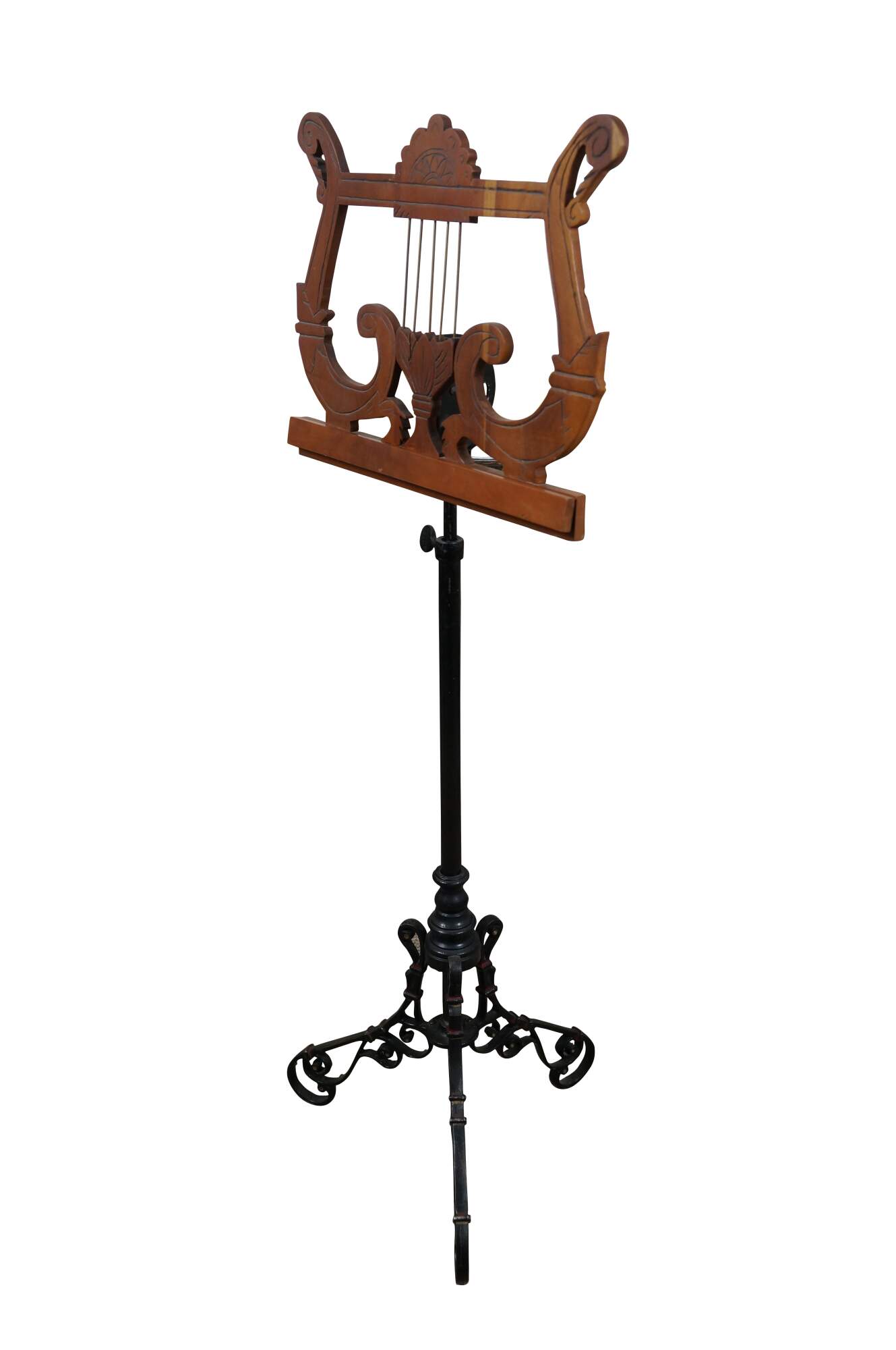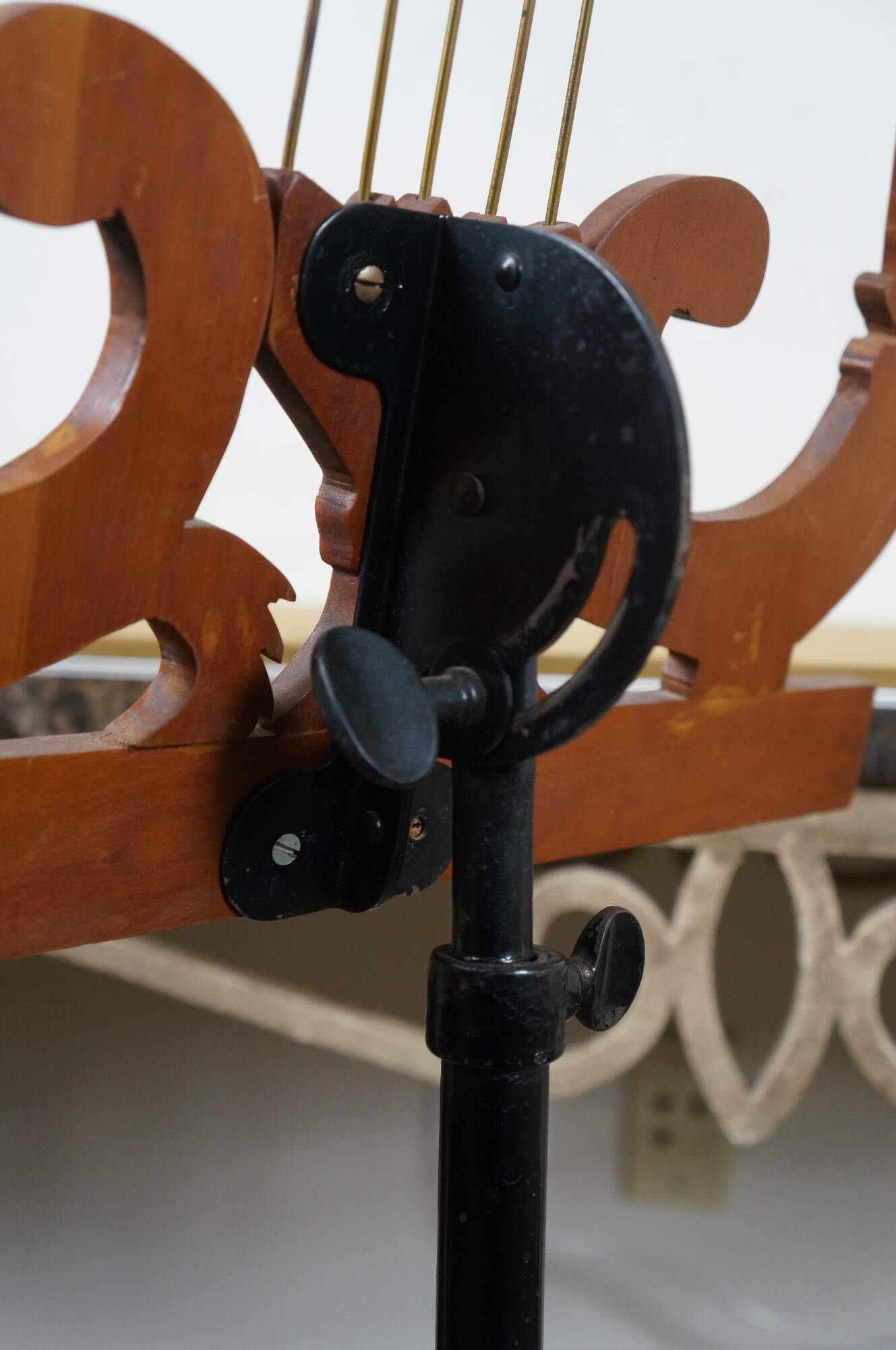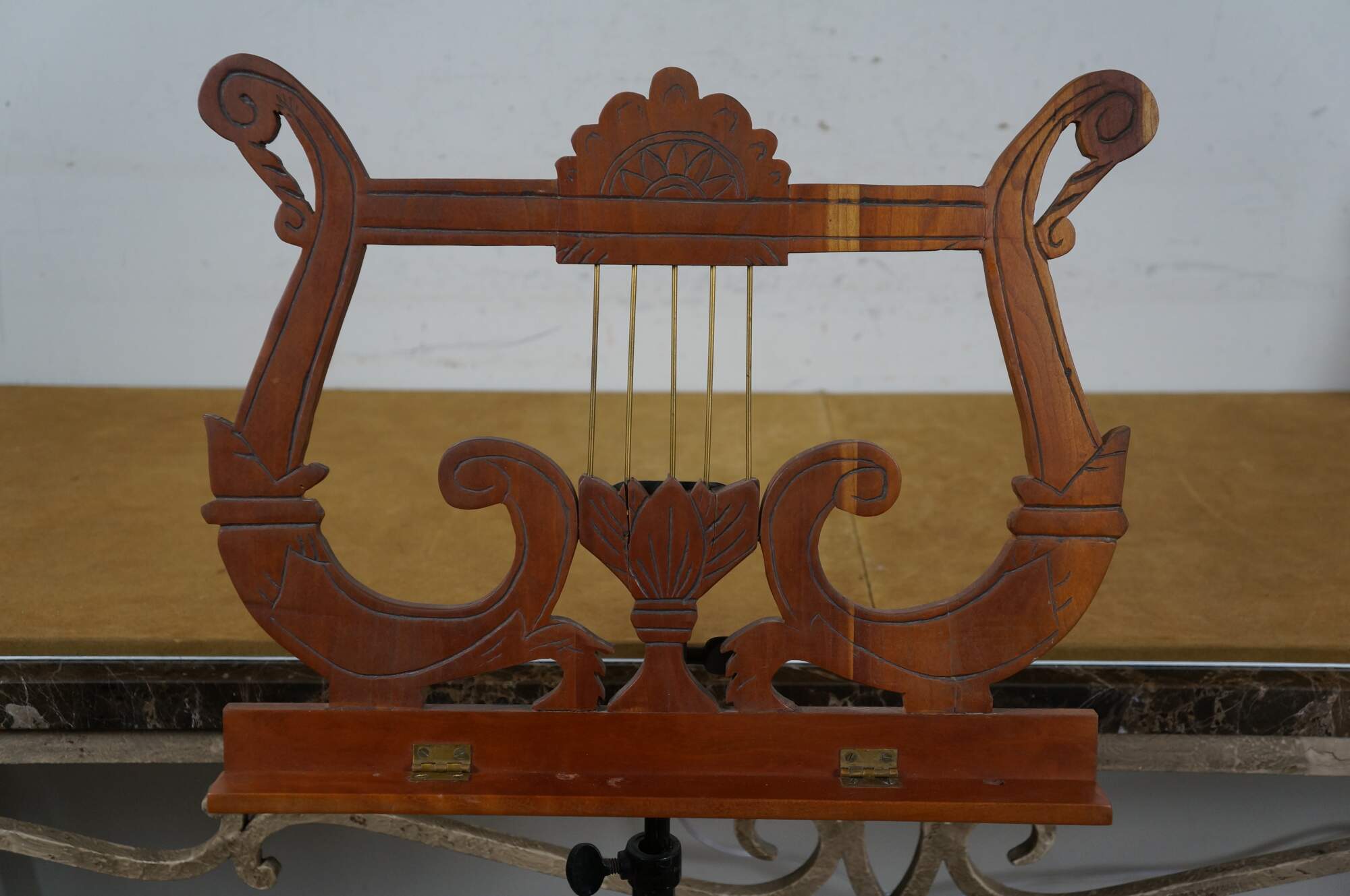 Mid century music stand featuring a black painted wrought iron tripod base and a mahogany music holder, elegantly carved in the shape of an ornate lyre. Music tray hinges upward for more streamlined storage. Angle of lyre and height of stand are both fully adjustable.