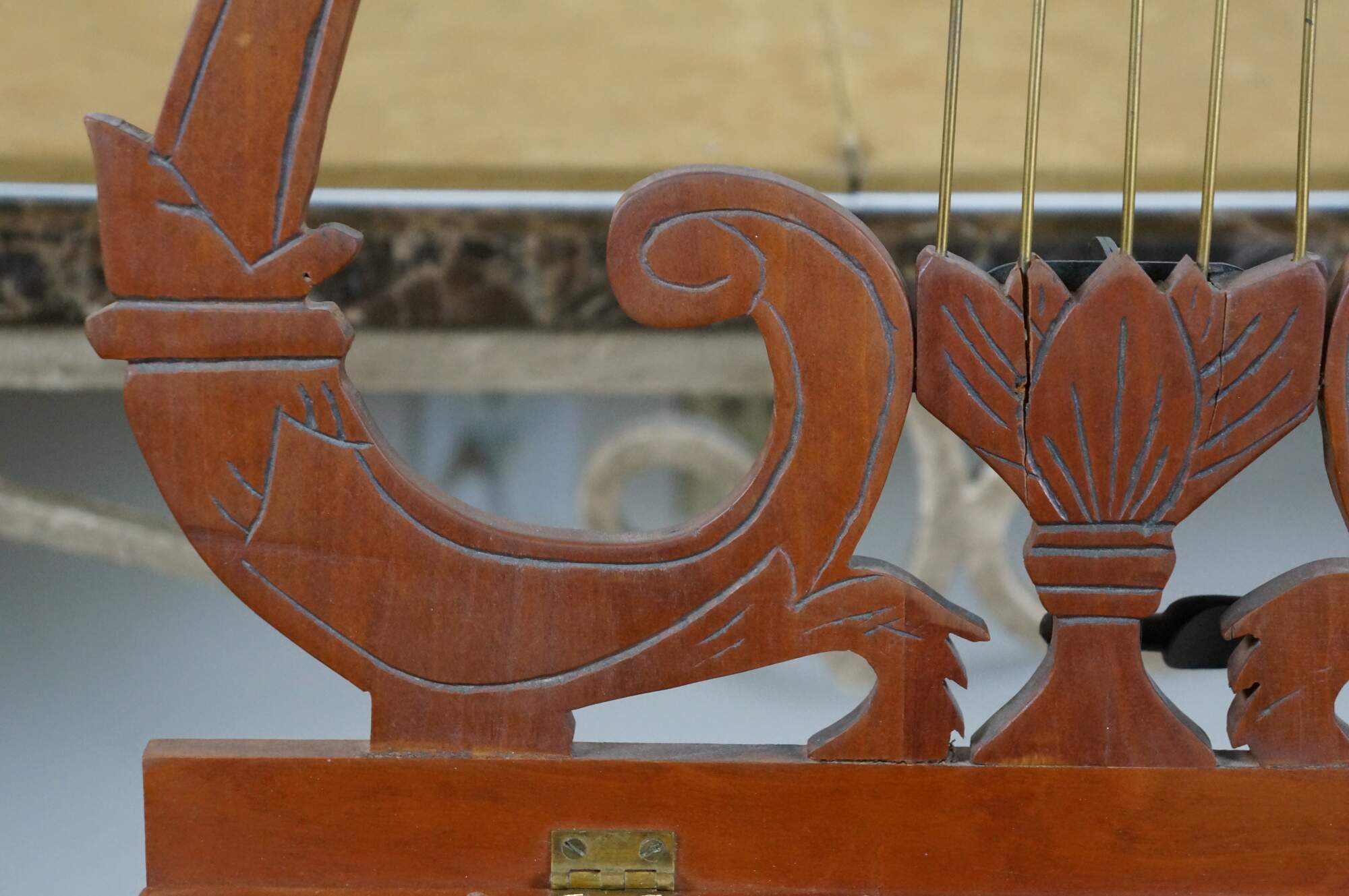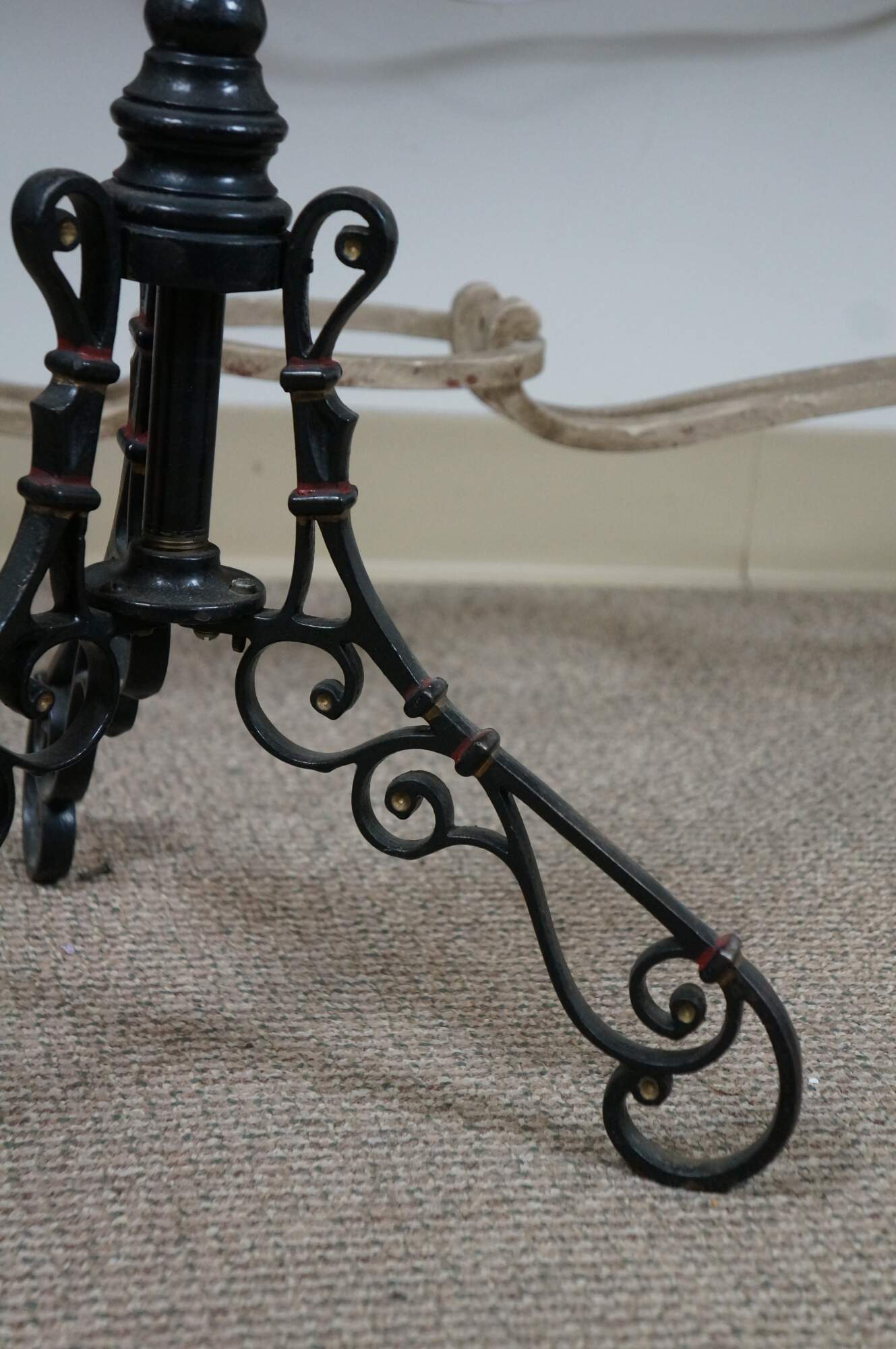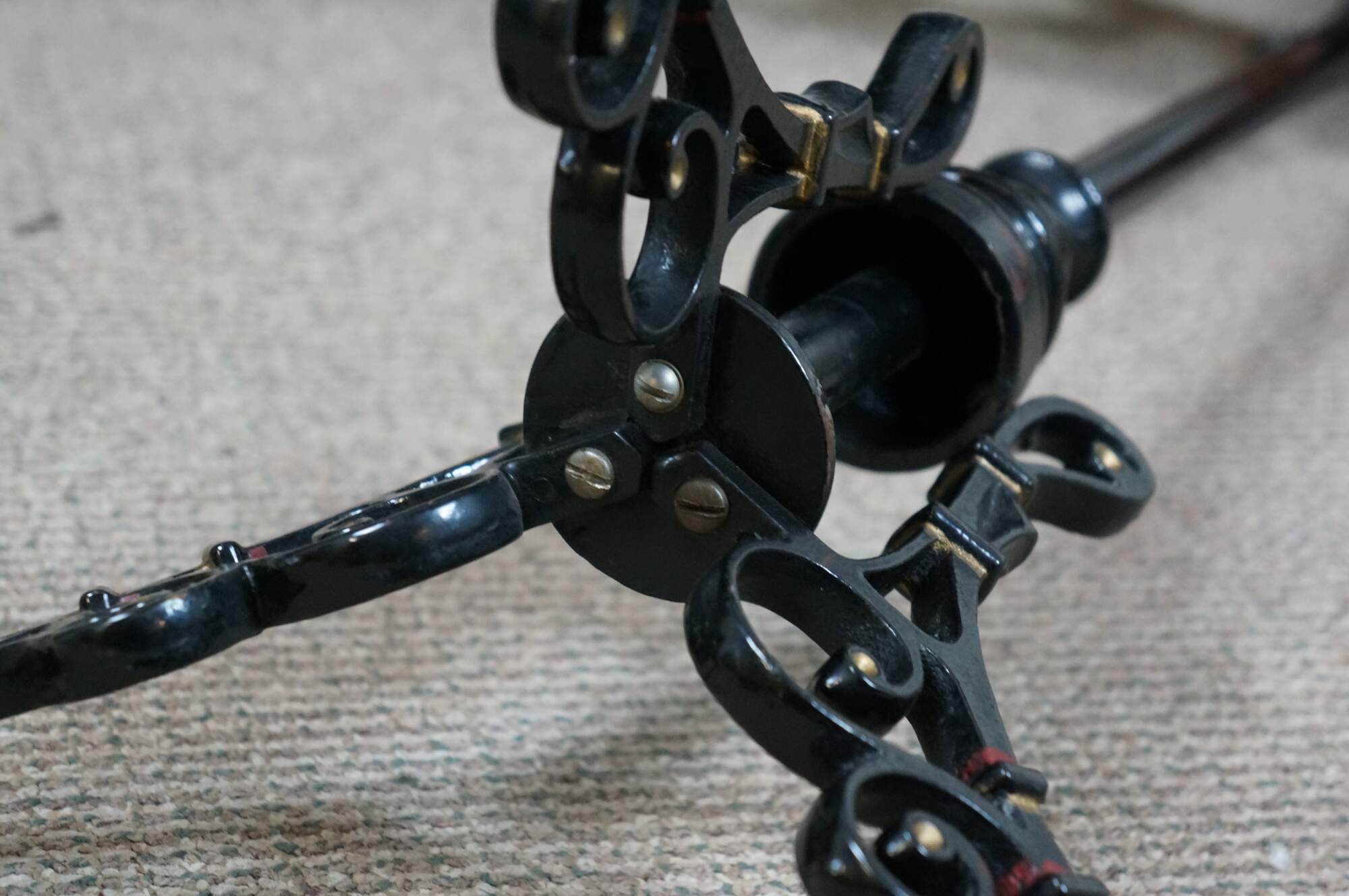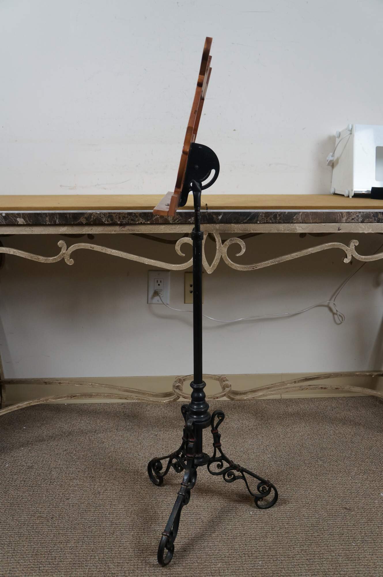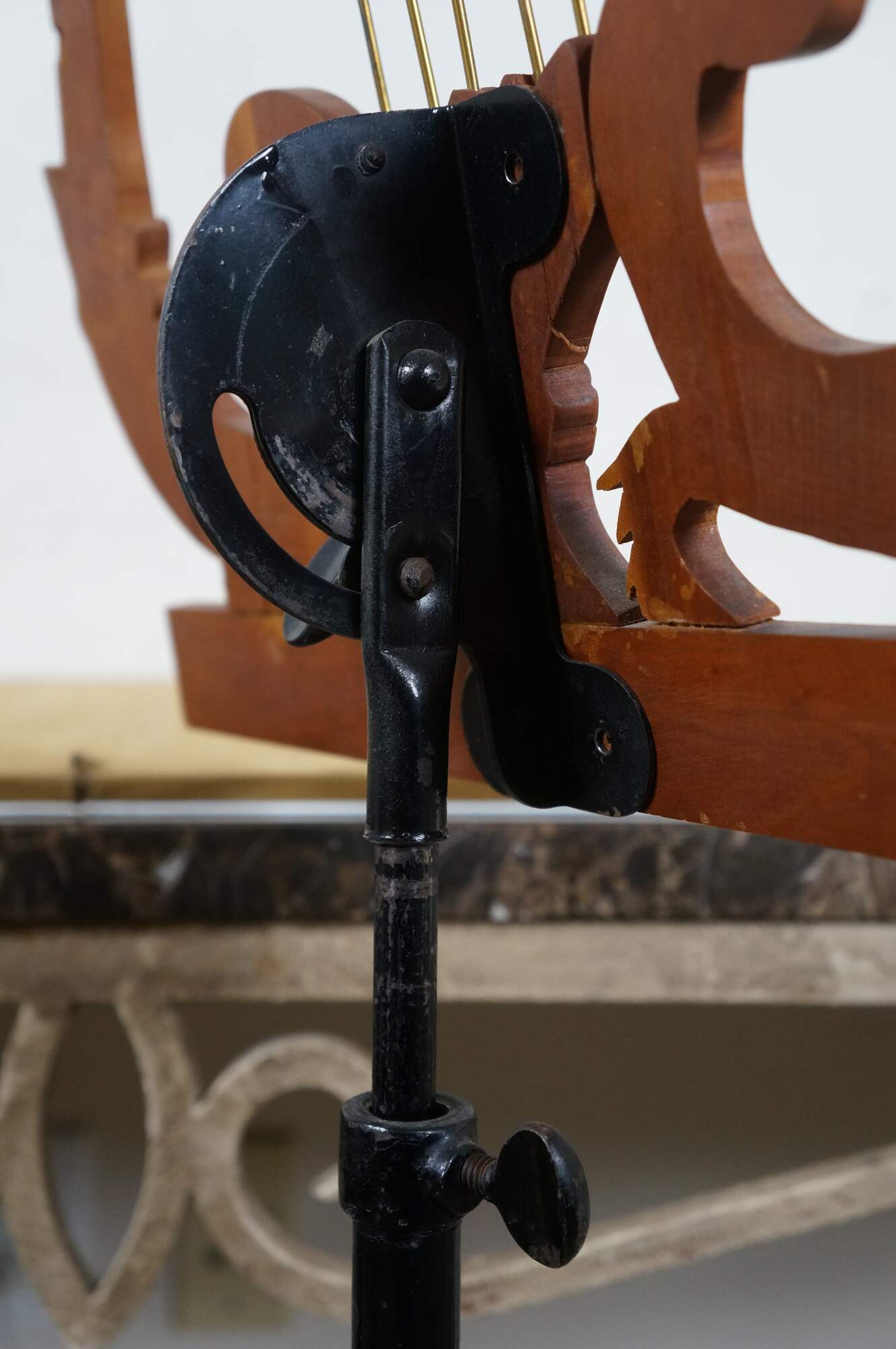 Mid century music stand featuring a black painted wrought iron tripod base and a mahogany music holder, elegantly carved in the shape of an ornate lyre. Music tray hinges upward for more streamlined storage. Angle of lyre and height of stand are both fully adjustable.