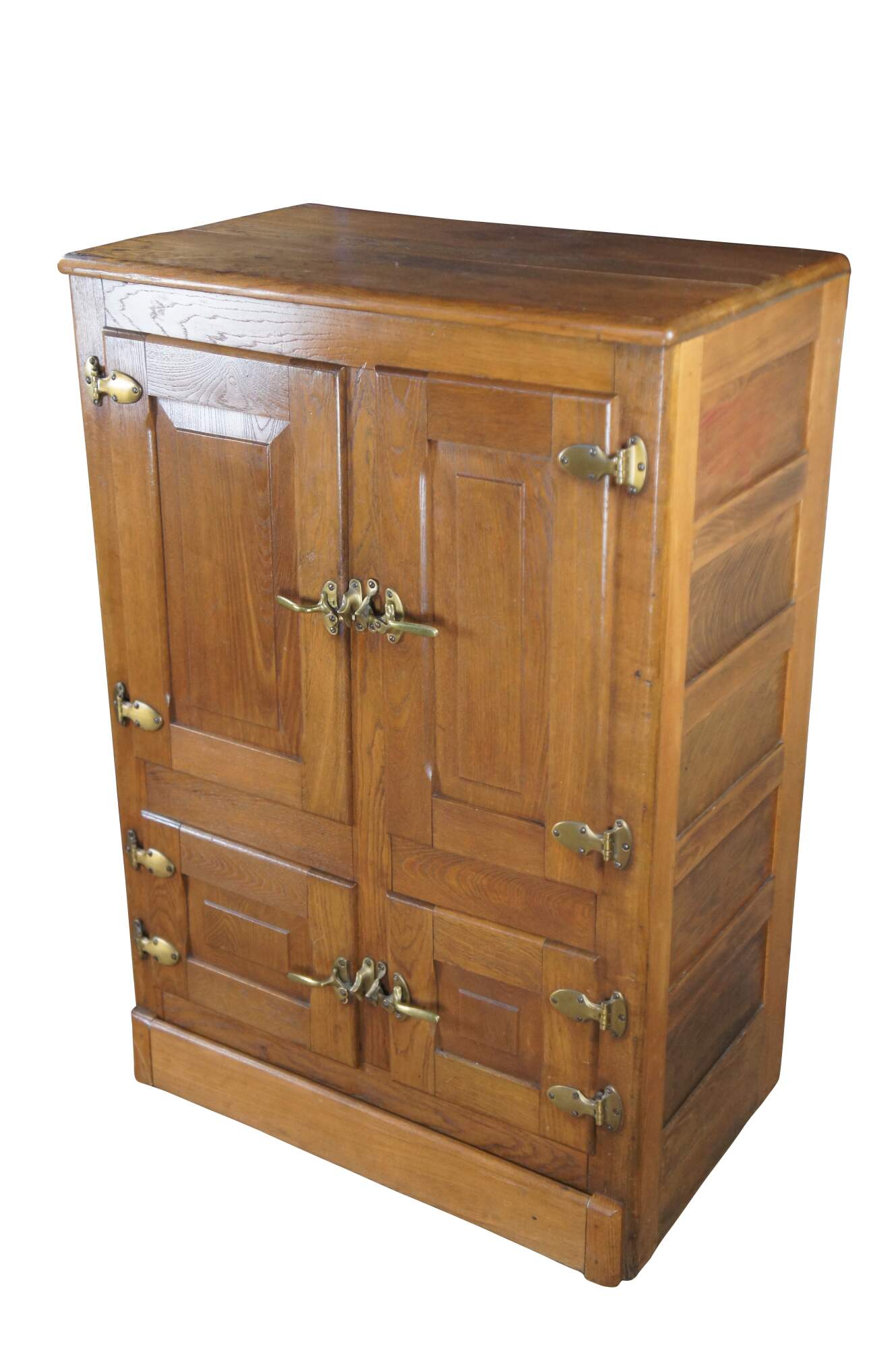 Charming early 20th century Ice chest. Made from oak and brass with an enamelled tin interior and metal shelves. The cabinet had two larger doors along the top over two smaller drawers at the base. Trim along the base flips open for drain. Maker unknown