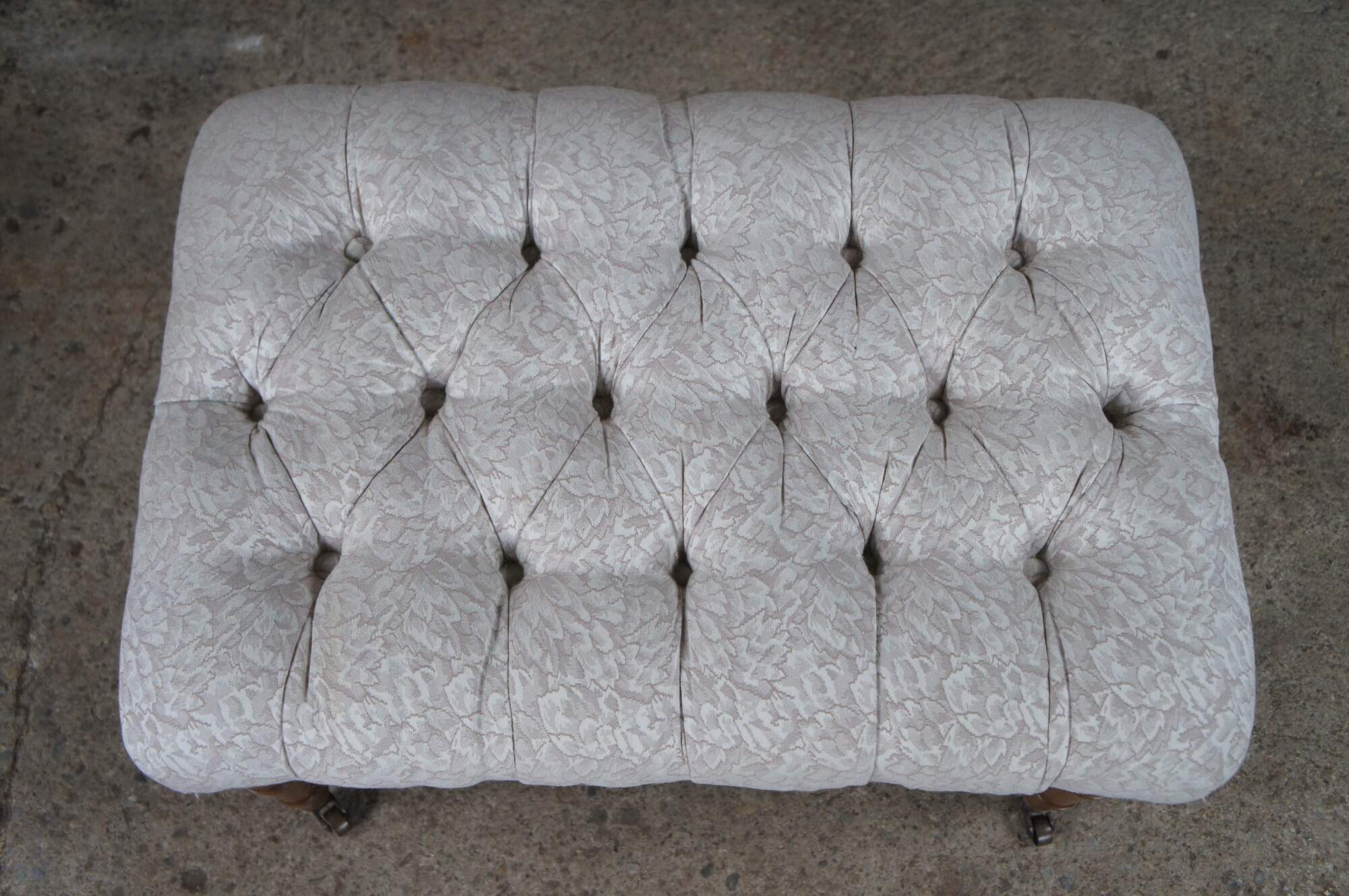 British Colonial style ottoman or footstool, circa 1980s. Features a rectangular distressed mahogany frame with floral upholstered and tufted pillow top. The bench is supported by tapered, ribbed legs with brass casters.