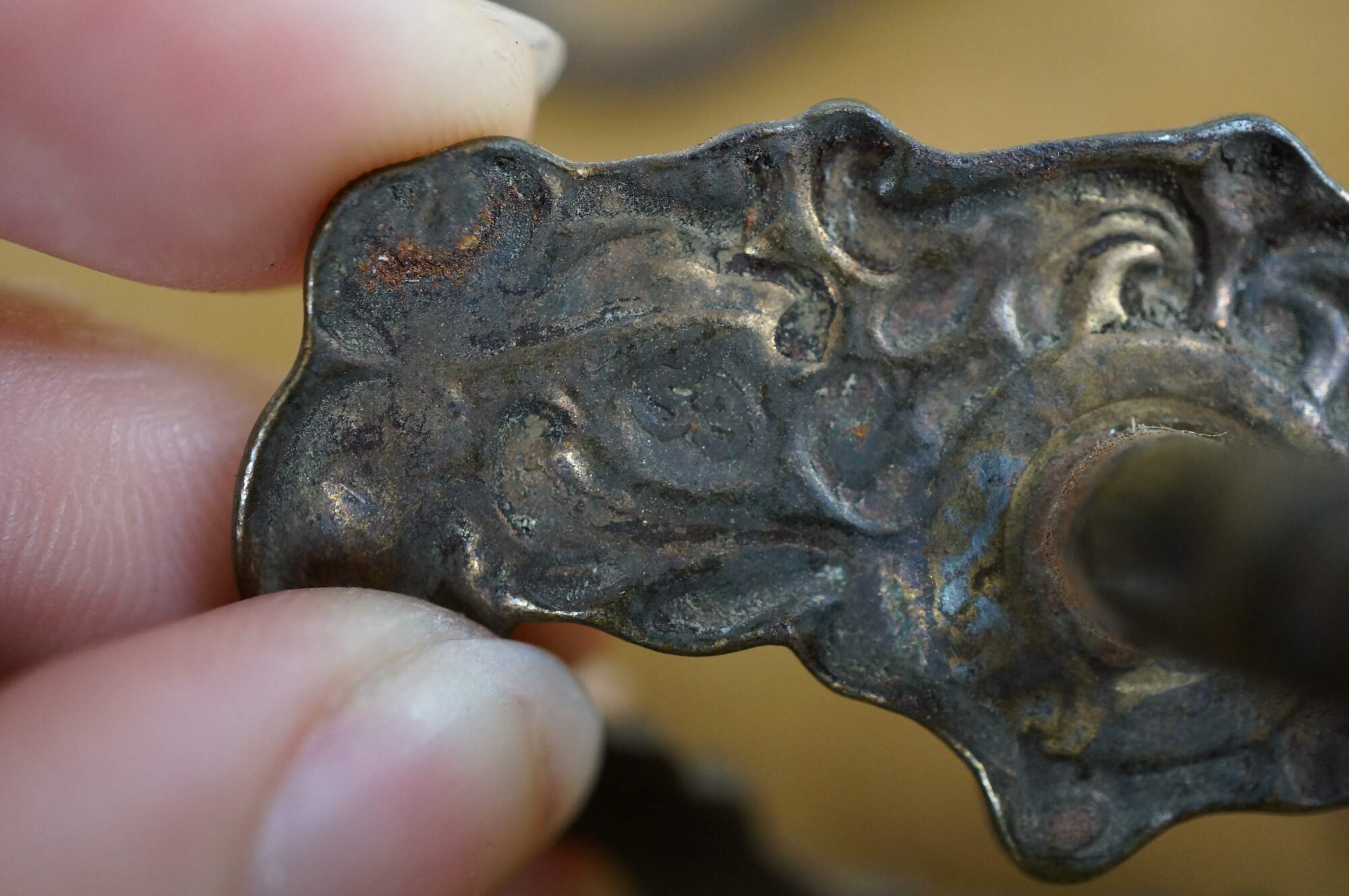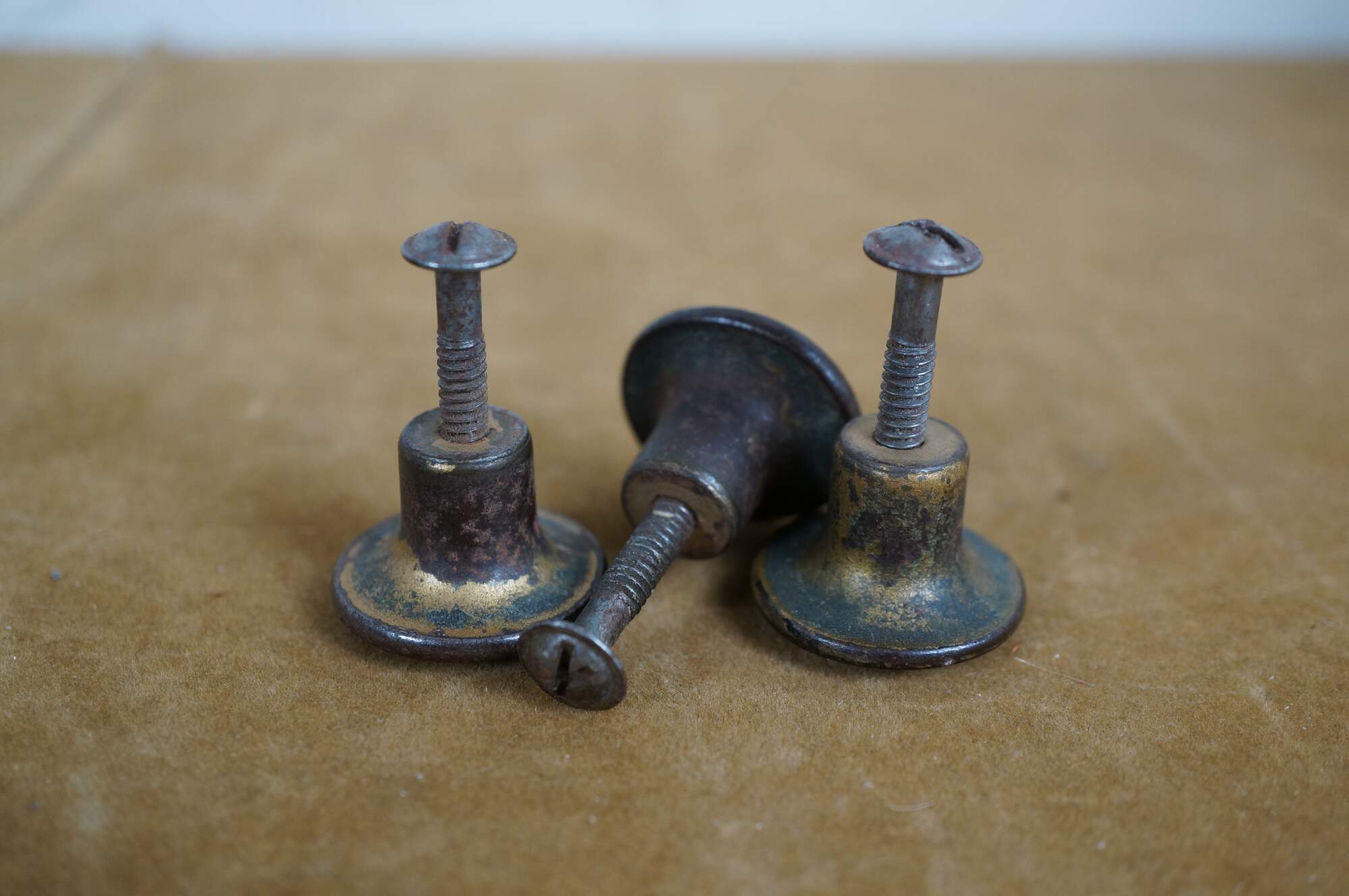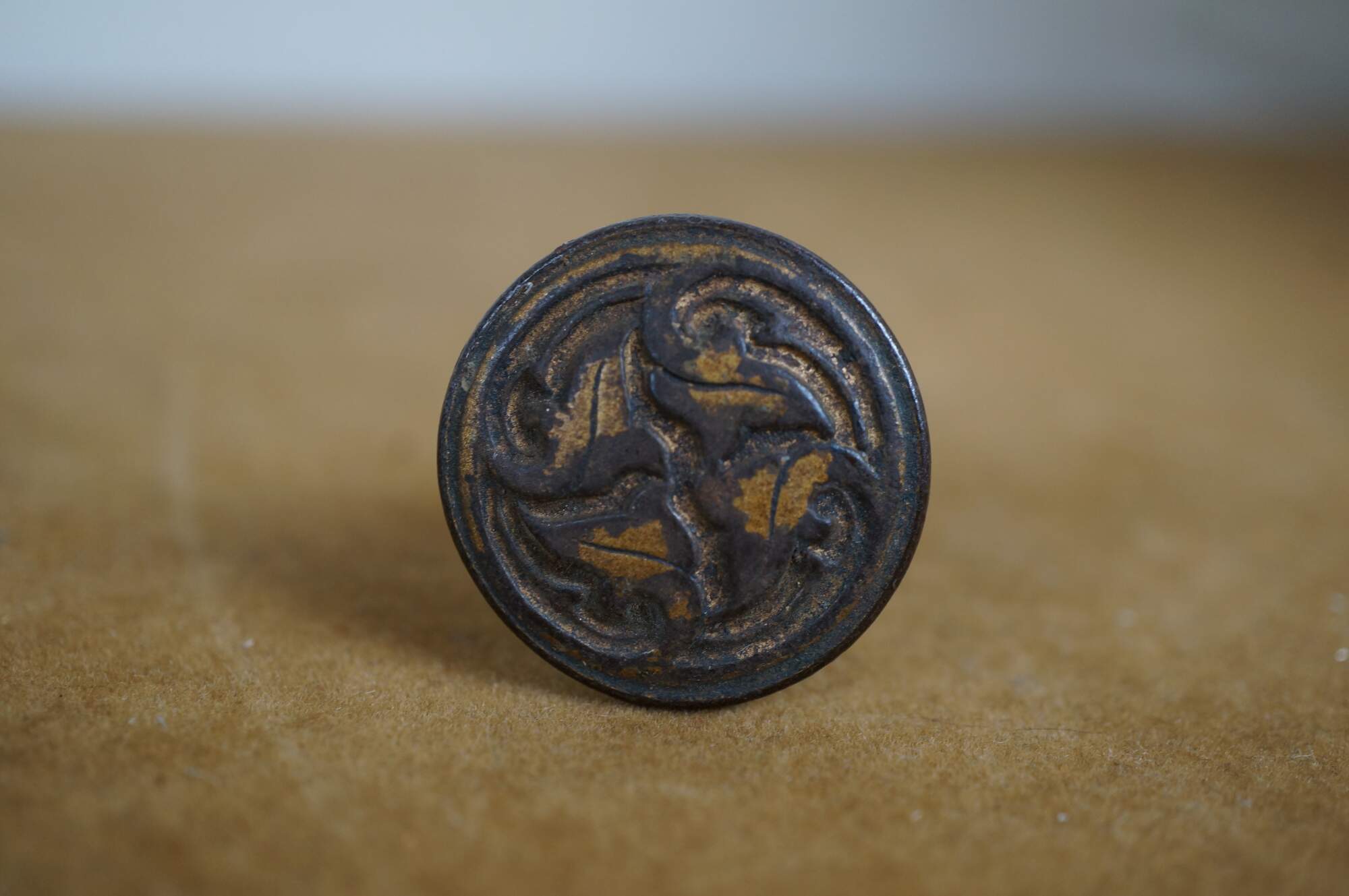Lot of 5 vintage brass drawer / cabinet pulls including three round pulls decorated with ivy leaves and two foliate fixed bail pulls.