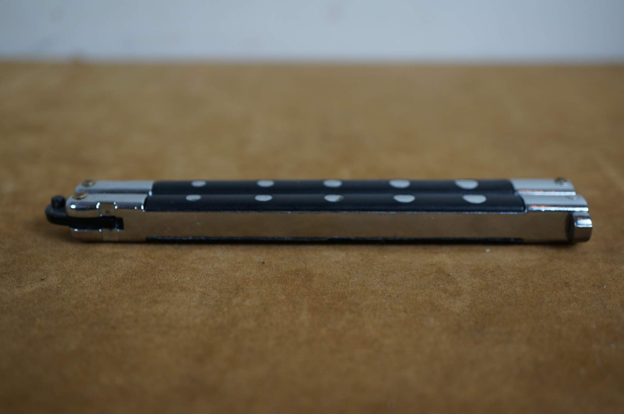 Late 20th century black and chrome rostfrei (stainless steel) fan knife / batangas / butterfly knife.