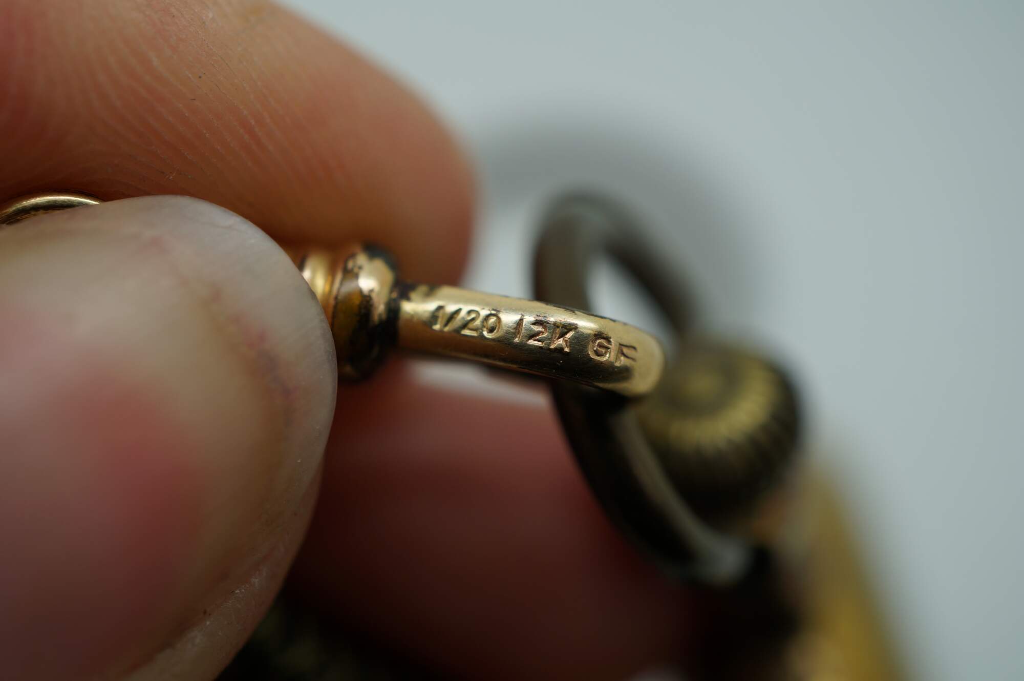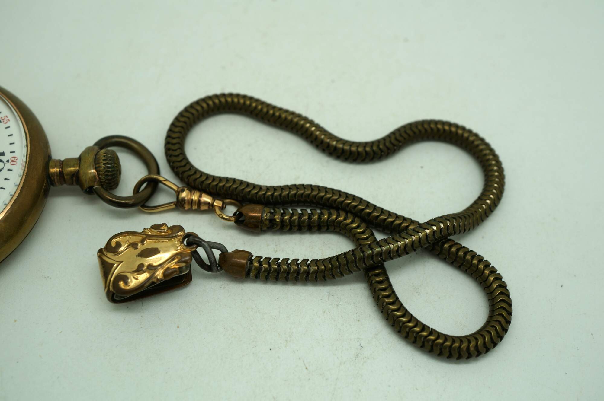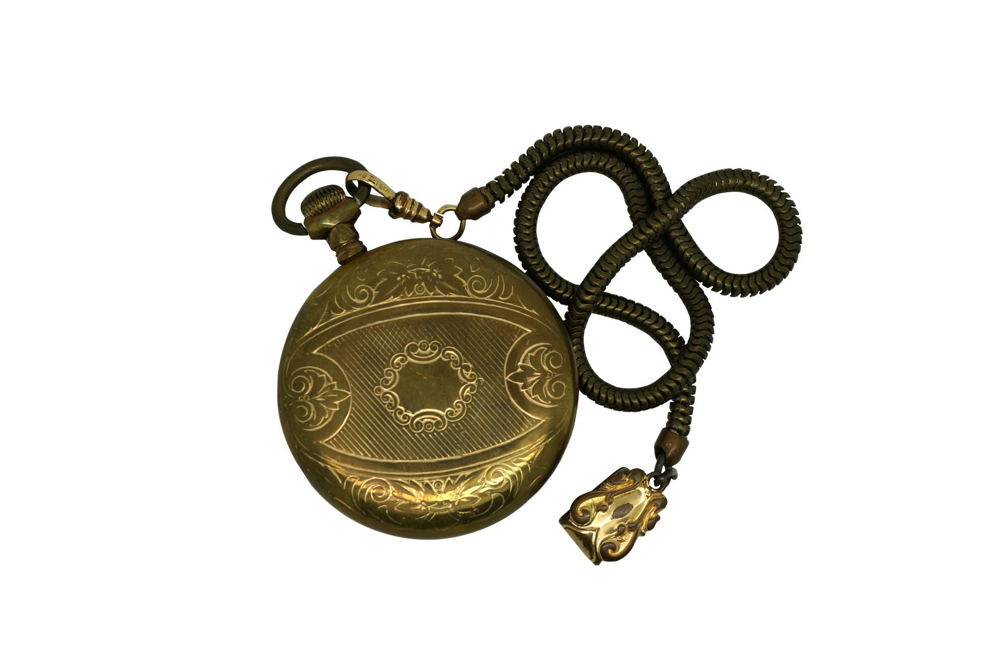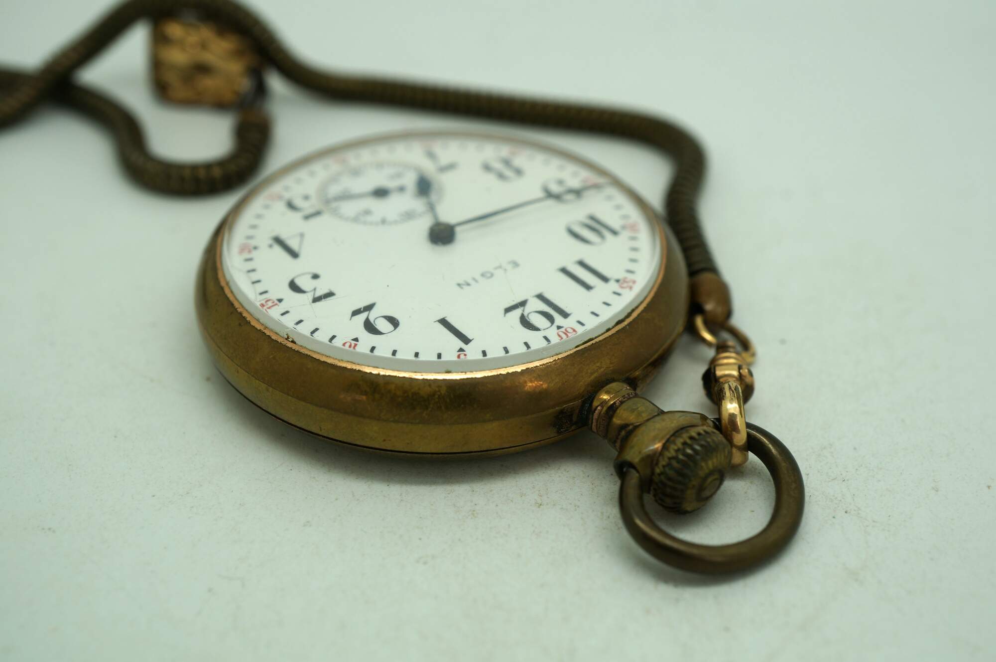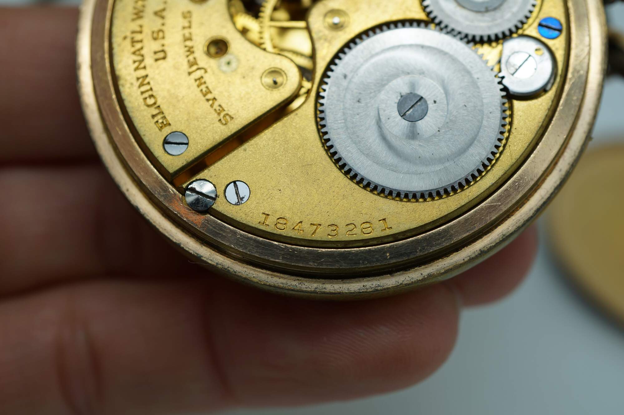 Antique 1915 Elgin openface pocket watch and chain. White face with black Arabic numerals, auxilliary dial, and iridescent blue hands. Back etched with scrolling foliate and leaves around an empty frame for a monogram. Movement - Elgin National Watch Co, USA - Seven Jewels - 18473281 - Grade 293 - Model 7 - 16s. Case - National Watch Case Co - Warranted 25 Years - 706297. Includes 1/20 12K gold filled snake chain.