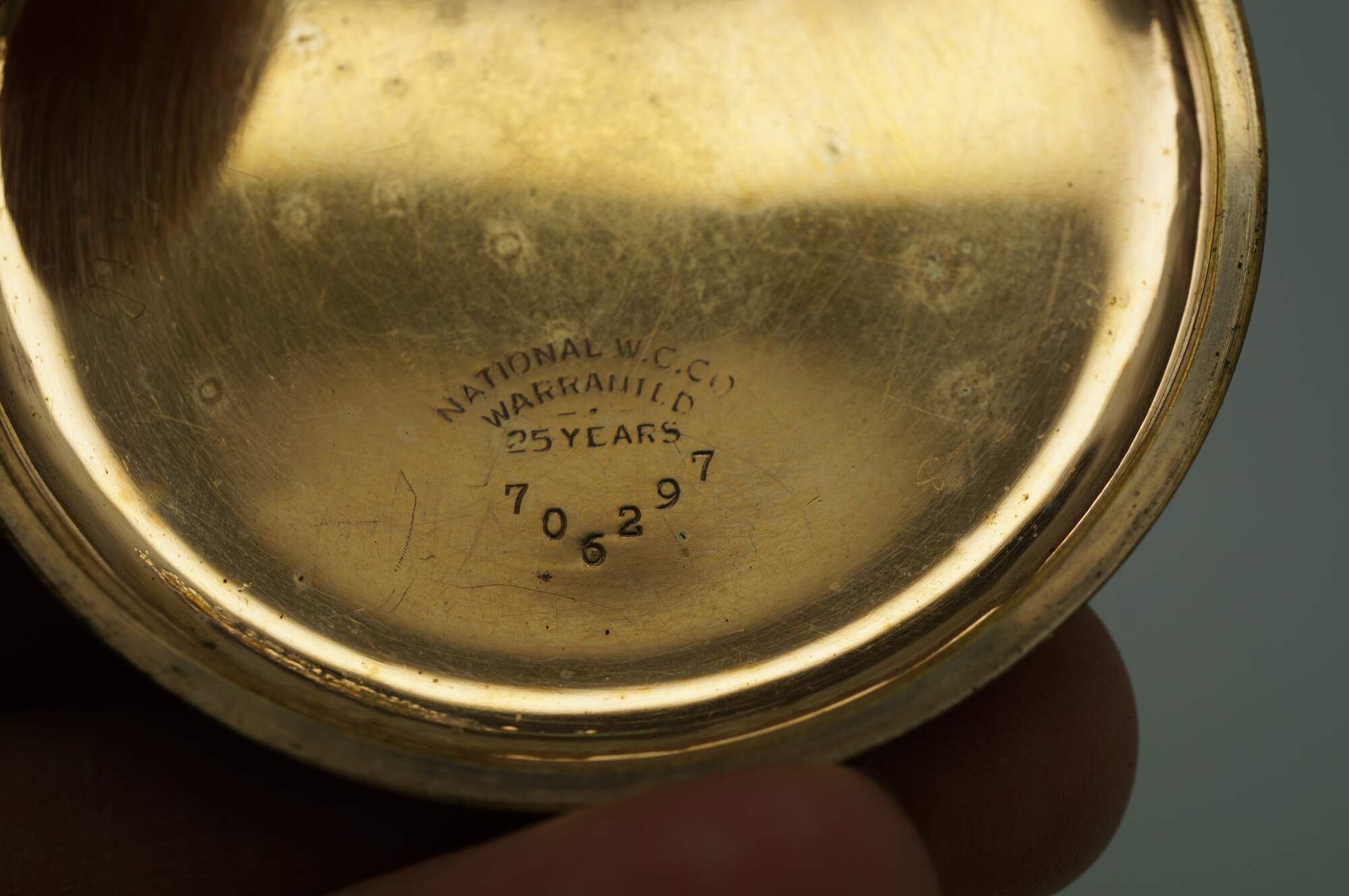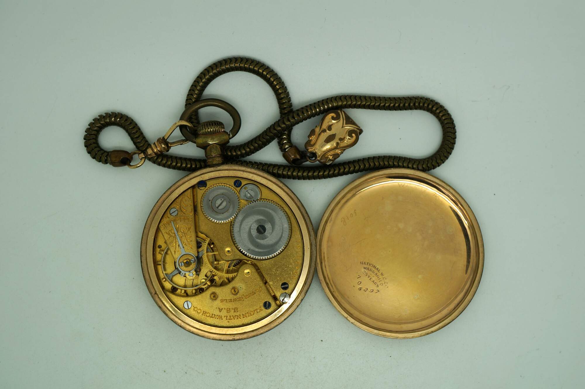 "The National Watch Case Company was organized in early 1888 as a joint venture between Albert Booz and Alfred Humbert. The February and March 1888 issues of The Jewelers' Circular and Horological Review reported on this consolidation of Booz & Co. and Humbert's company. Booz was formerly a partner at Booz & Thomas, while Humbert was the senior member of the Hurlburt & Sons firm. When the company opened operations at 715-719 Arch Street in Philadelphia, it employed around 150-175 workers. According to reports, the company specialized in manufacturing 14K and 18K gold watch cases. A short time after commencing production, the company began making seamless gold rings using a patented process. In 1890, there was an embezzlement scandal when two employees were discovered to have stolen gold from the company. The same year, the company was awarded nearly $18,000 in the case against the Atkinson Brothers in Philadelphia during the watch club collapse. A few months later, the company filed another suit for $4,300 to receive payment for additional promissory notes. In July 1890, there was a chemical explosion at the factory. However, the damage was minimal. On October 15, 1890, possibly due to mounting financial issues with the Atkinson Brothers and production problems, leadership decided to dissolve the company. Albert Booz sold the existing stock under his new operation - The Federal Watch Company, at 1026 Arch Street. The July 13, 1892 issue of The Jeweler's Circular reported that the firm had been transferred to Alfred Humbert, who continued the company under the name The National Watch and Jewelry Manufacturing Company. However, there is no evidence that this company proceeded with manufacturing after 1892." (Source: Pocket Watch Database)