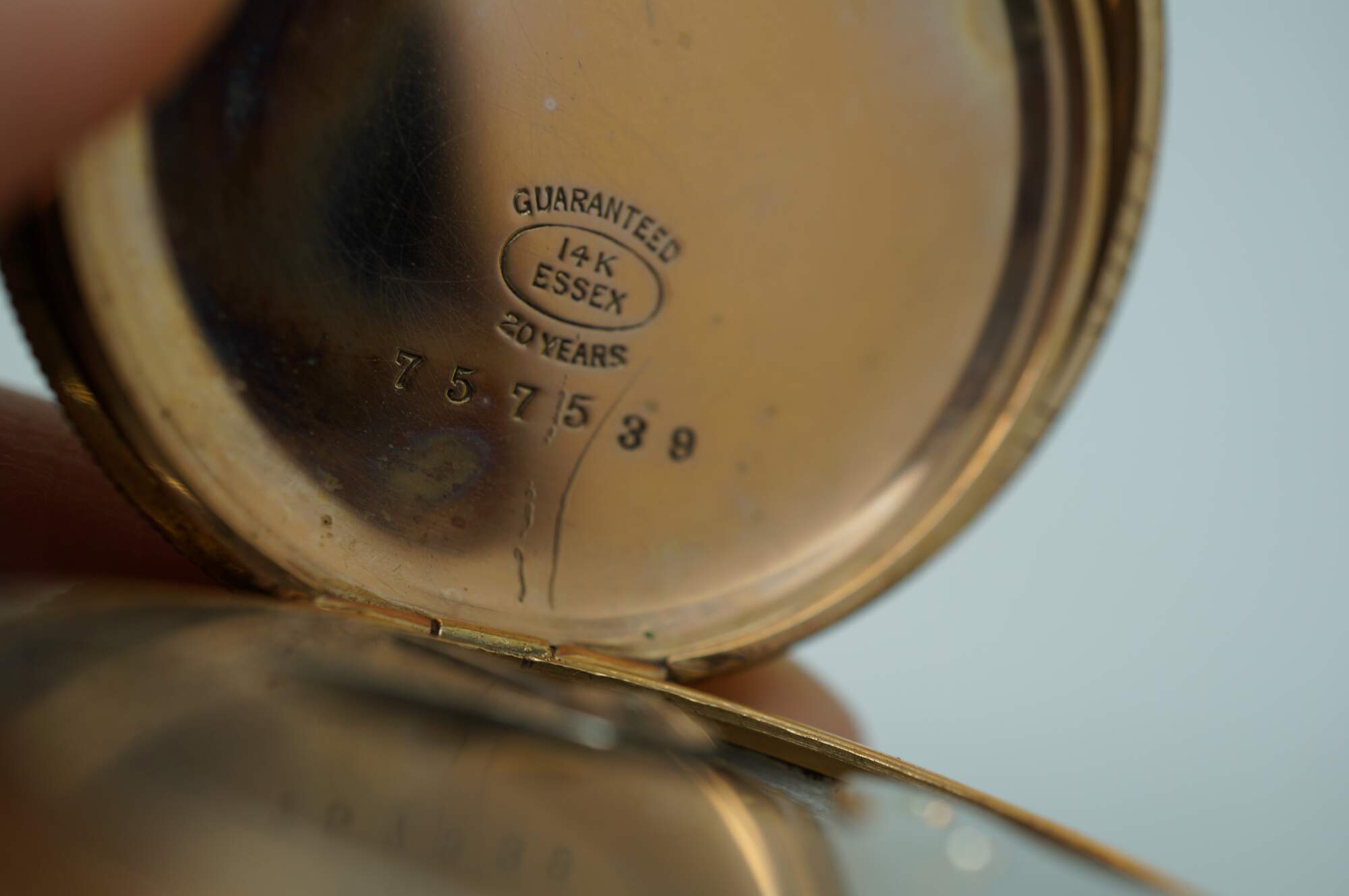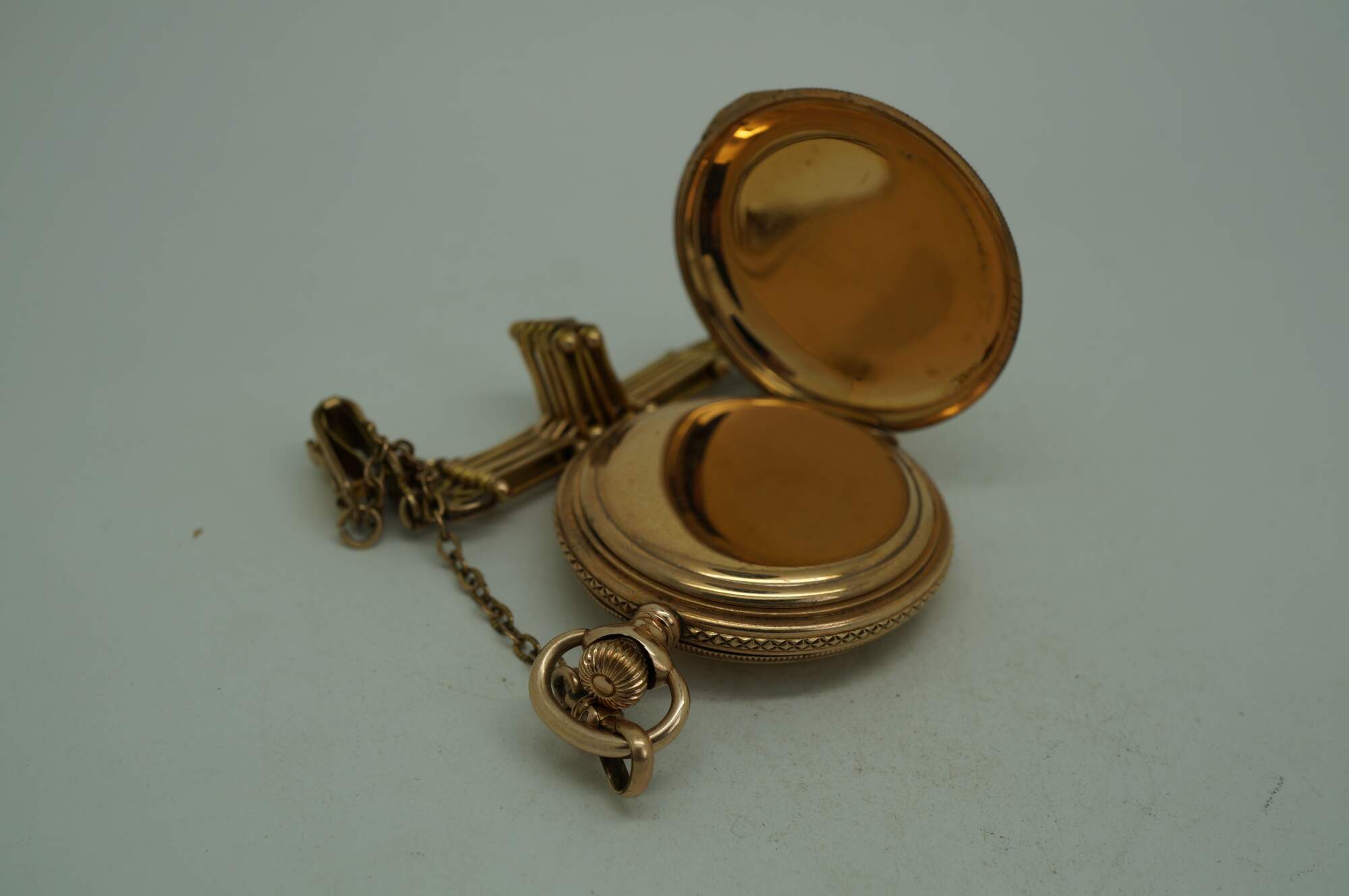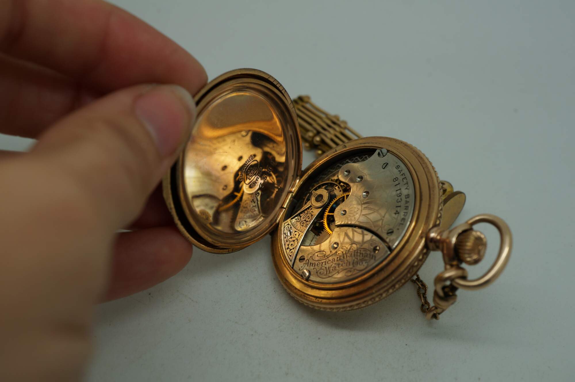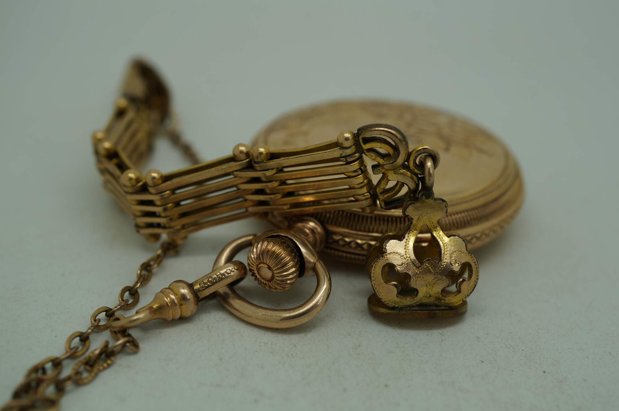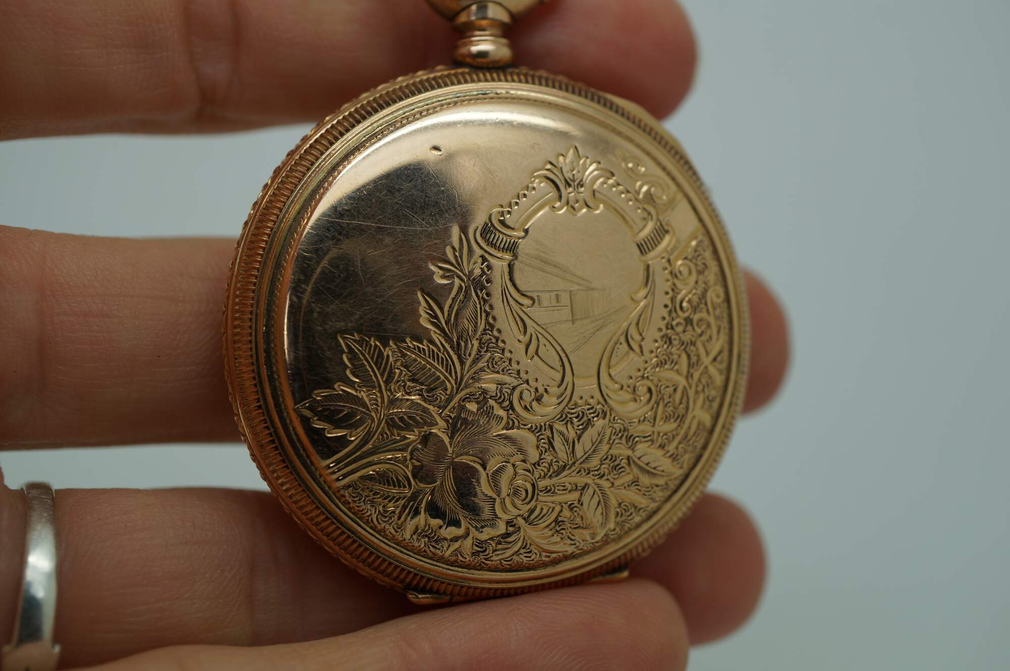 Antique 1897 Waltham hunting-style gold pocket watch. Movement - American Waltham Watch Company - Safety Barrel - 8119314 - Grade Seaside - Model 1890 - 6s - 7 jewels. White face with black Roman numerals, auxiliary dial with Arabic numerals, and iridescent blue hands. Case - Essex - 14K Gold - Guaranteed 20 Years - 757539 - 539. Both sides of the case etched with a rose and foliate frame - one side blank, ready for a monogram, the other side with the engraved image of a small house. S.O.B. & Co chain with attached signet seal fob (blank - no monogram).