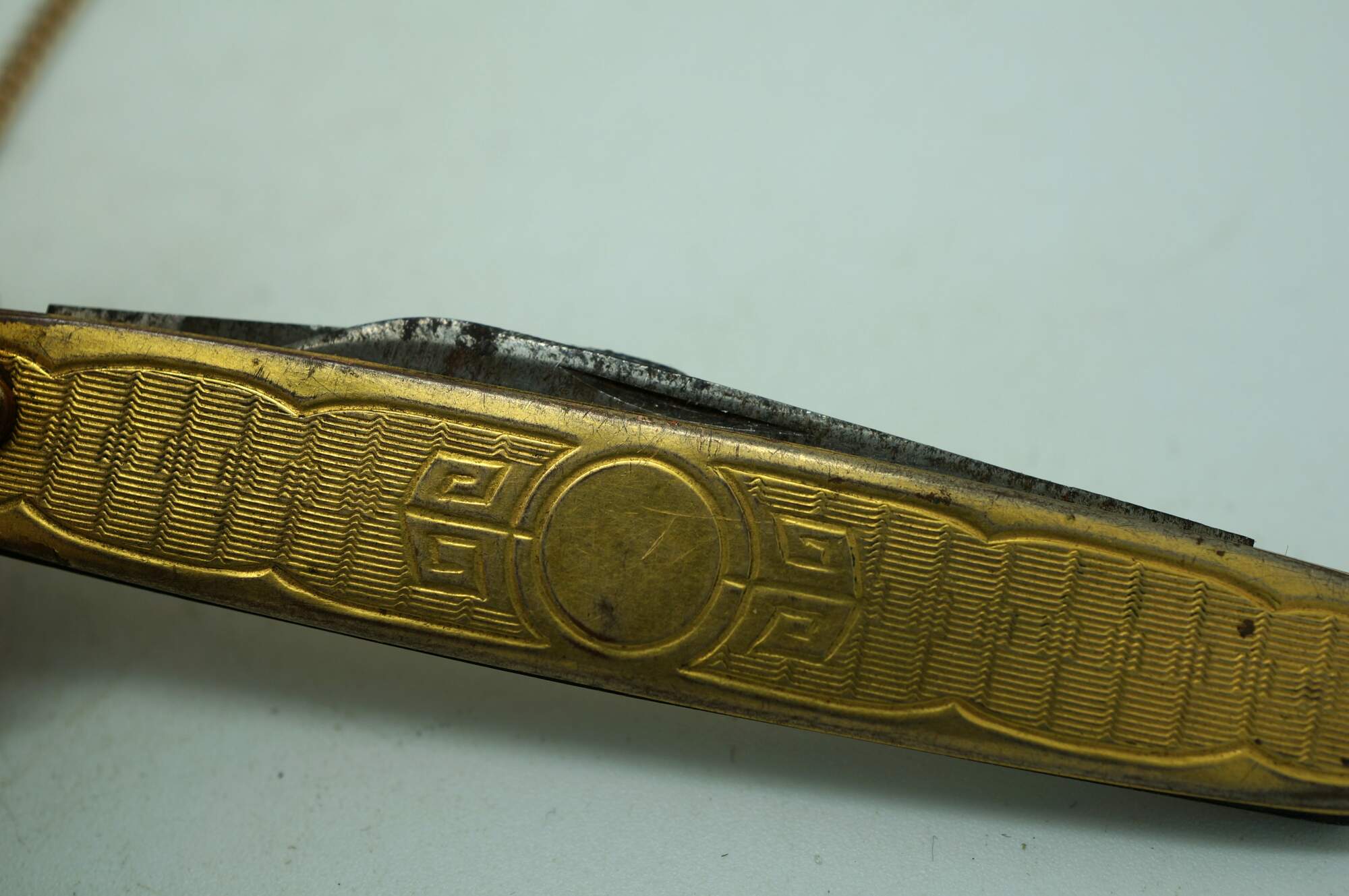 Early 20th century (pre-1920's) gold filled pocket watch curb chain by Bates & Bacon hung with a gilt two blade pocket / pen knife etched with an art deco design.