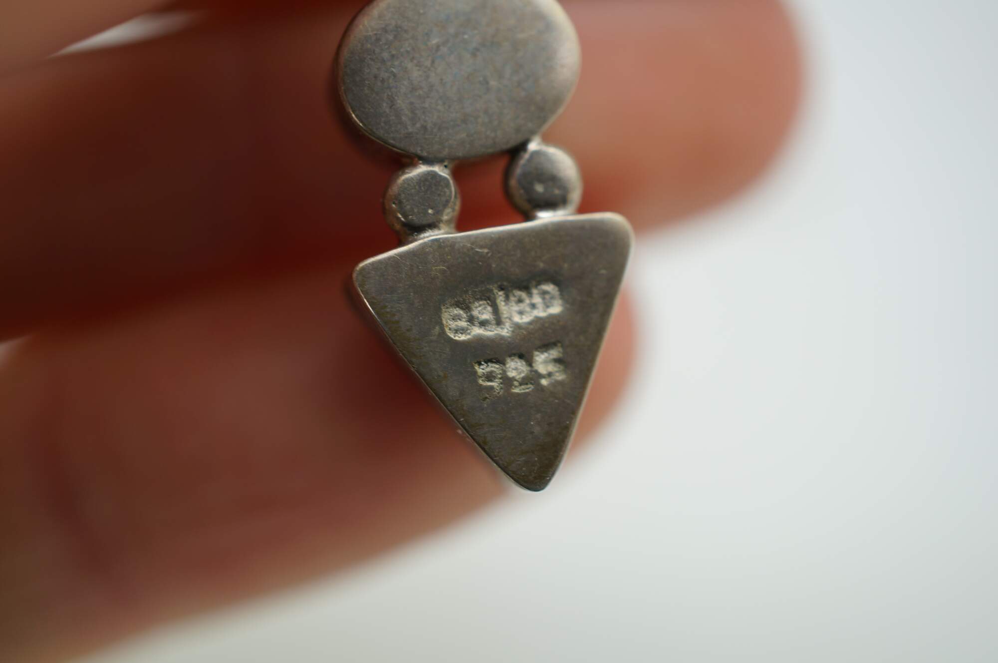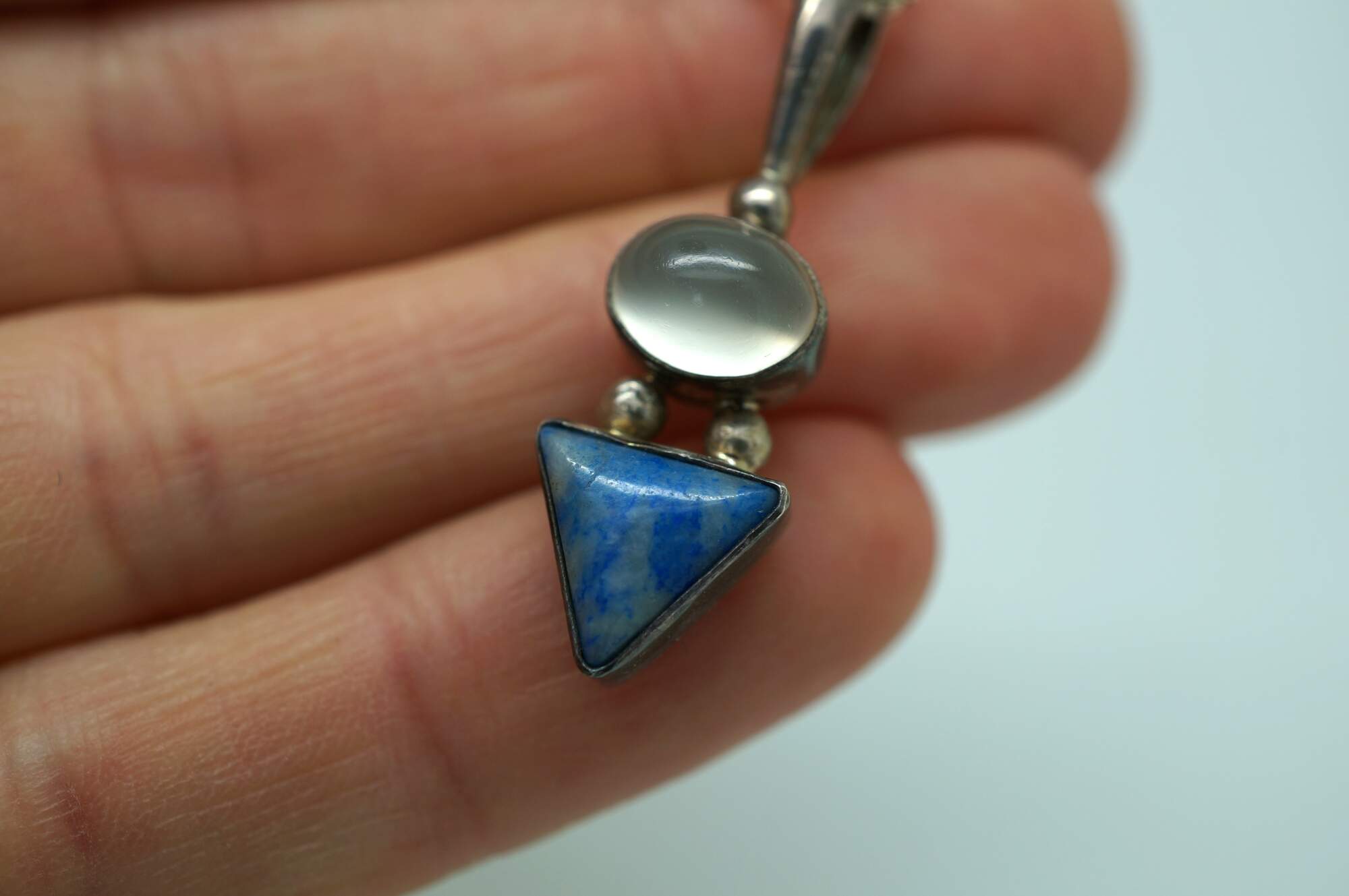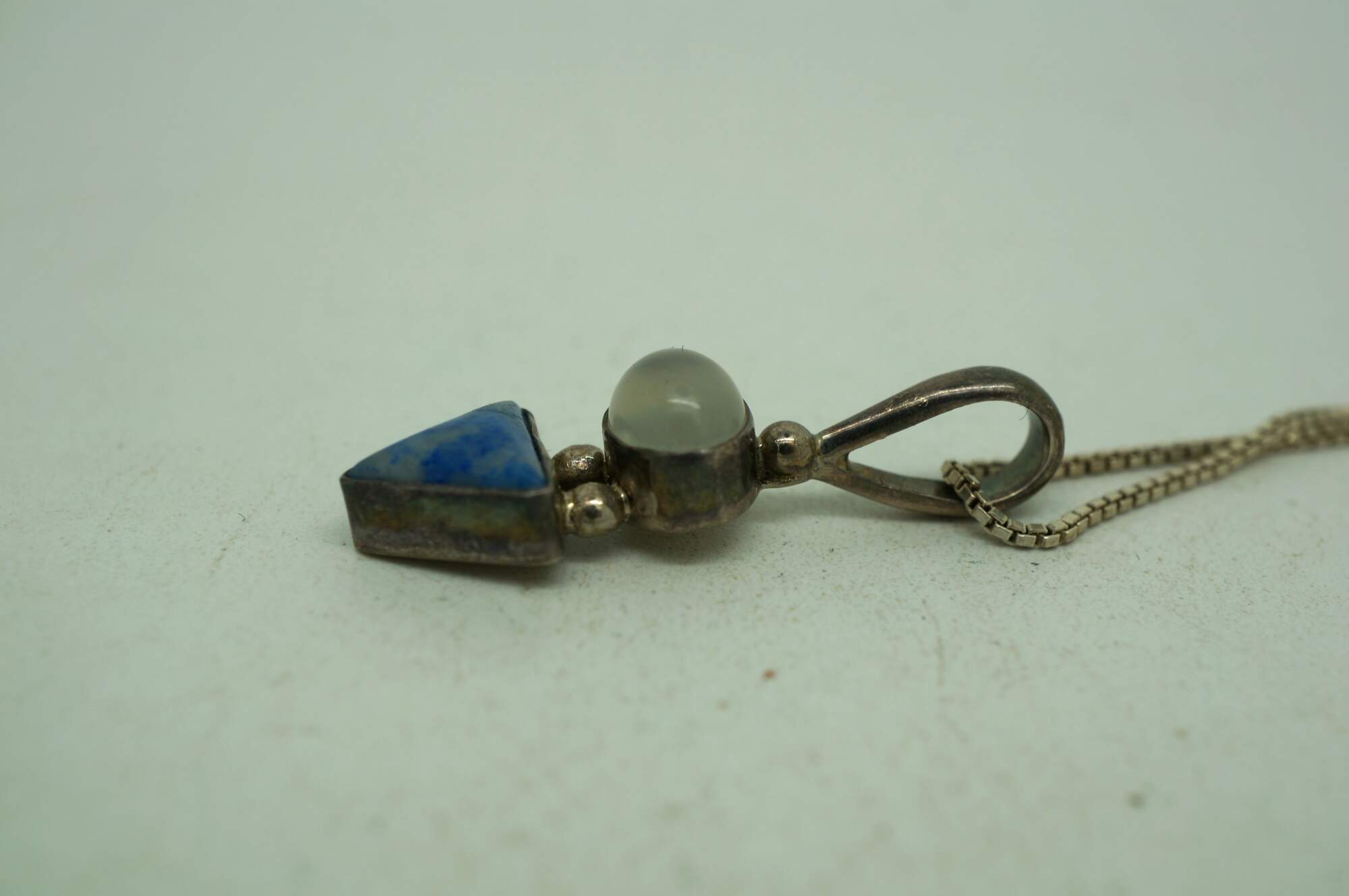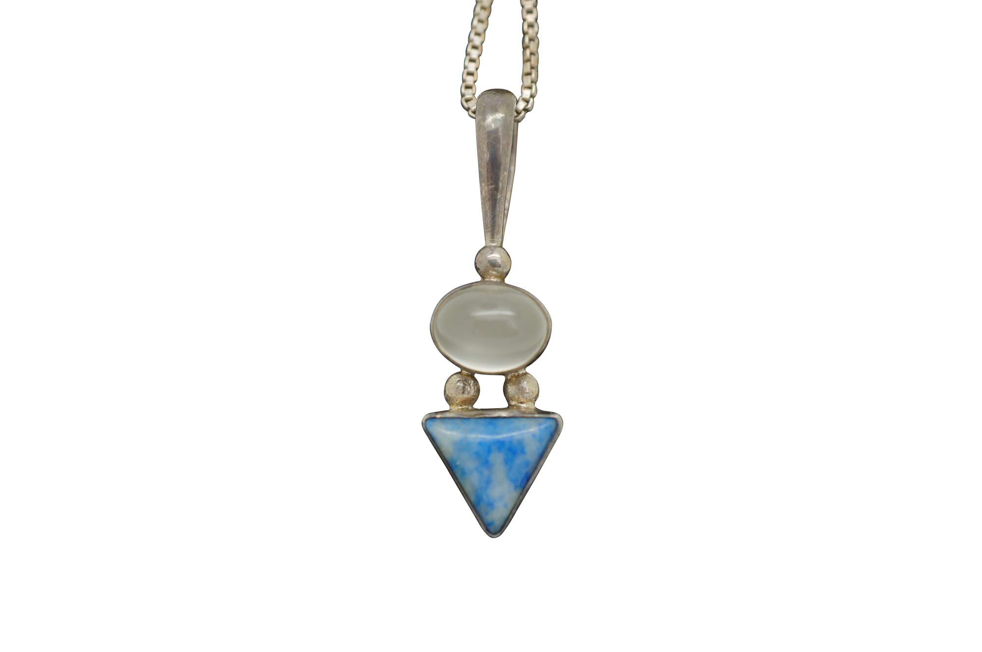 Vintage 925 sterling silver pendant featuring a caboshon of translucent white quartz stacked on a triangular cut blue lapis lazuli. Strung on Italy 925 Sterling silver box chain.