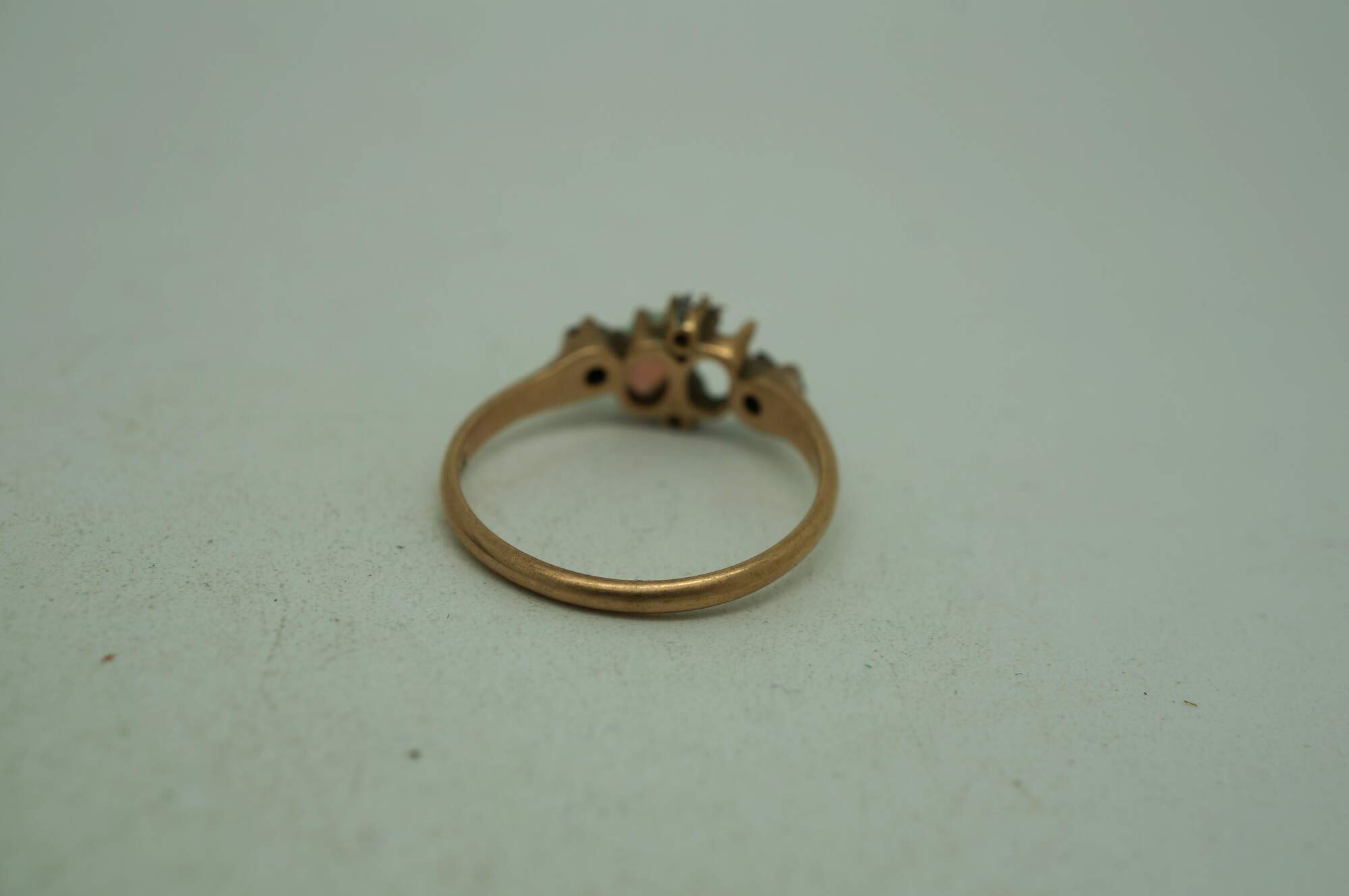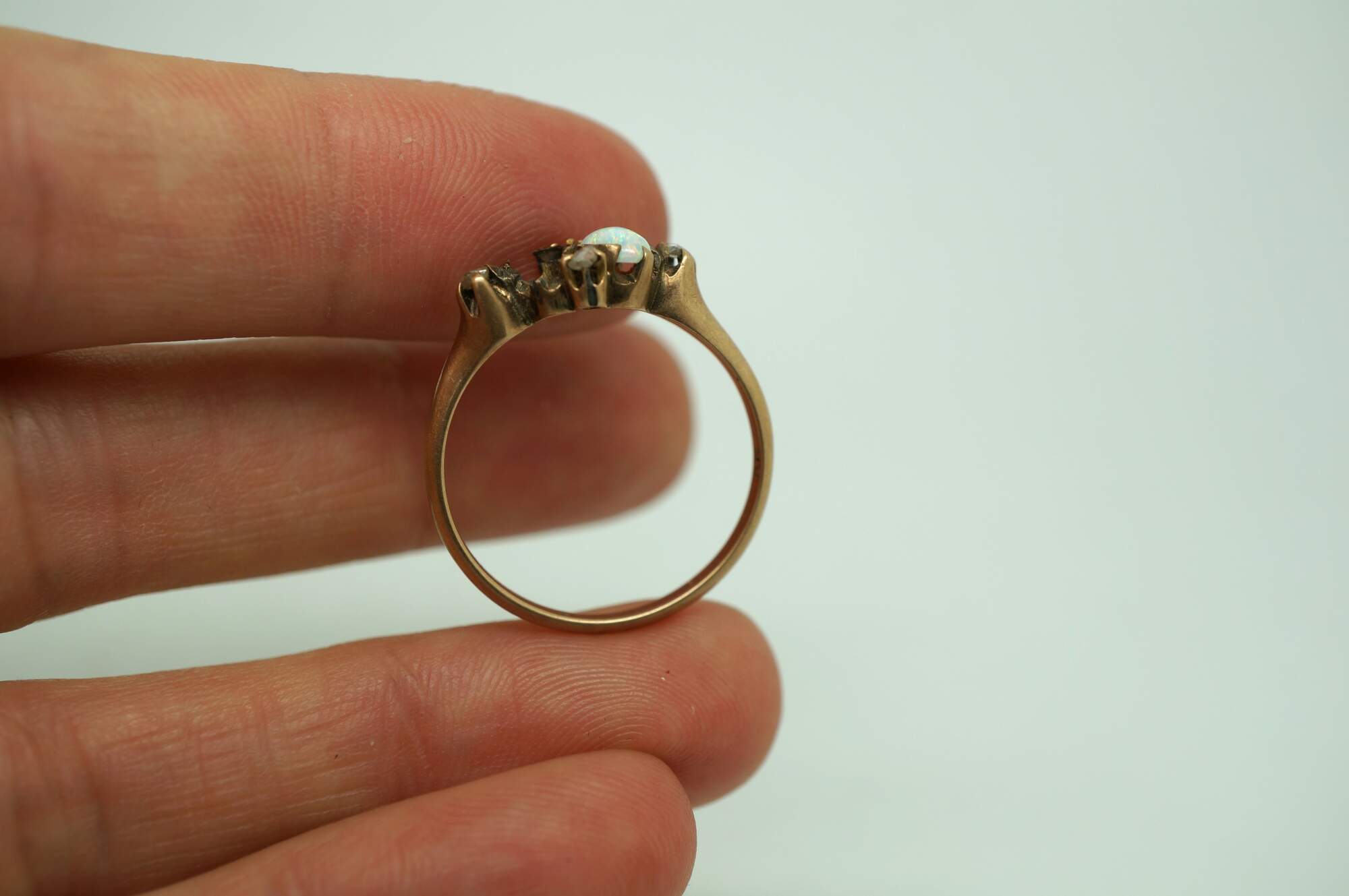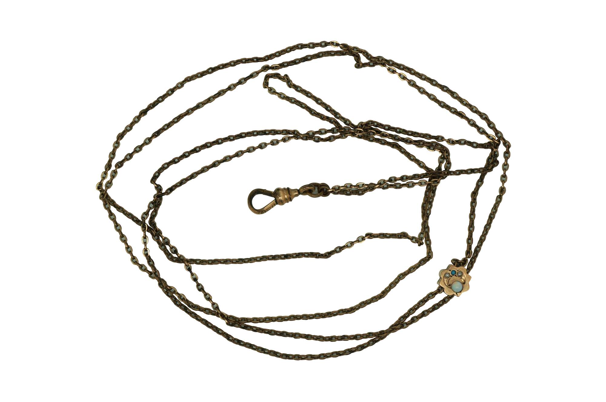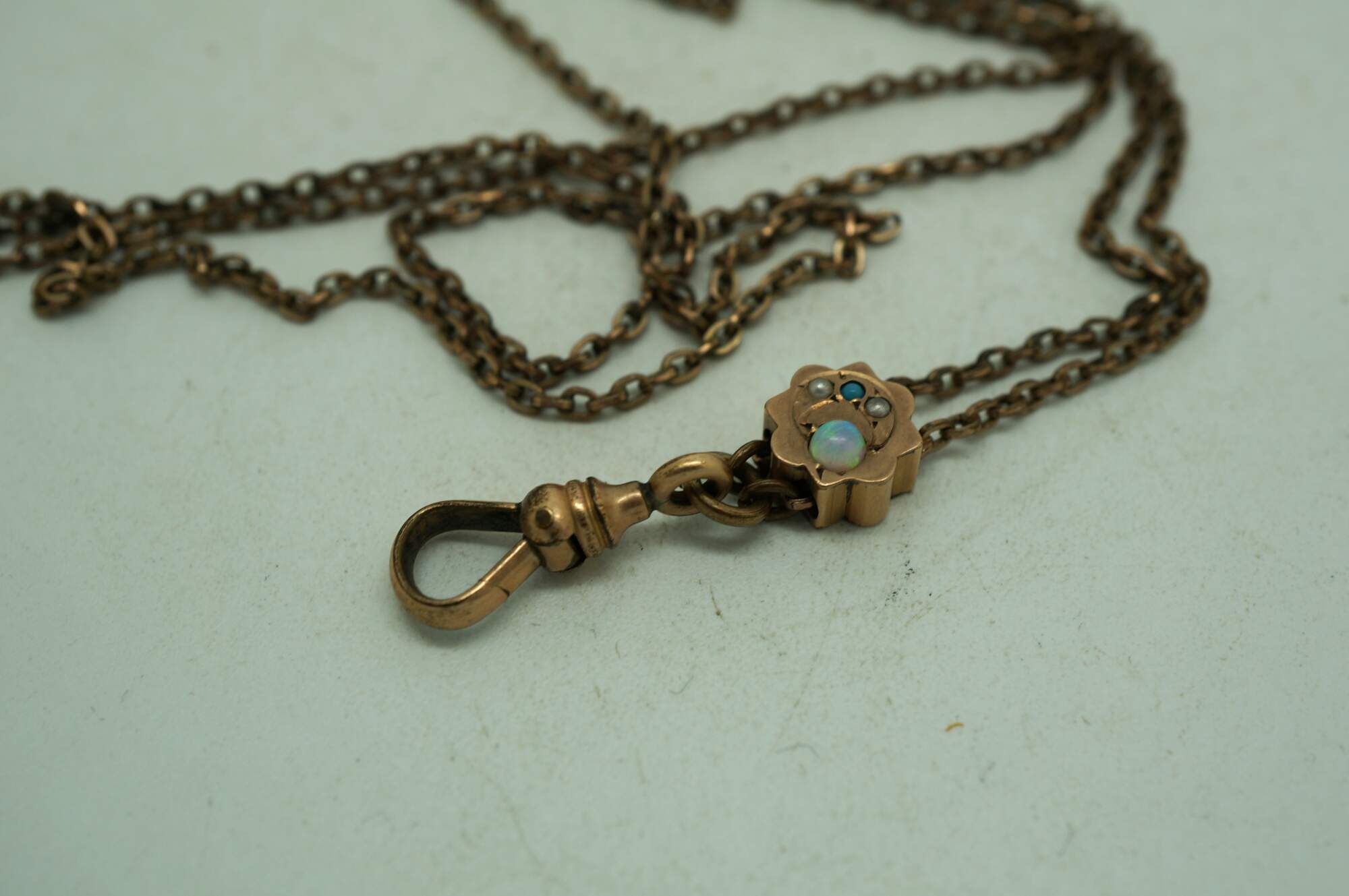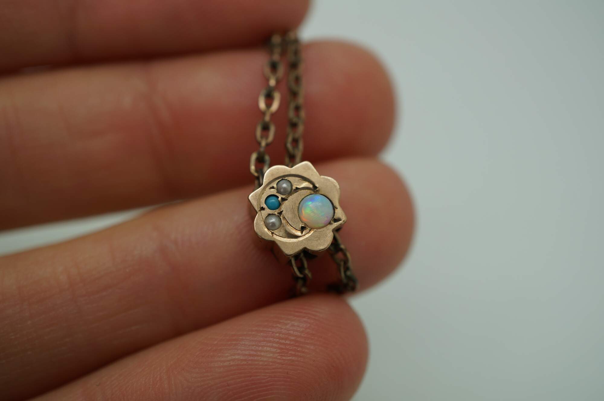 Antique late 19th-century Victorian gold-filled ladies’ watch chain necklace by the Dagget & Clap Company and ring by Dattelbaum & Friedman. Watch chain features a sun and moon pattern slide decorated with an opal, seed pearls, and turquoise cabochons. Ring once held two cabochon opals (now only one) framed on each side with diamond chips.