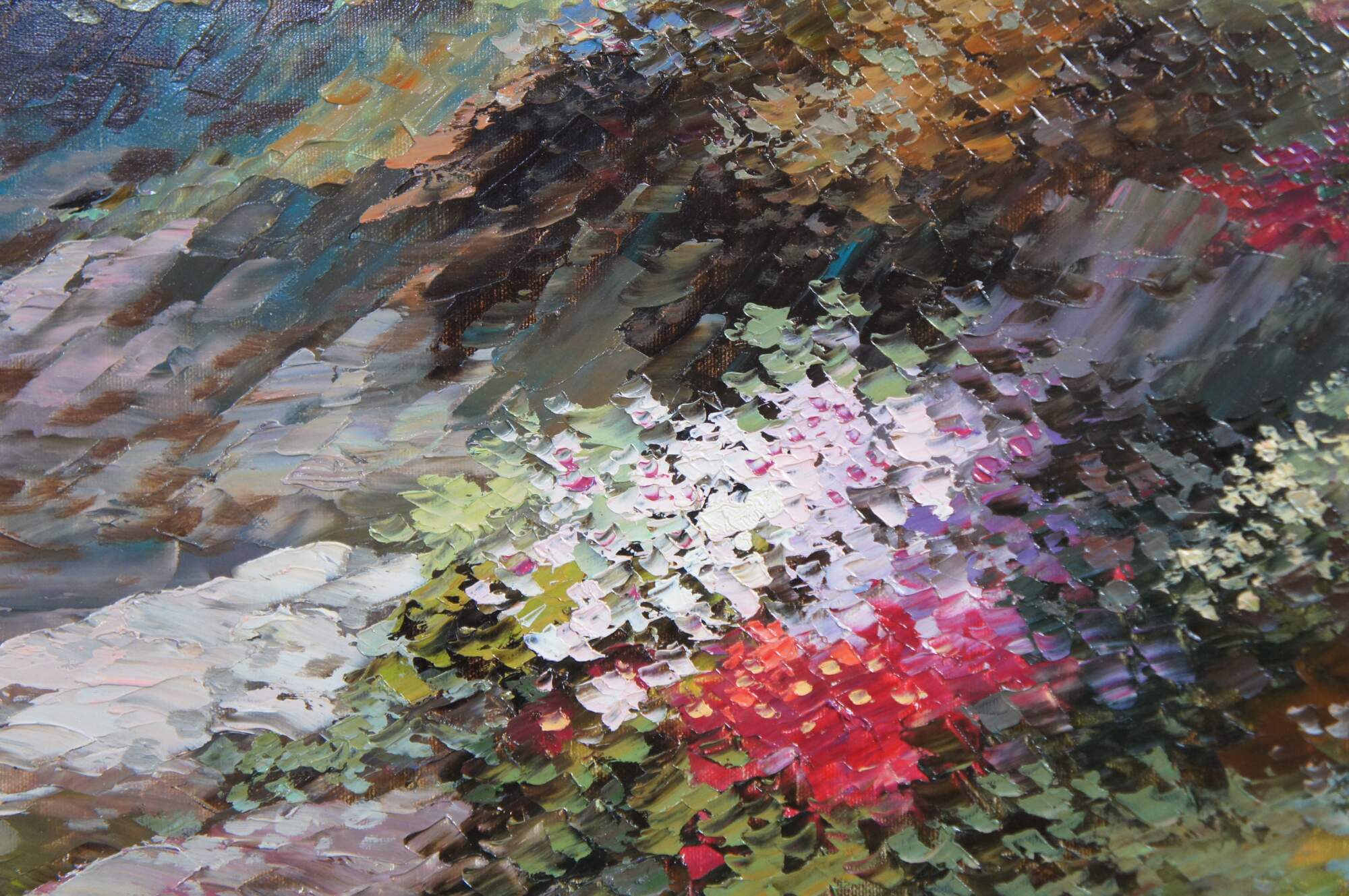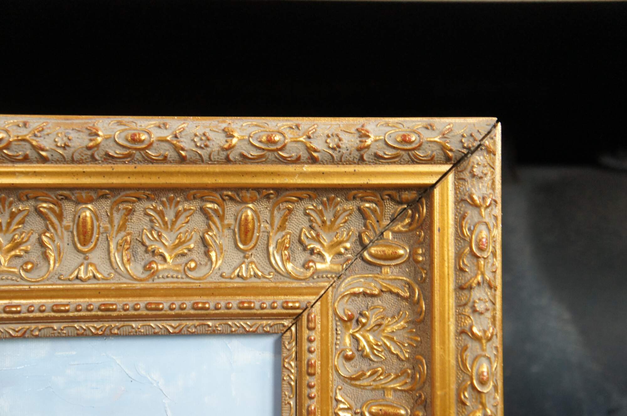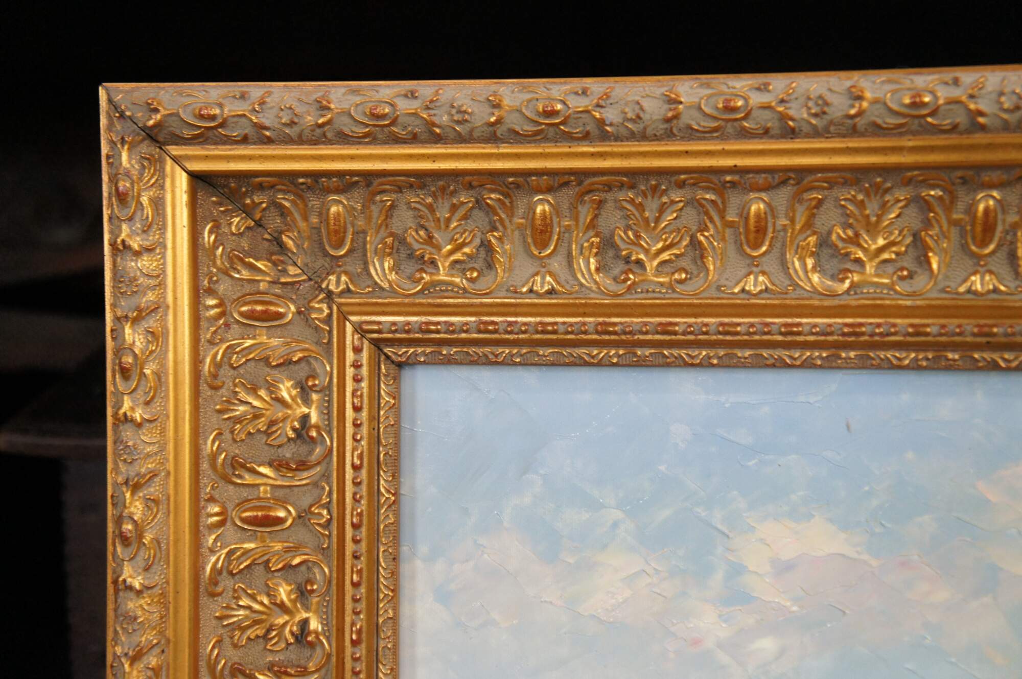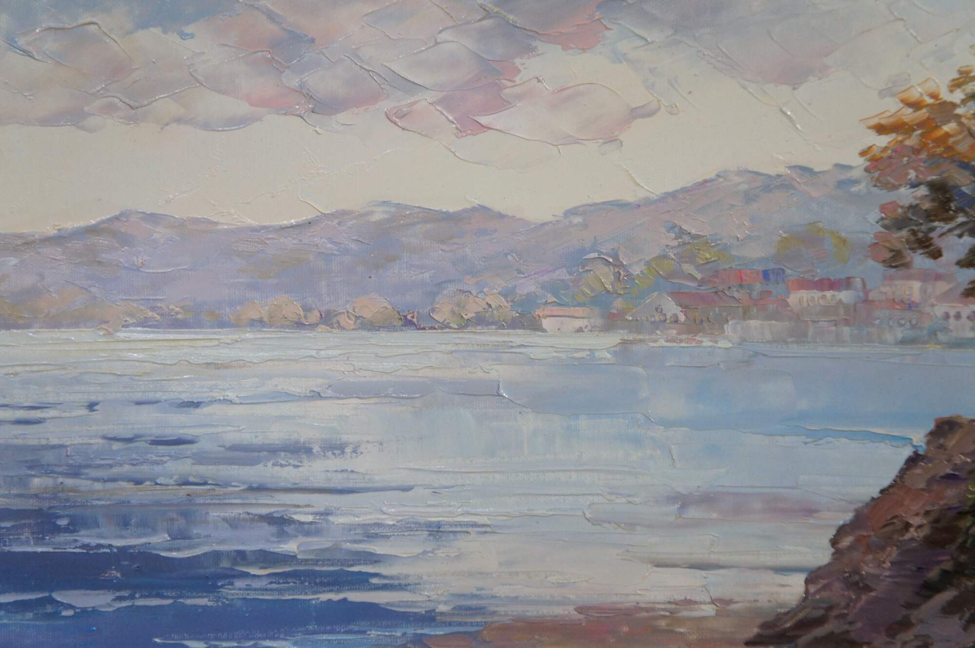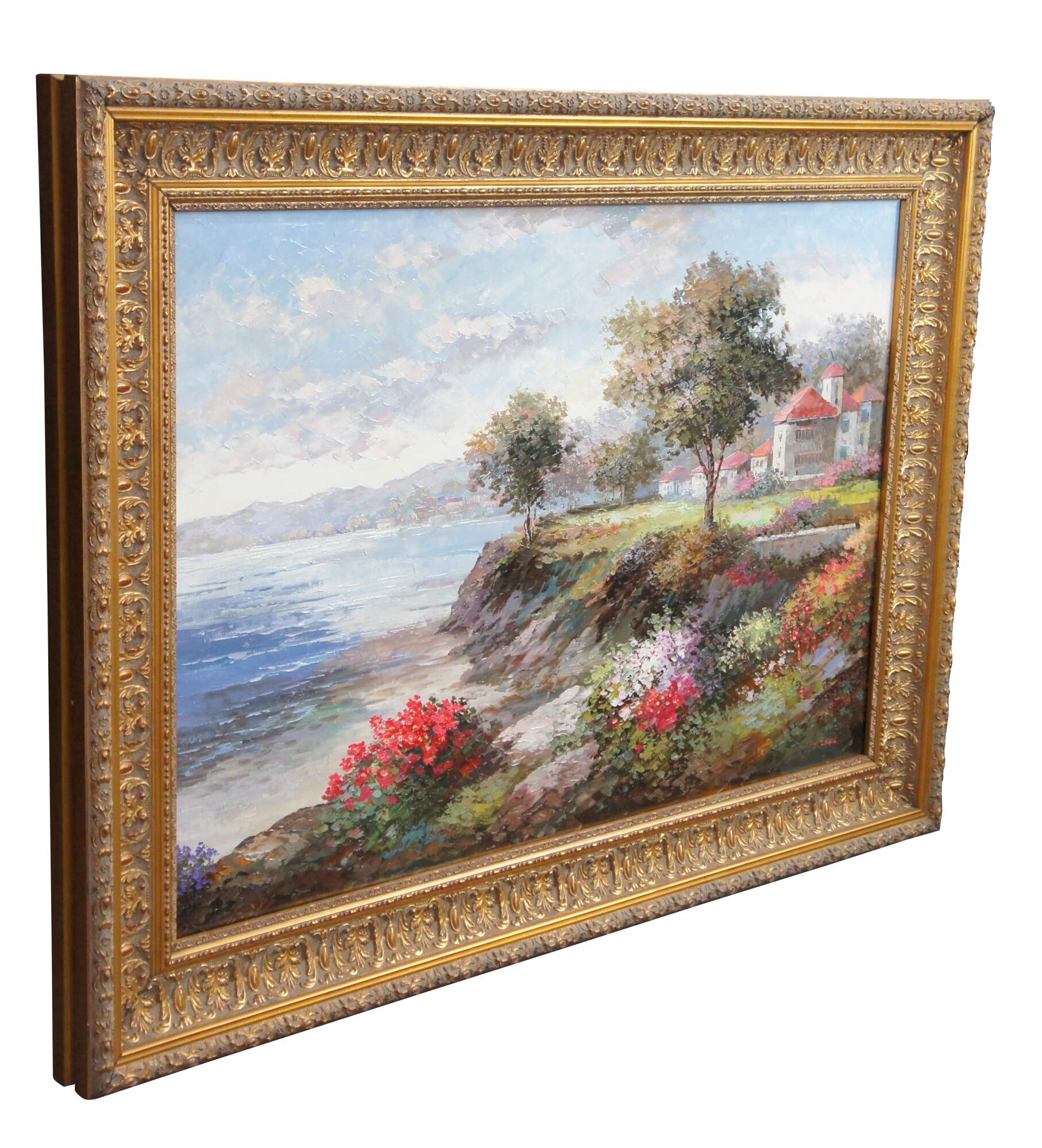 A late 20th Century Impressionist oil painting by P. Paul (American), canvas signed lower right. Features a charming oceanside Tuscan / Mediterranean villa on a calm afternoon. Beautiful flowers can be seen in bloom as the waves crash ashore. A well executed piece framed in a wooden neoclassical gold finished frame.